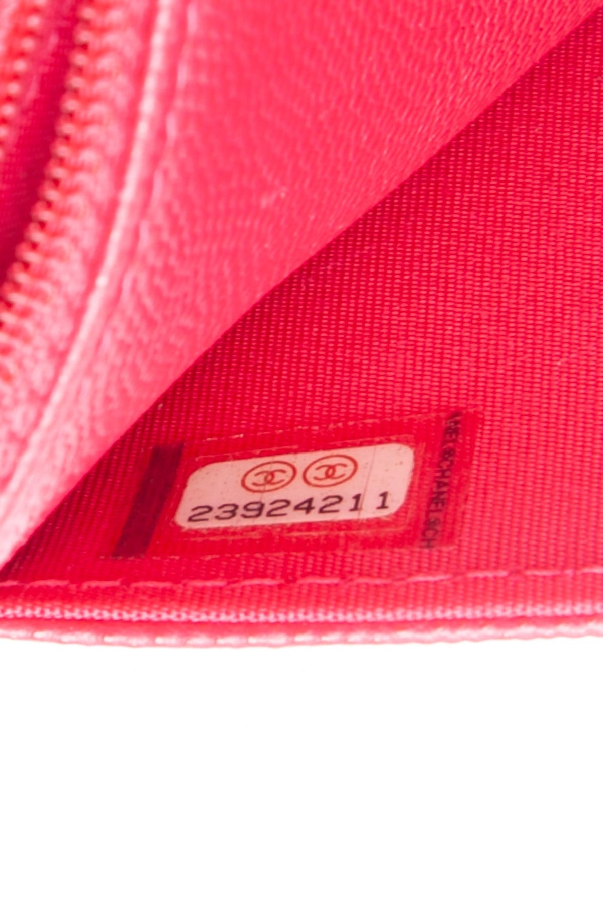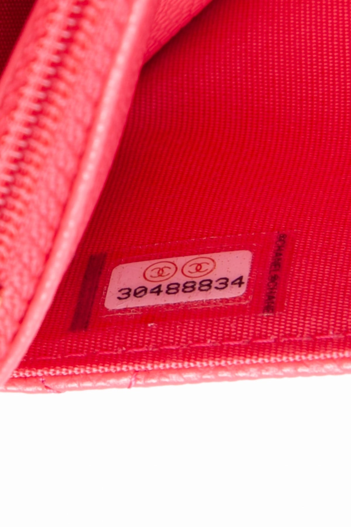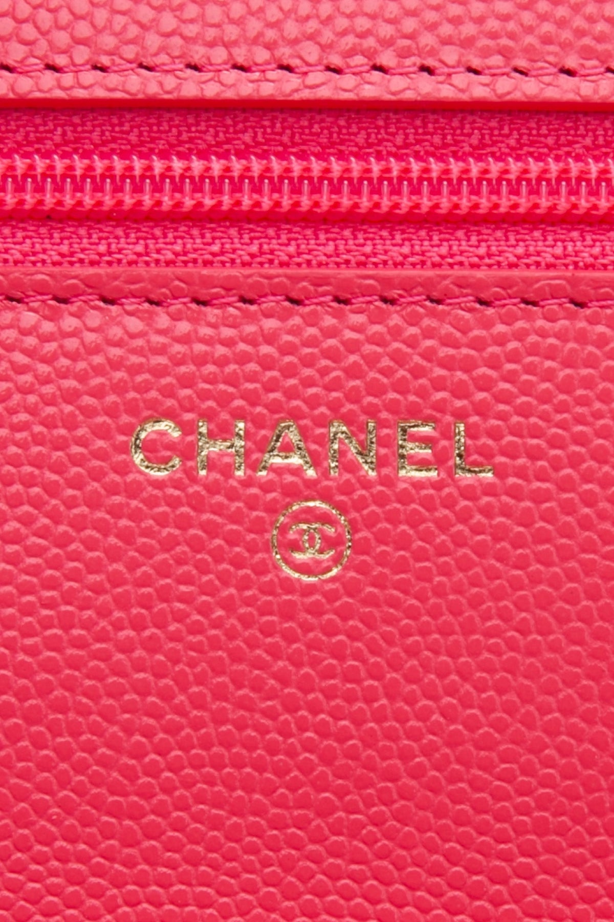 Regular price $2,120.00 Sale price $440.00 Save $1,680.00This stylish wallet is crafted of luxuriously textured diamond quilted caviar leather in pink. This shoulder bag features a polished gold chain-link crossbody strap and a polished gold Chanel CC logo on the facing flap with leather threaded through one C, and small gold chains threaded through the other. The bag opens to a pink fabric interior with a zipped compartment, card slots, a patch pocket and an additional pocket on the inside of the flap.