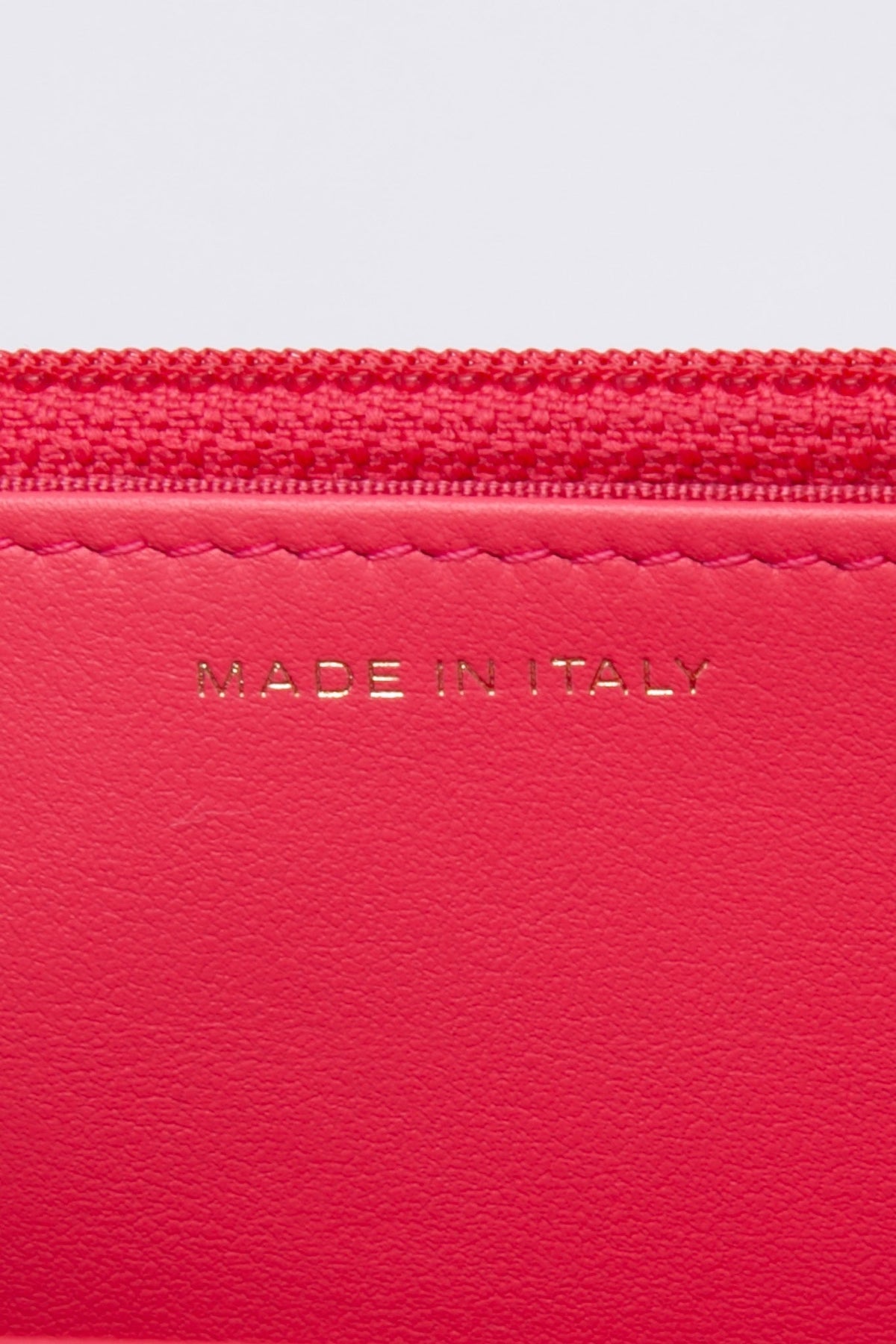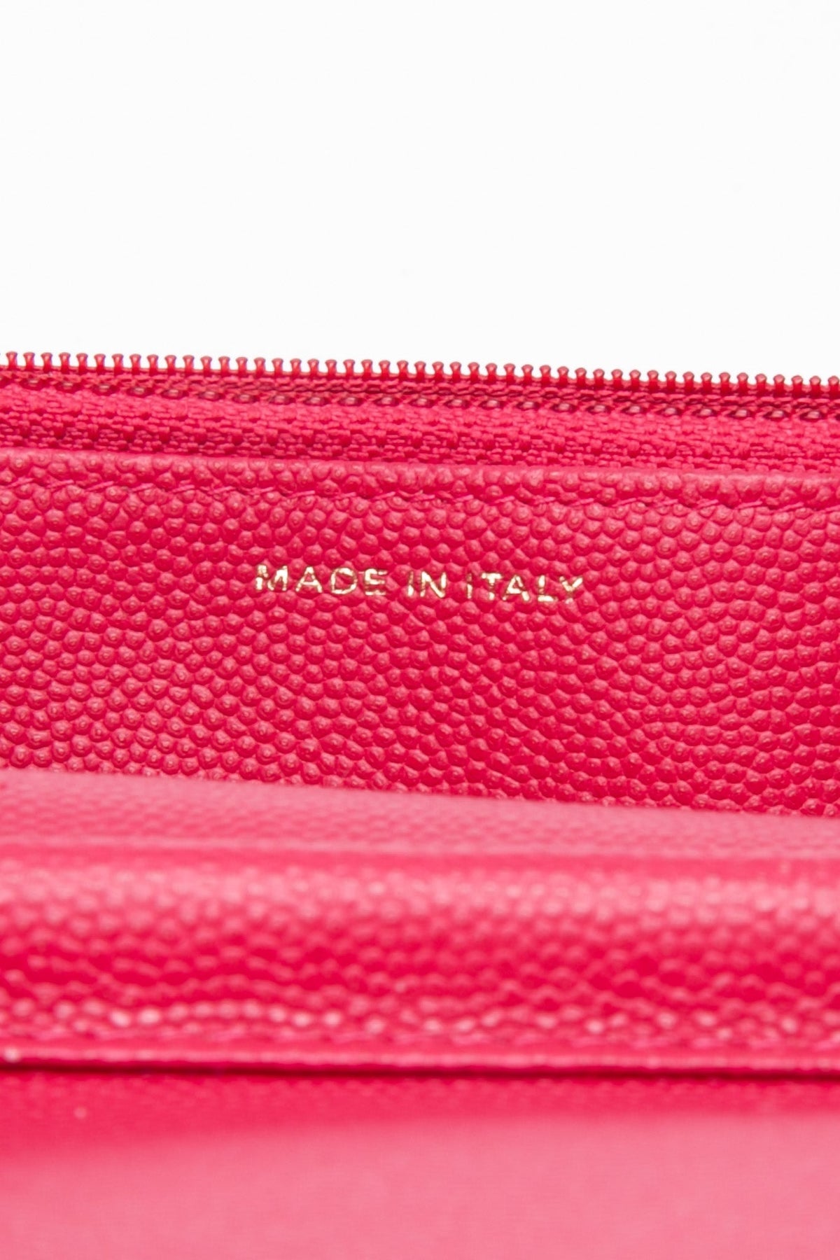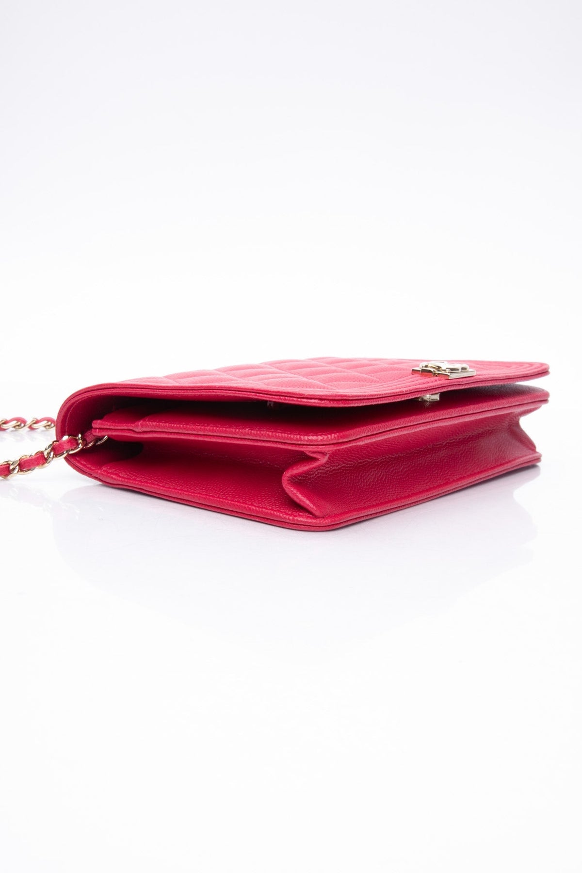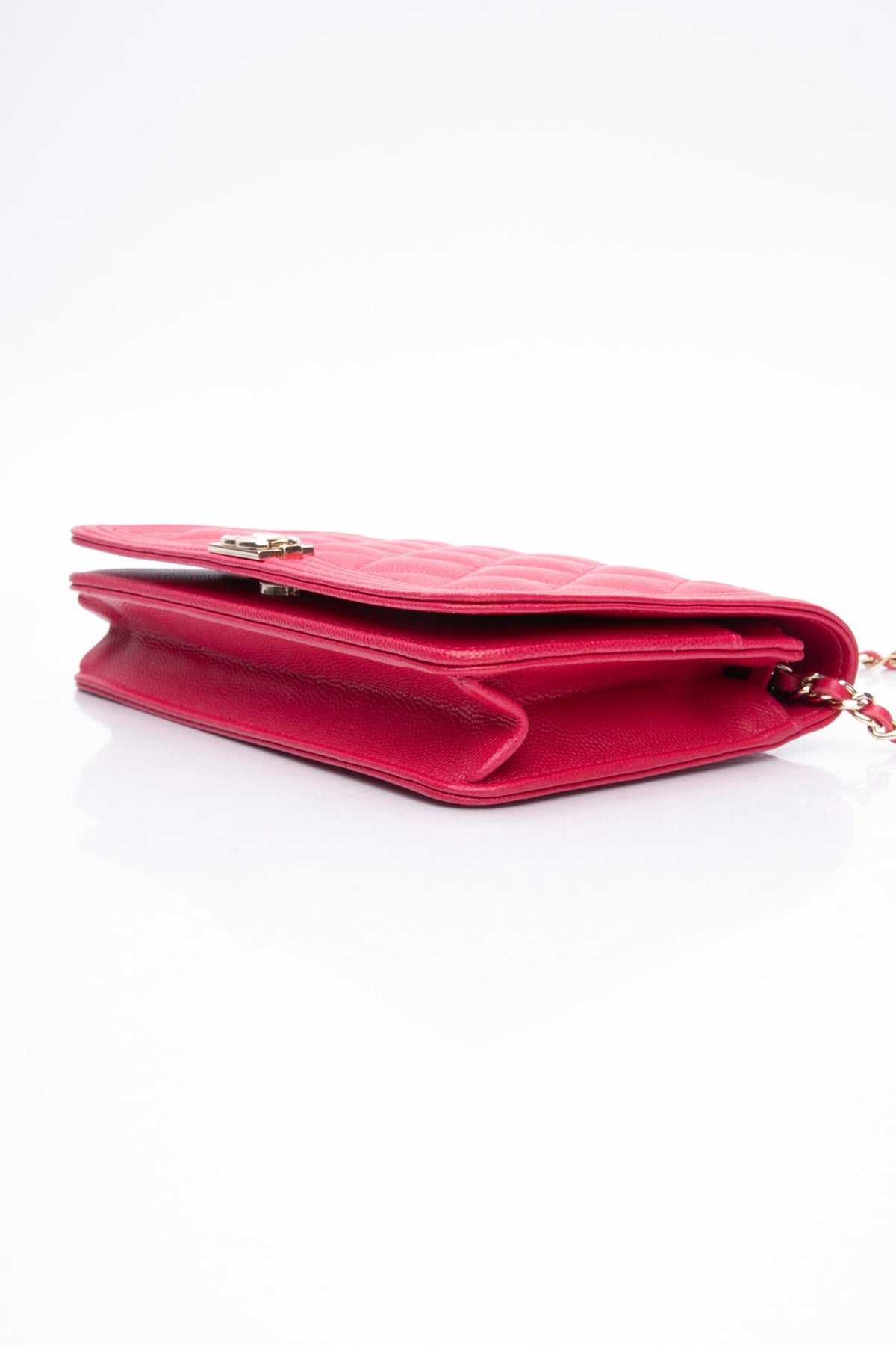 Regular price $2,120.00 Sale price $440.00 Save $1,680.00This stylish wallet is crafted of luxuriously textured diamond quilted caviar leather in pink. This shoulder bag features a polished gold chain-link crossbody strap and a polished gold Chanel CC logo on the facing flap with leather threaded through one C, and small gold chains threaded through the other. The bag opens to a pink fabric interior with a zipped compartment, card slots, a patch pocket and an additional pocket on the inside of the flap.