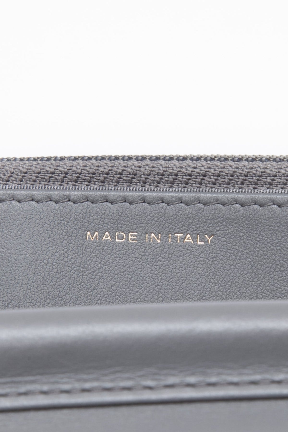 The interior is lined in a black fabric with one zip pocket and one slip pocket on the rear wall.