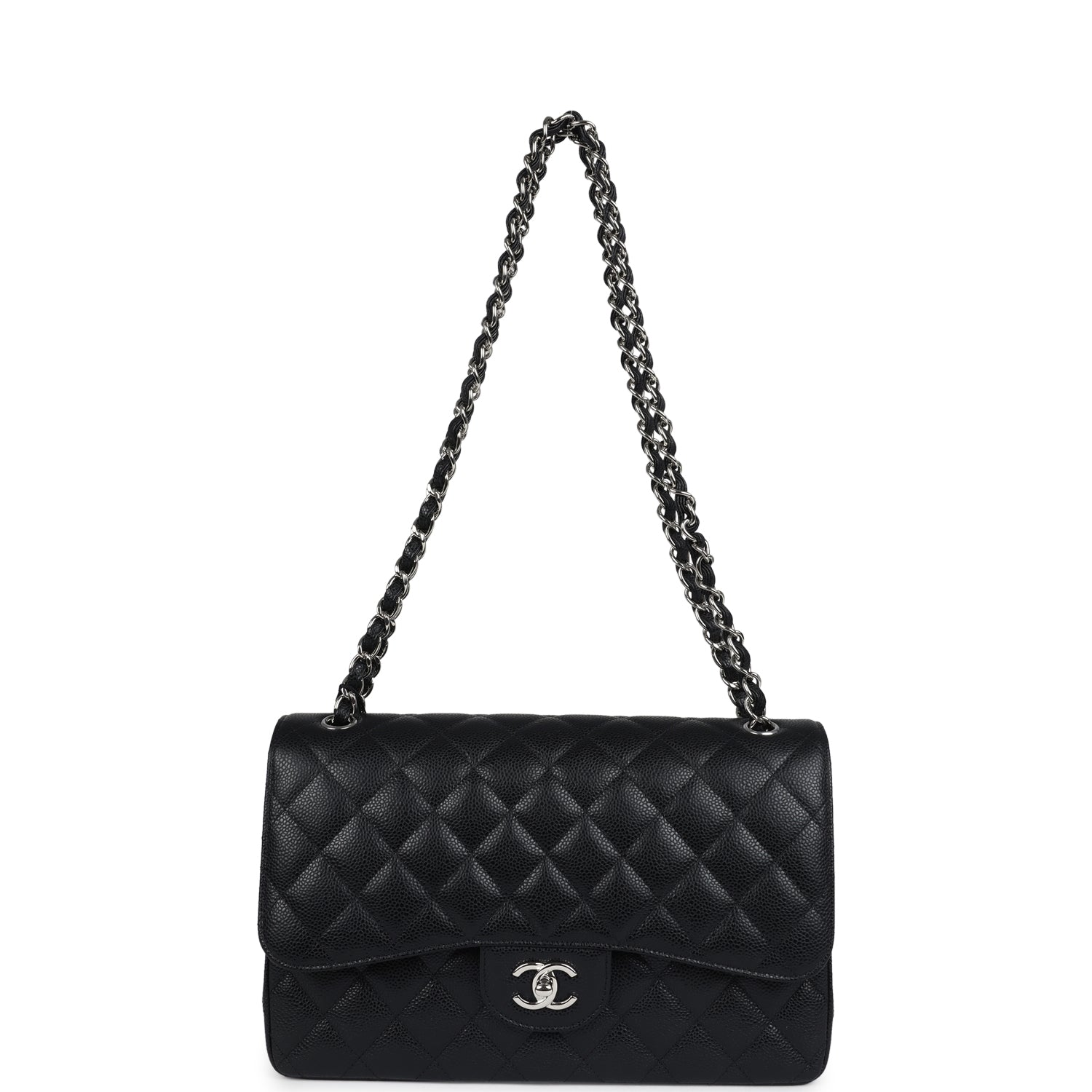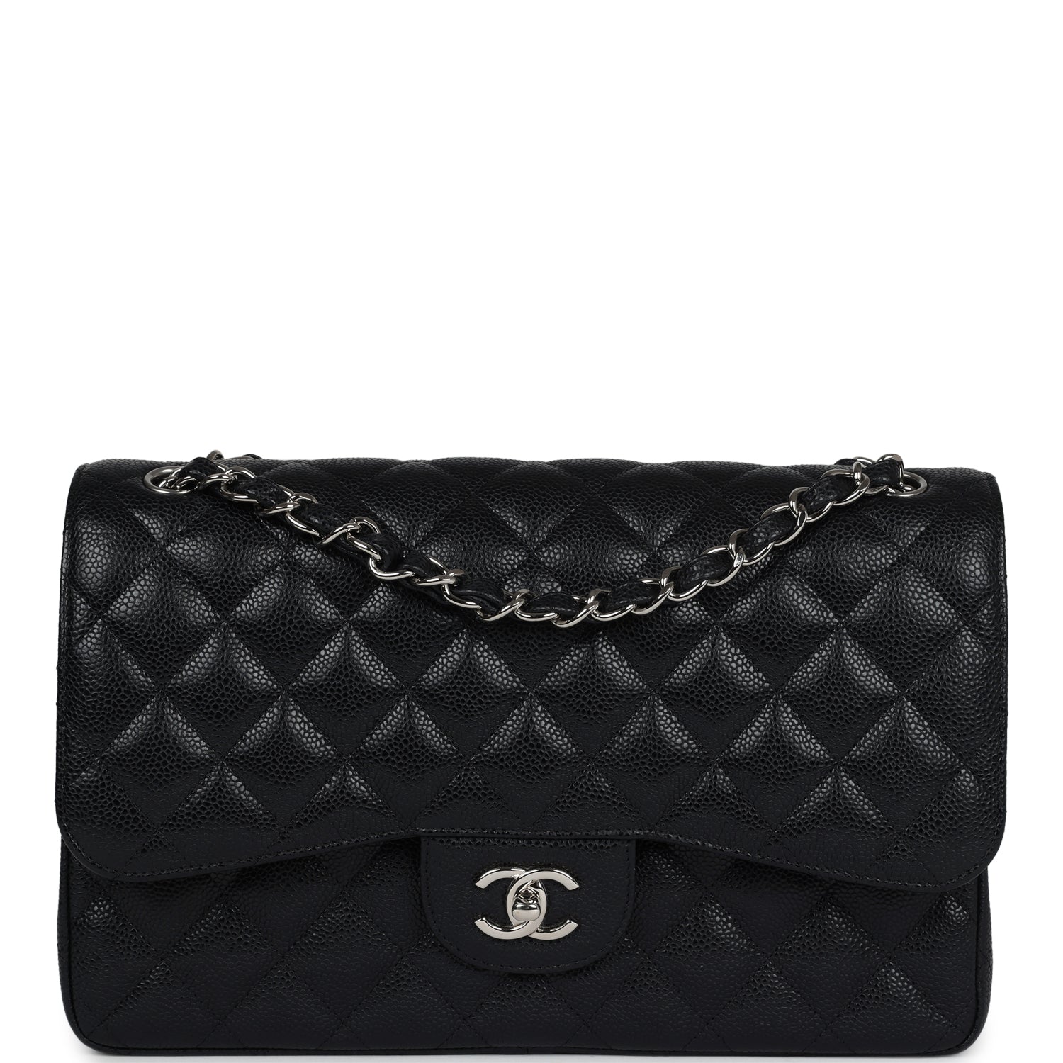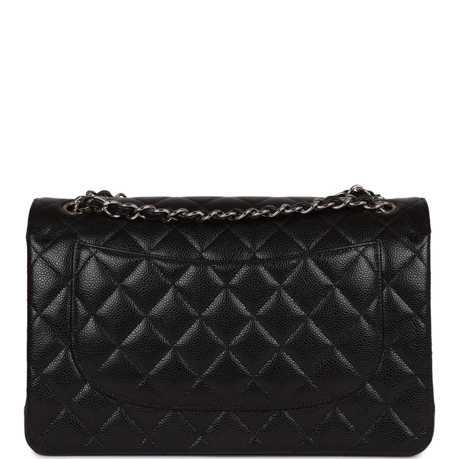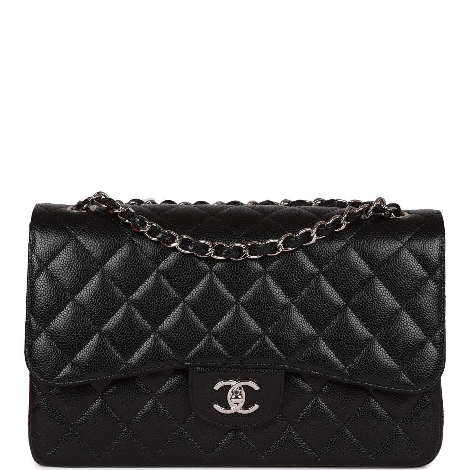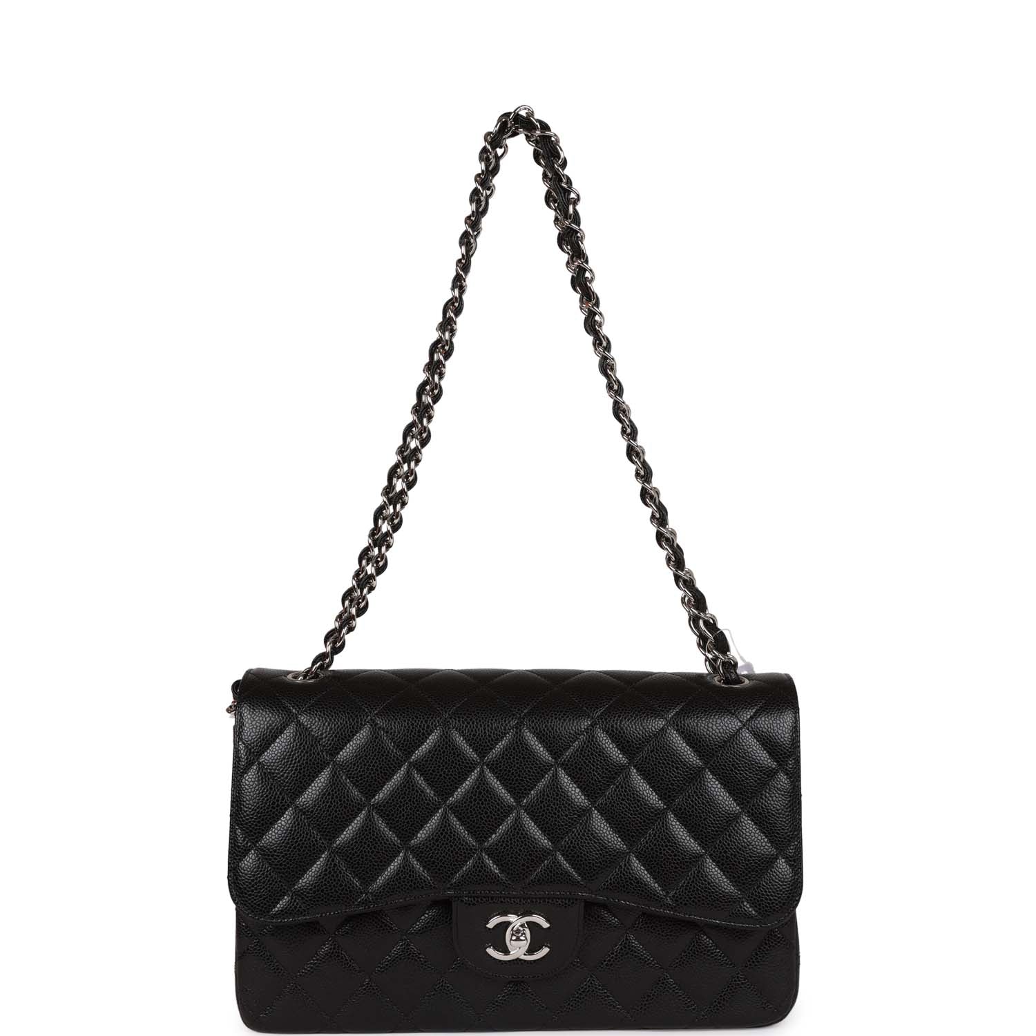 Regular price $2,330.00 Sale price $450.00 Save $1,880.00This Jumbo Classic Double Flap bag is in black caviar leather with silver tone hardware and features a front flap with signature CC turnlock closure, half moon back pocket, and adjustable interwoven silver tone chain link and black leather shoulder strap.