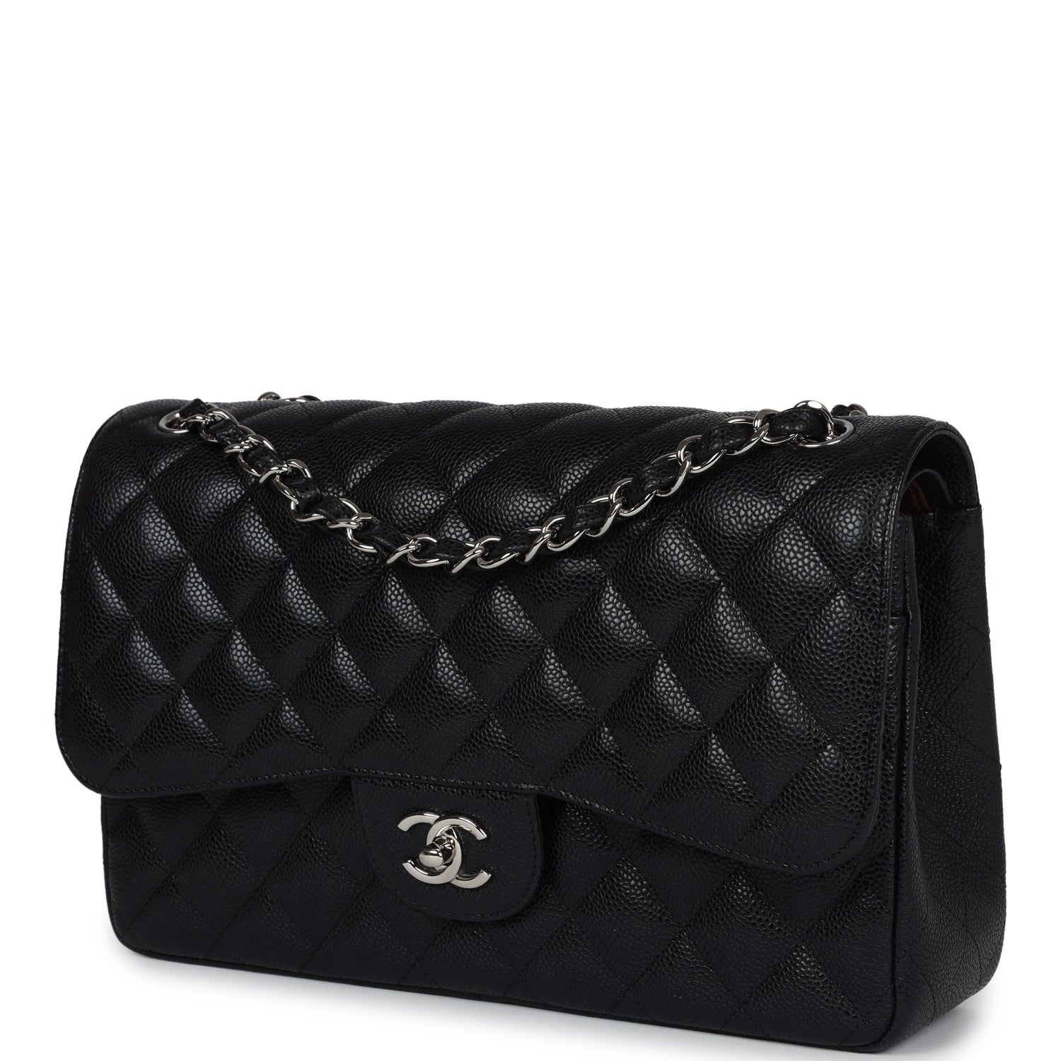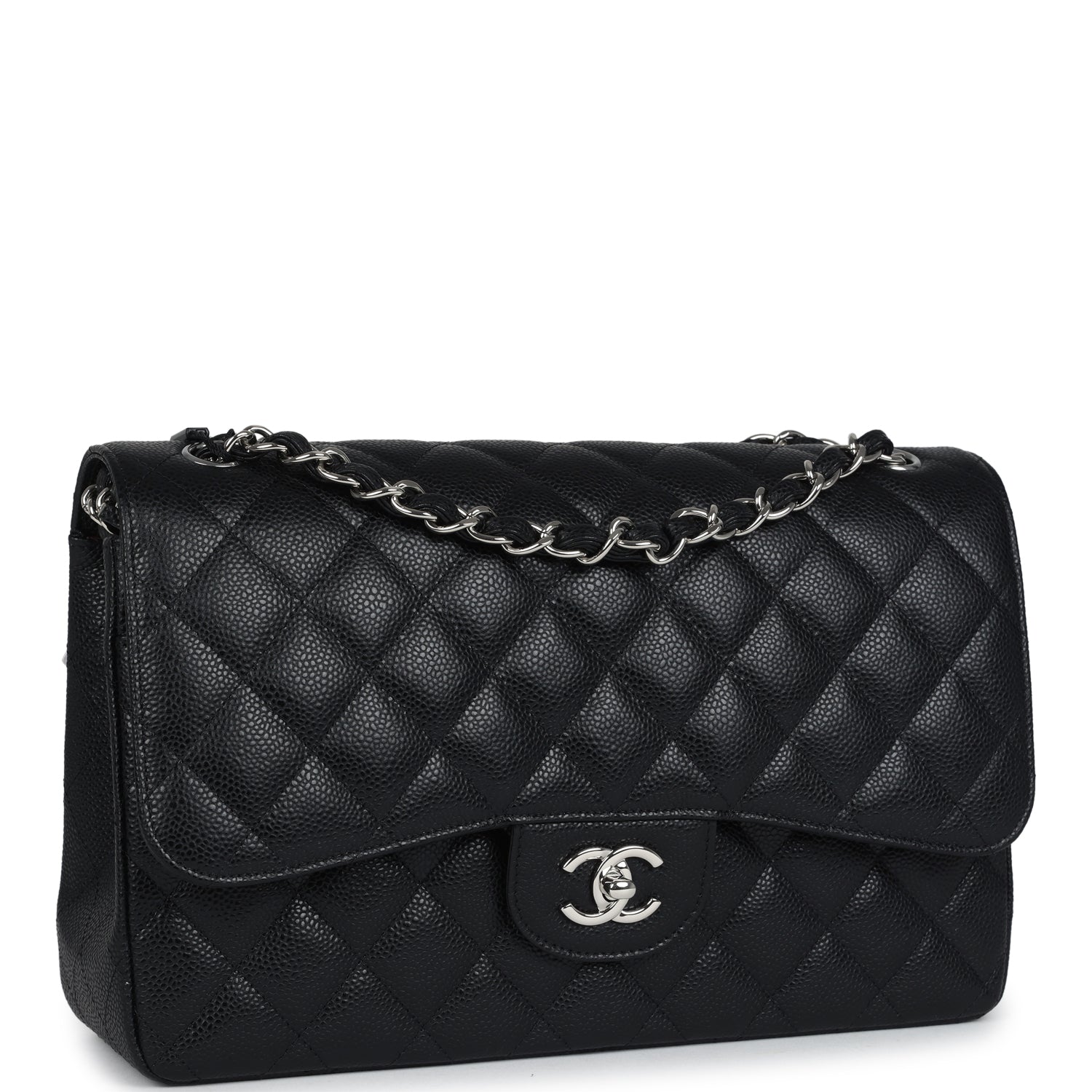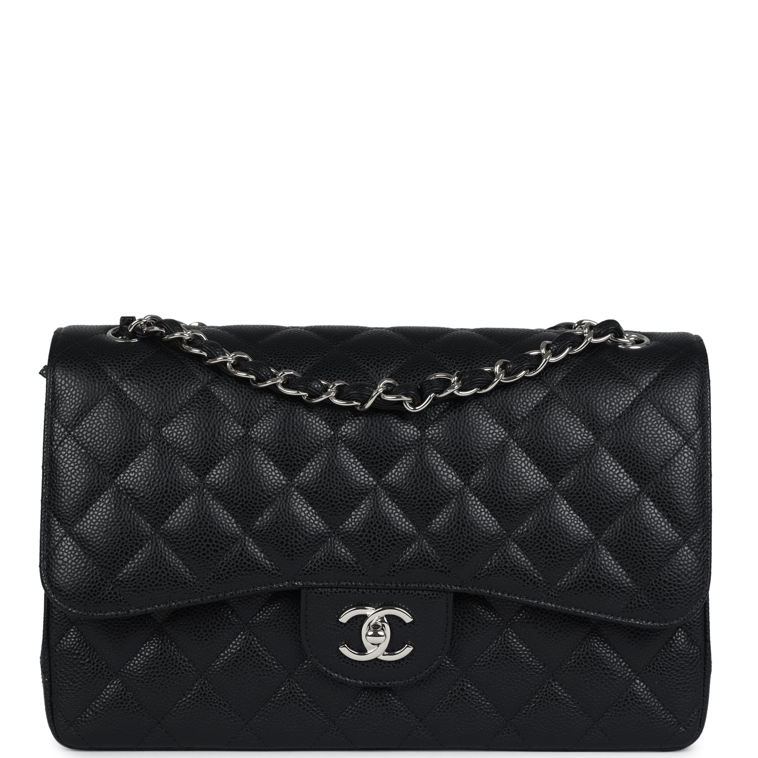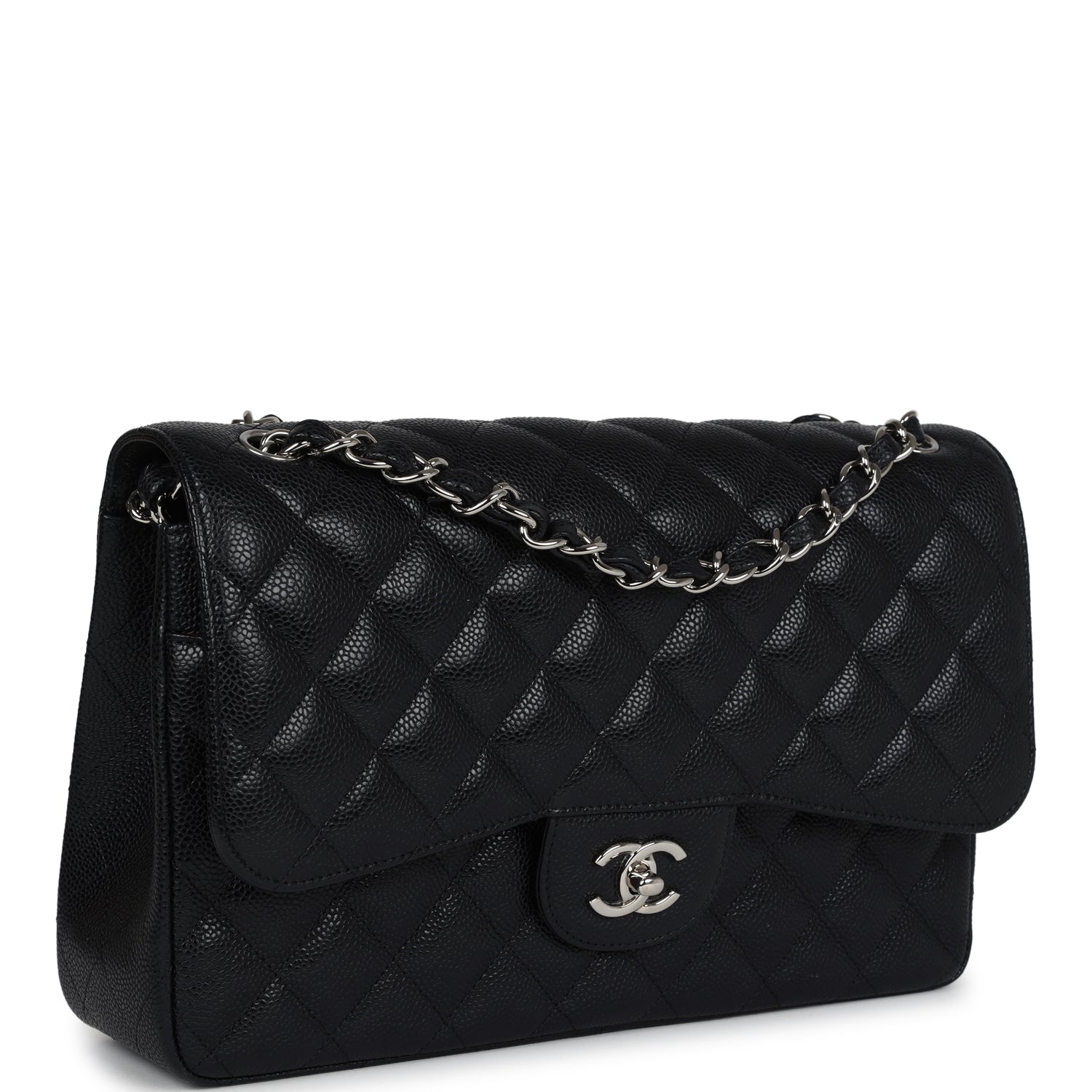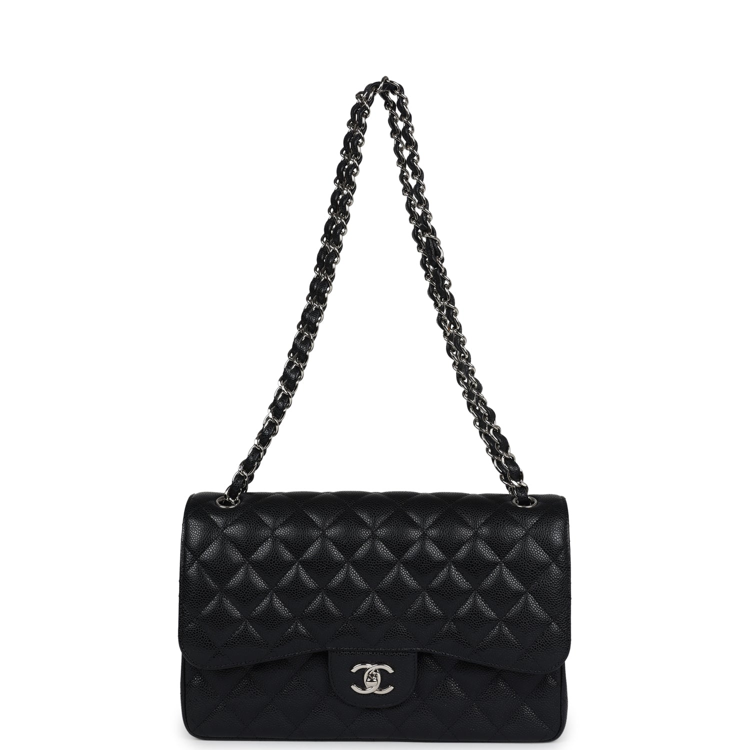 Regular price $2,330.00 Sale price $450.00 Save $1,880.00This Jumbo Classic Double Flap bag is in black caviar leather with silver tone hardware and features a front flap with signature CC turnlock closure, half moon back pocket, and adjustable interwoven silver tone chain link and black leather shoulder strap.