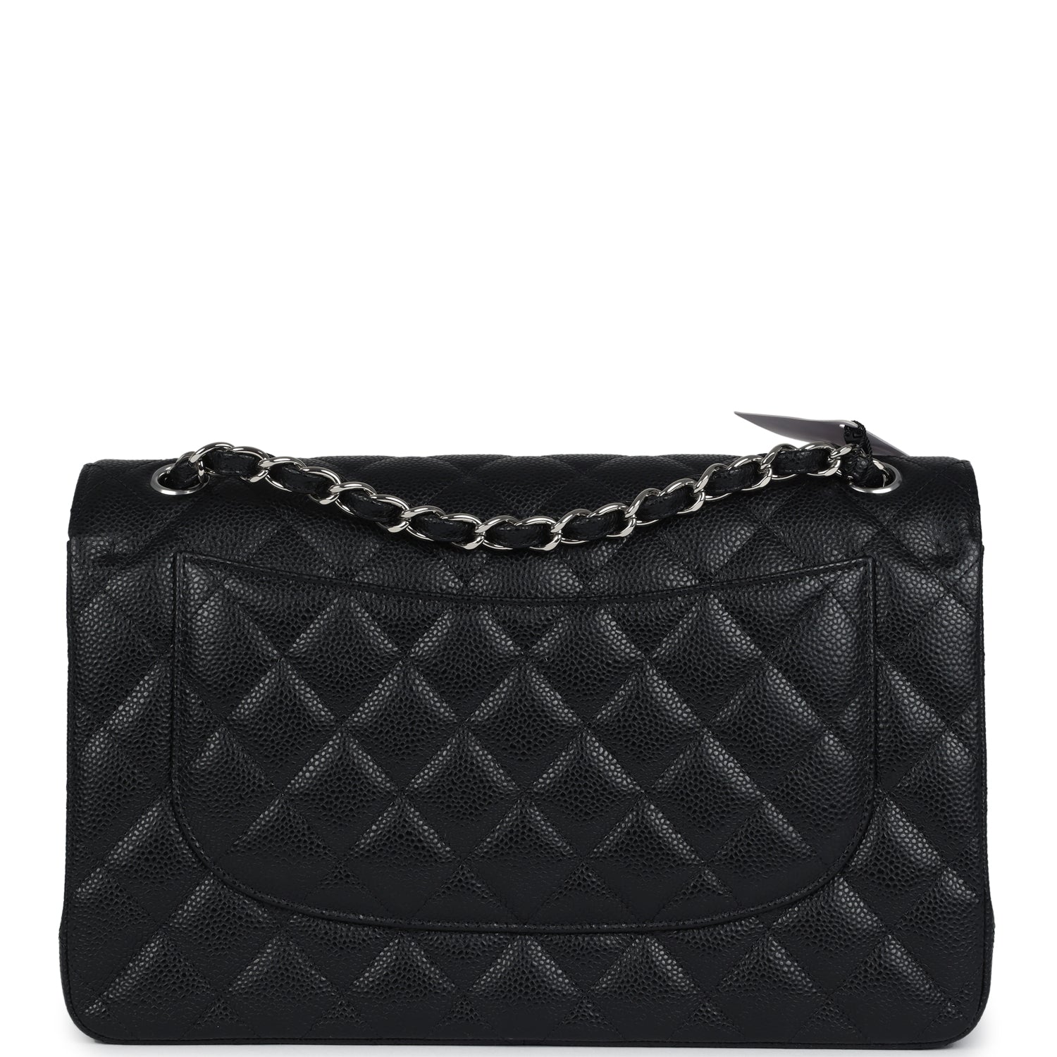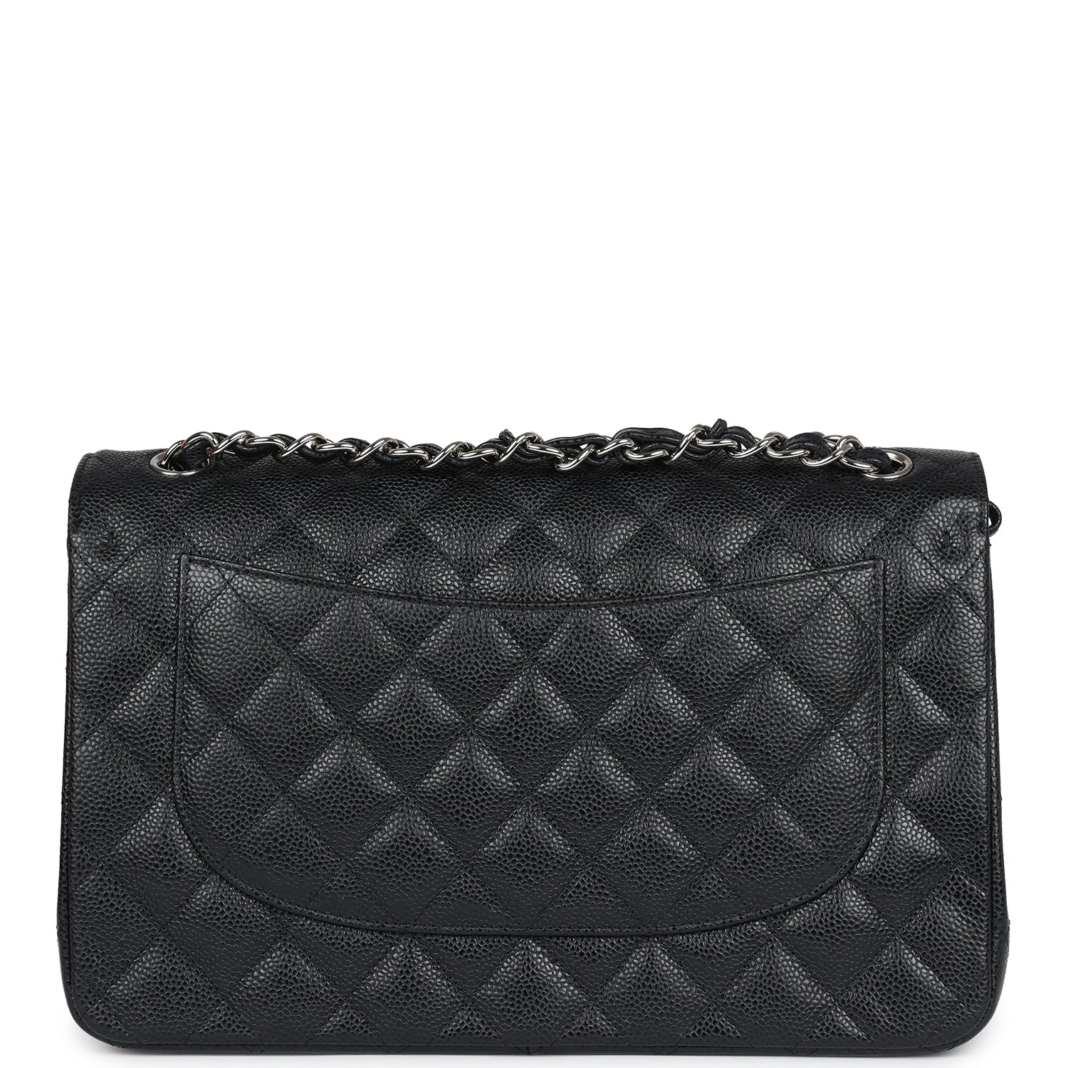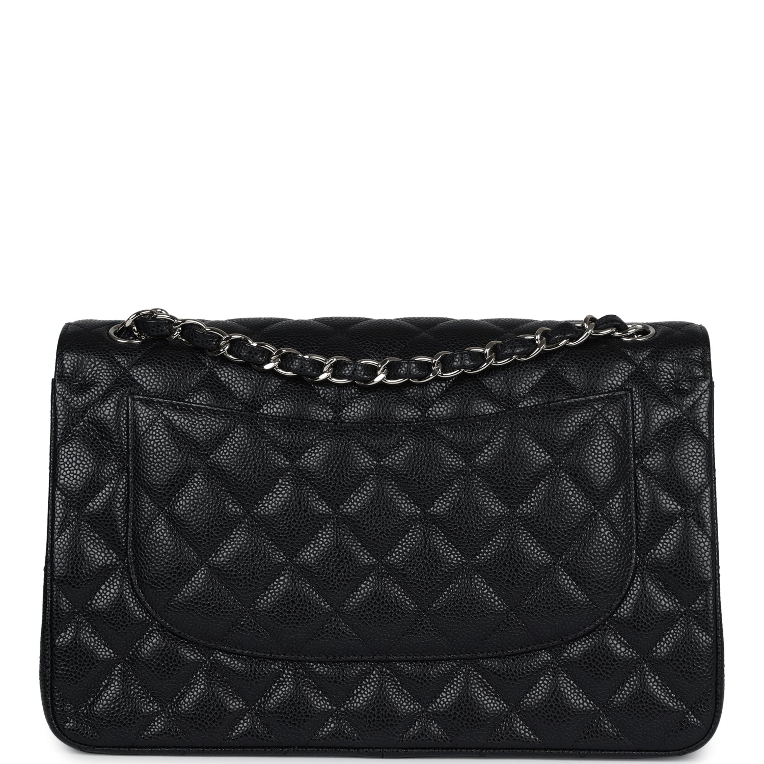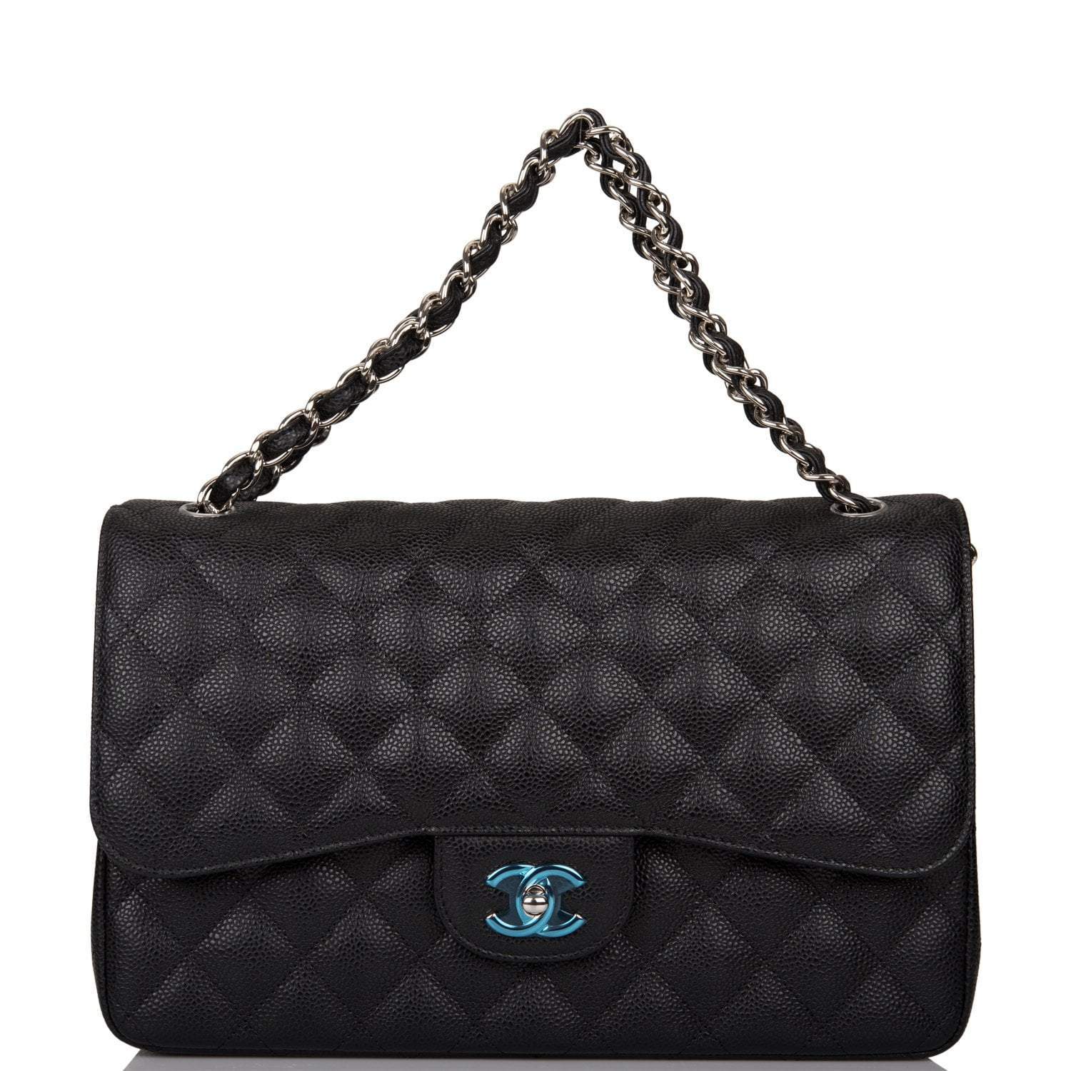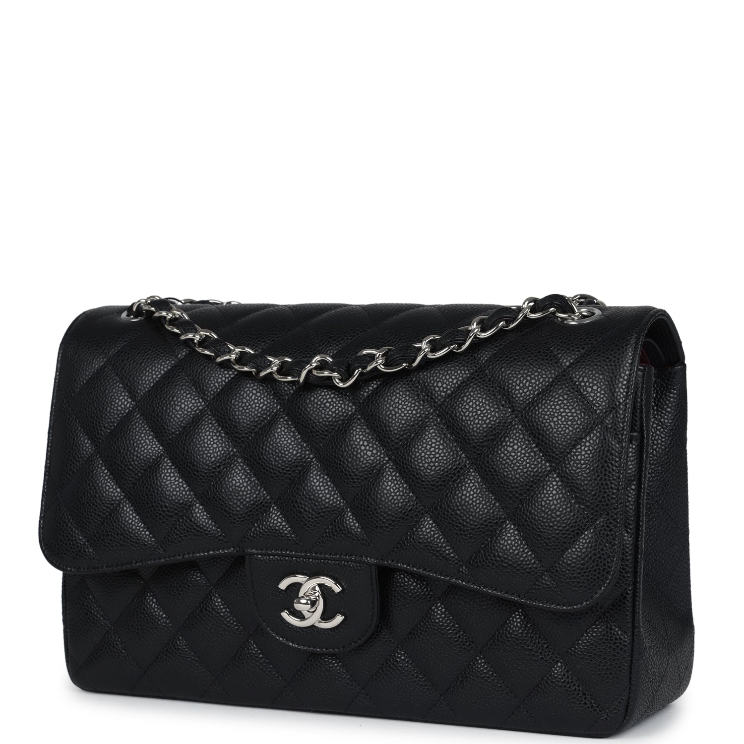 Regular price $2,330.00 Sale price $450.00 Save $1,880.00This Jumbo Classic Double Flap bag is in black caviar leather with silver tone hardware and features a front flap with signature CC turnlock closure, half moon back pocket, and adjustable interwoven silver tone chain link and black leather shoulder strap.