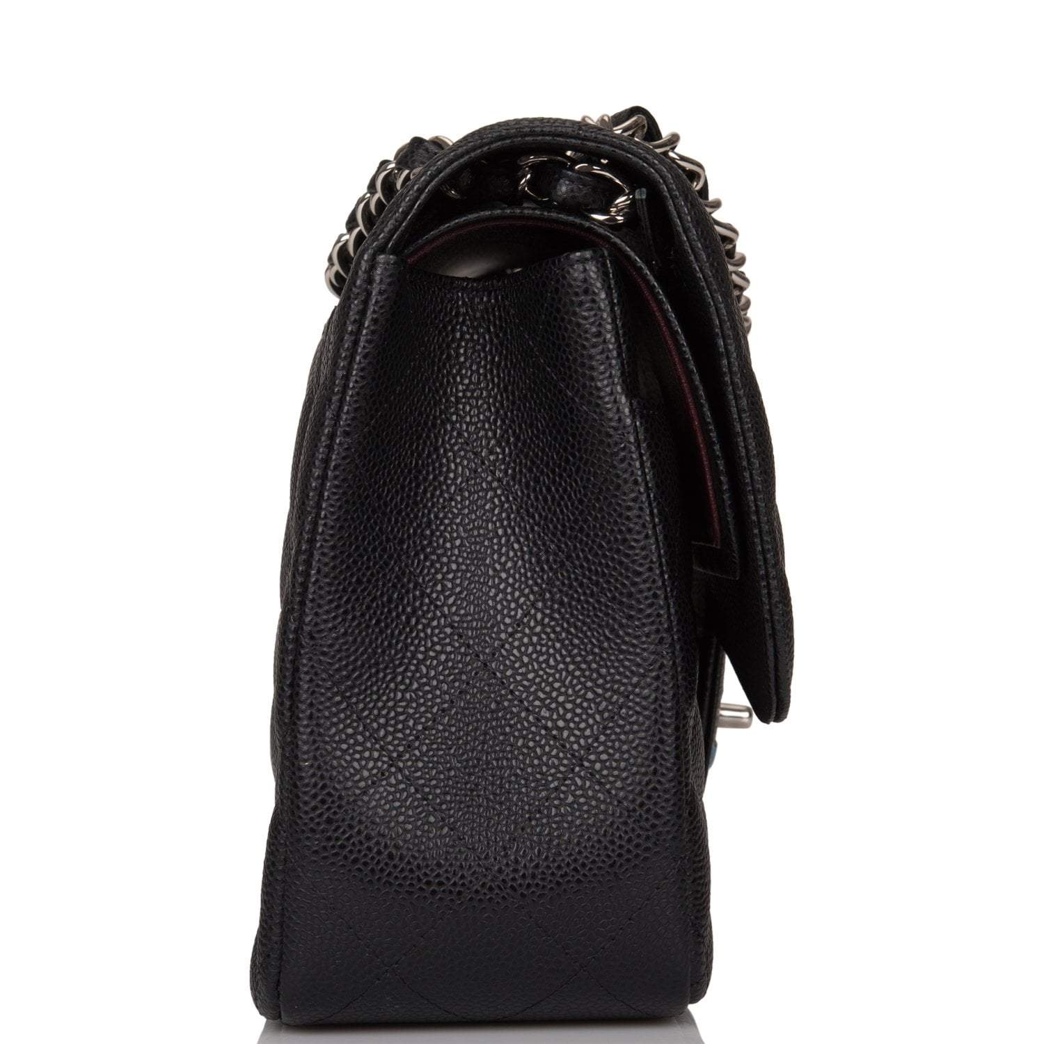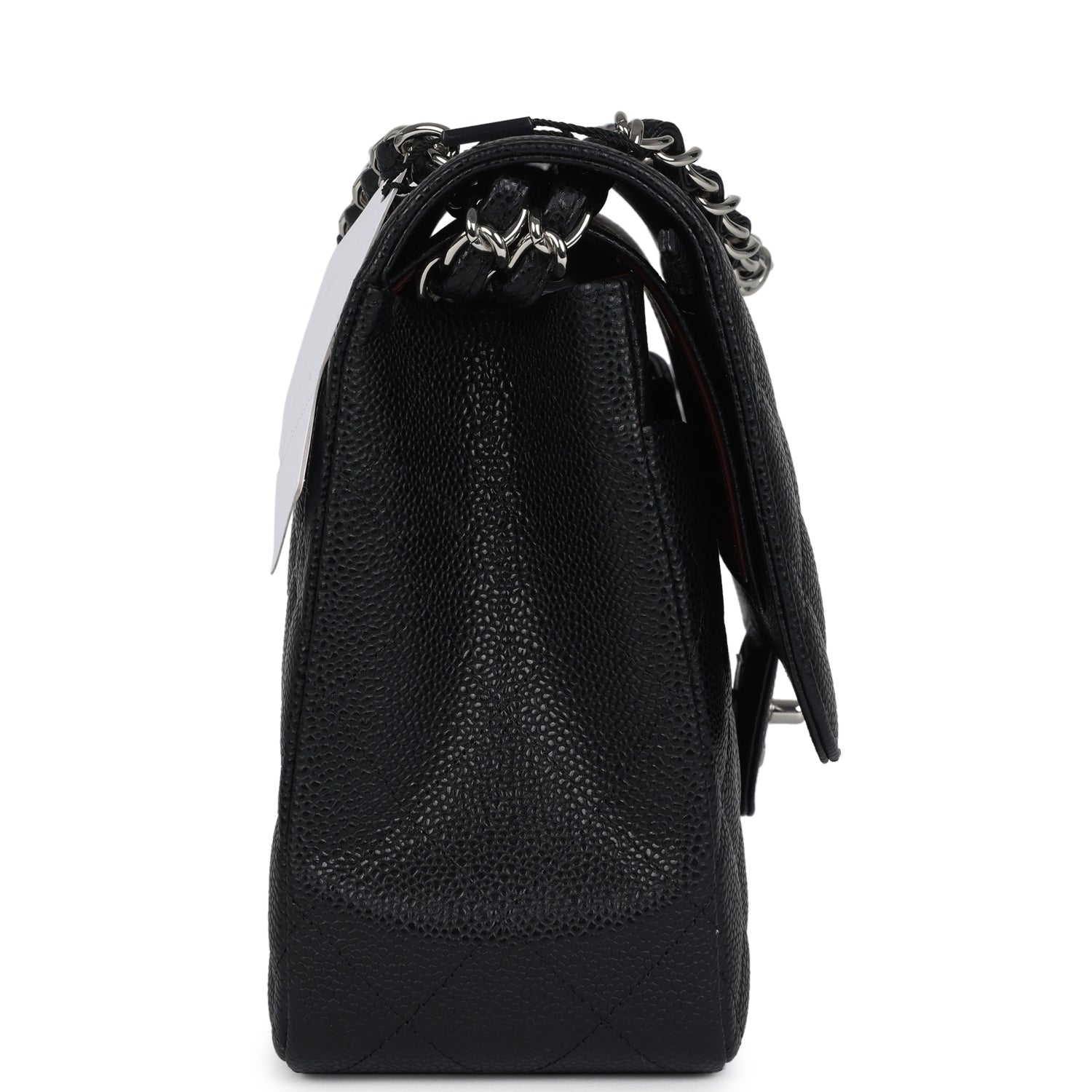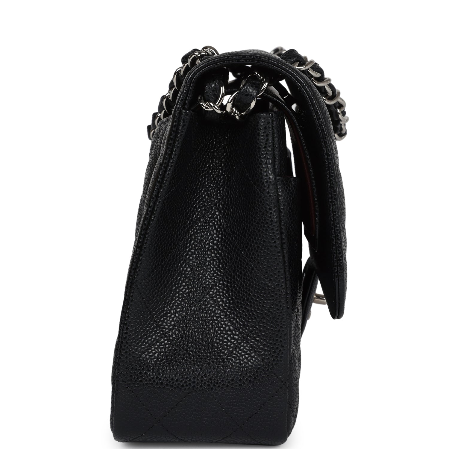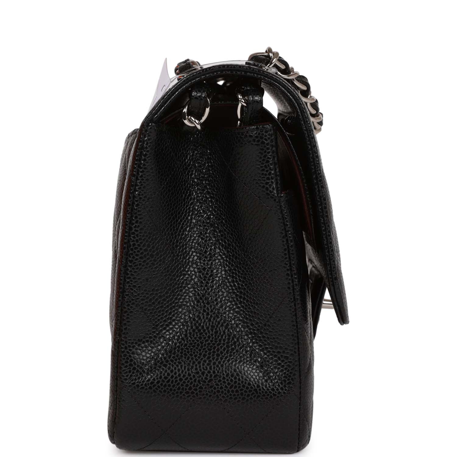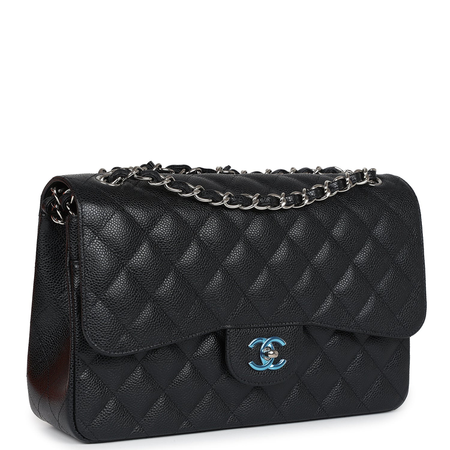 Regular price $2,330.00 Sale price $450.00 Save $1,880.00This Jumbo Classic Double Flap bag is in black caviar leather with silver tone hardware and features a front flap with signature CC turnlock closure, half moon back pocket, and adjustable interwoven silver tone chain link and black leather shoulder strap.