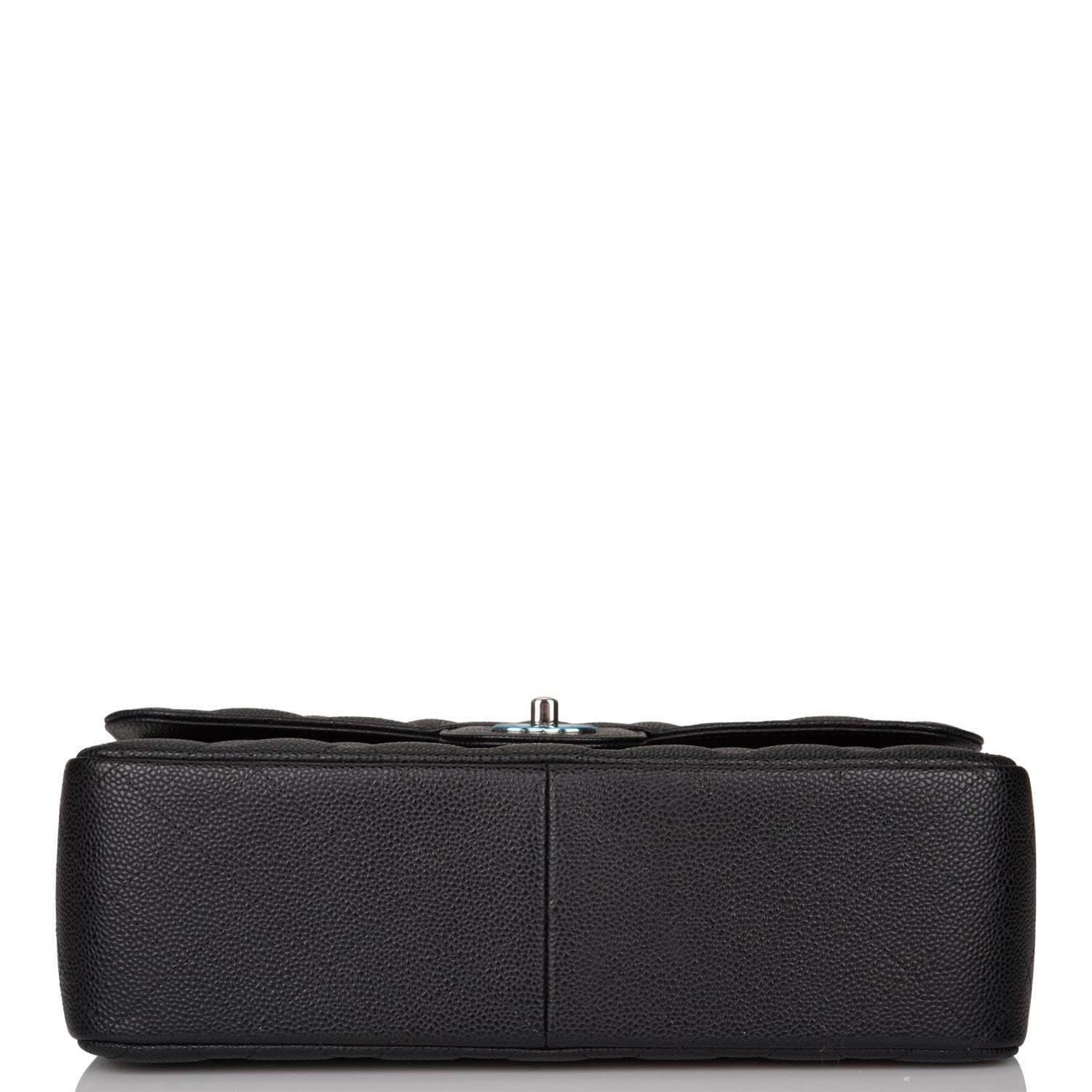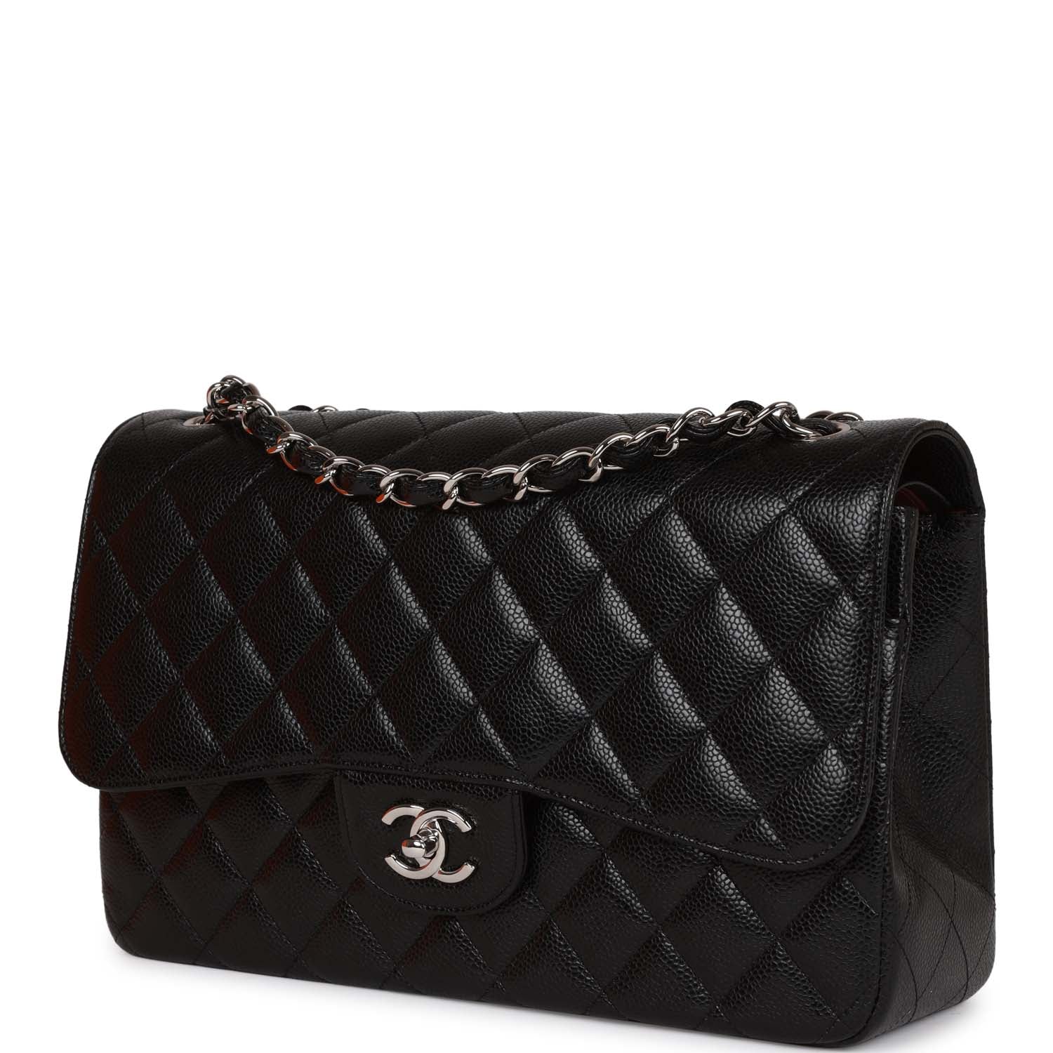 Regular price $1,129.62 Sale price $677.77 Save $451.85This Jumbo Classic Double Flap bag is in black caviar leather with silver tone hardware and features a front flap with signature CC turn lock closure, half moon back pocket, and adjustable interwoven silver tone chain link and black leather shoulder strap.