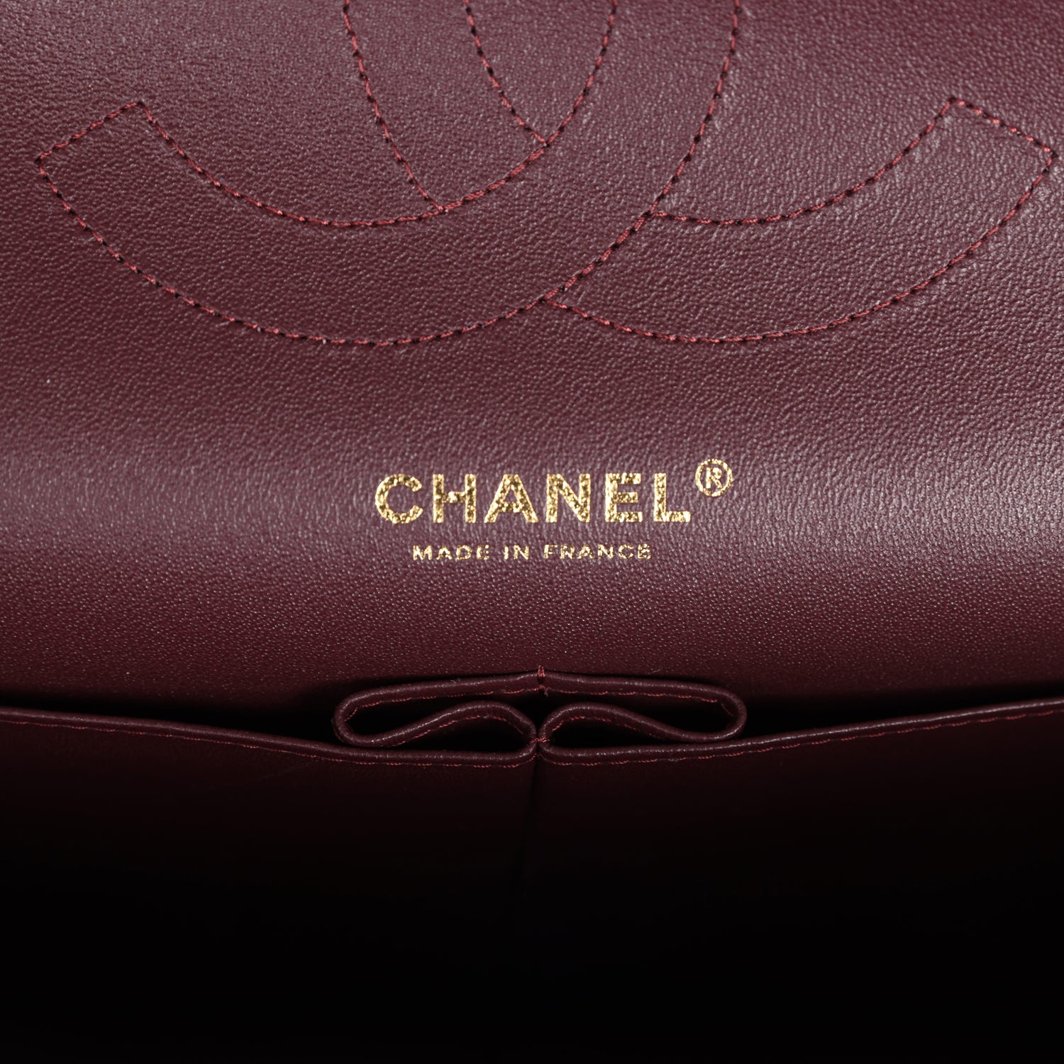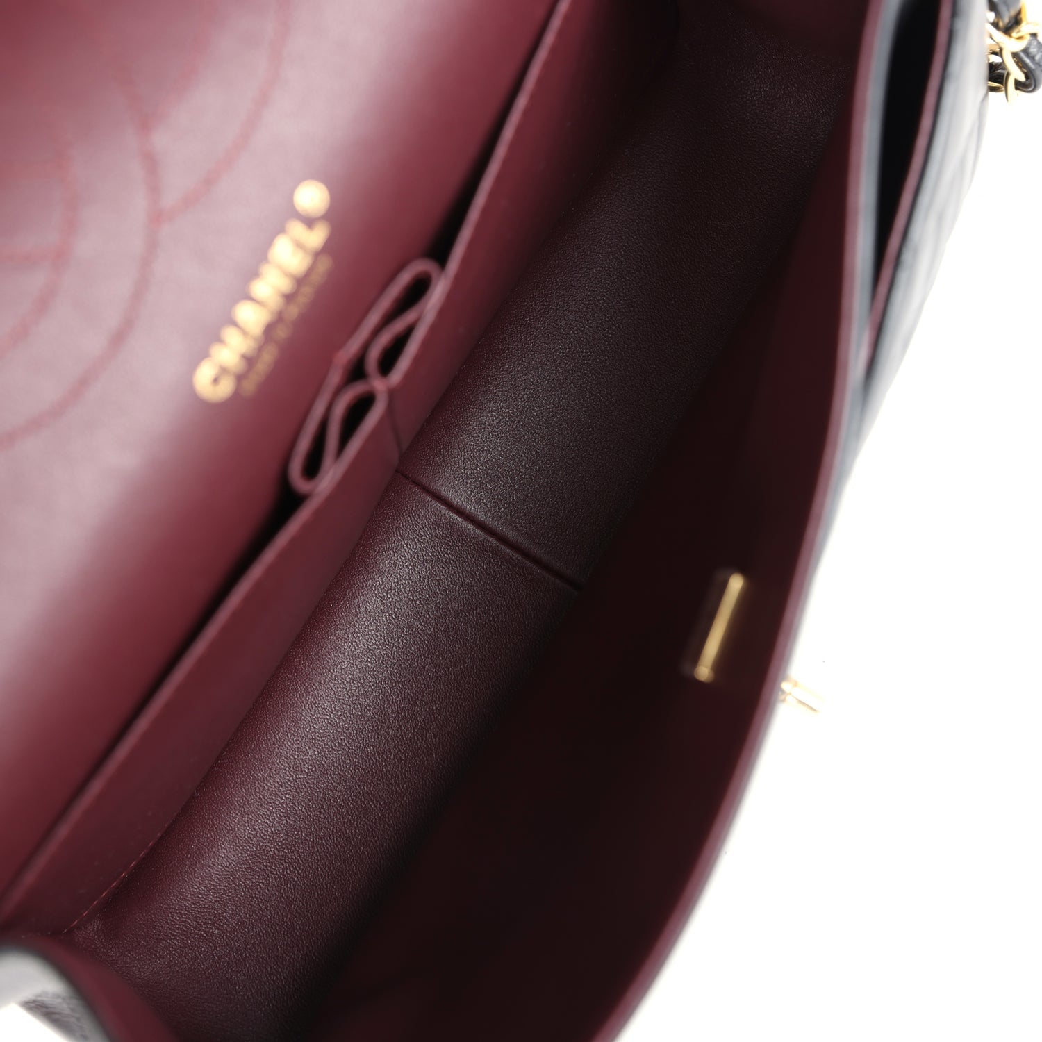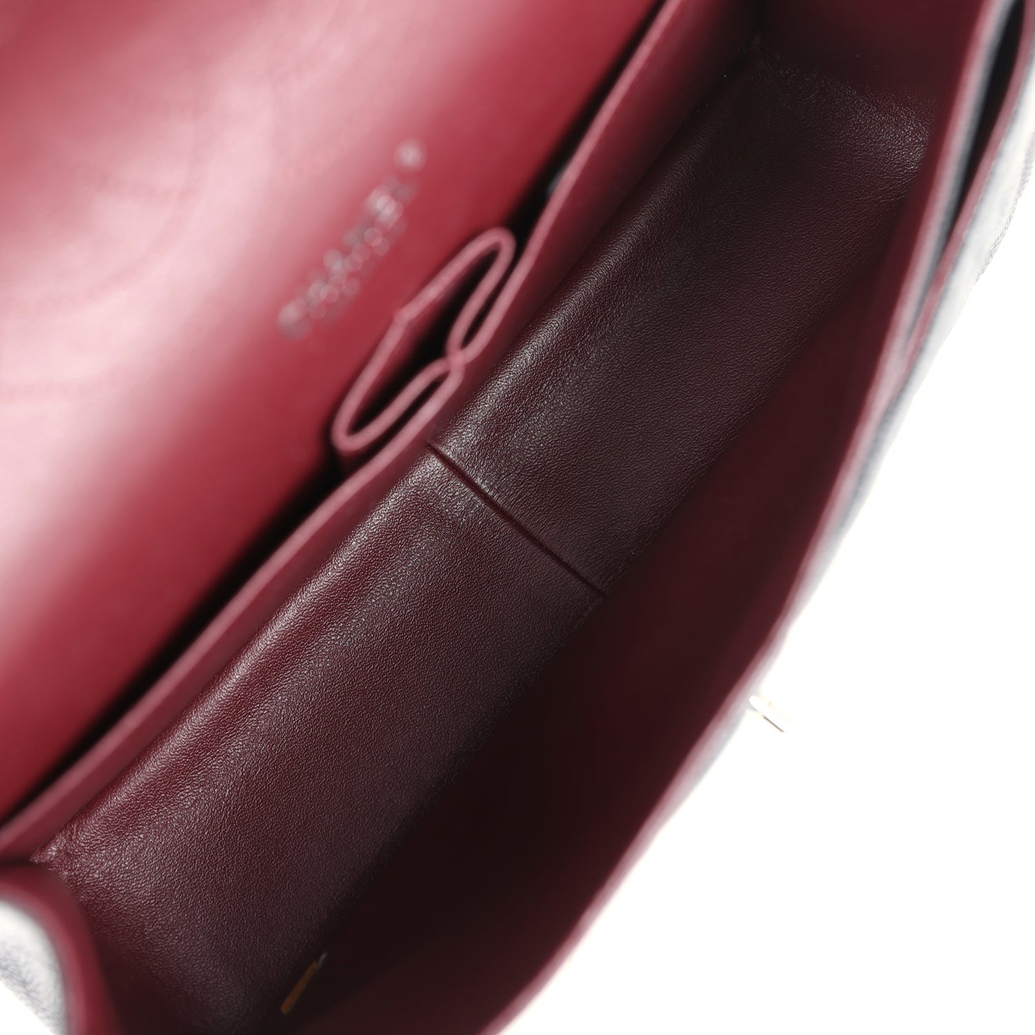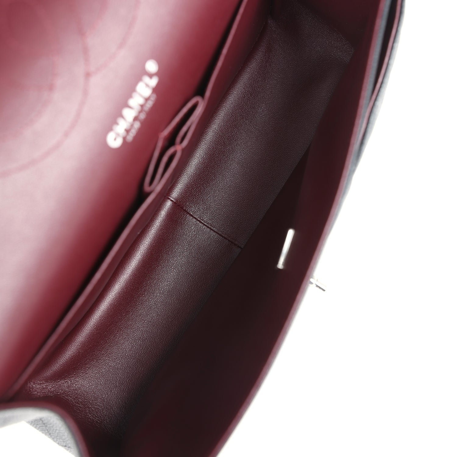 Regular price $1,630.00 Sale price $450.00 Save $1,180.00This Jumbo Classic Double Flap bag is in dark burgundy shiny grained calfskin leather with gold tone hardware and features a front flap with signature CC turnlock closure, half moon back pocket, and adjustable interwoven gold tone chainlink and dark burgundy leather shoulder strap.