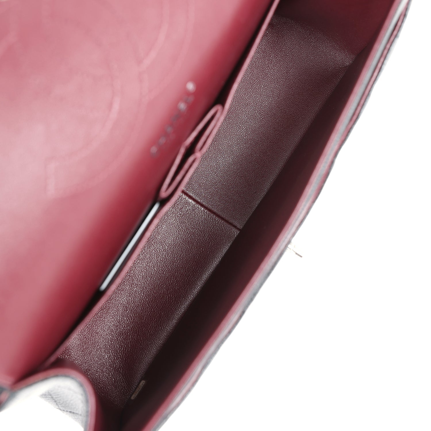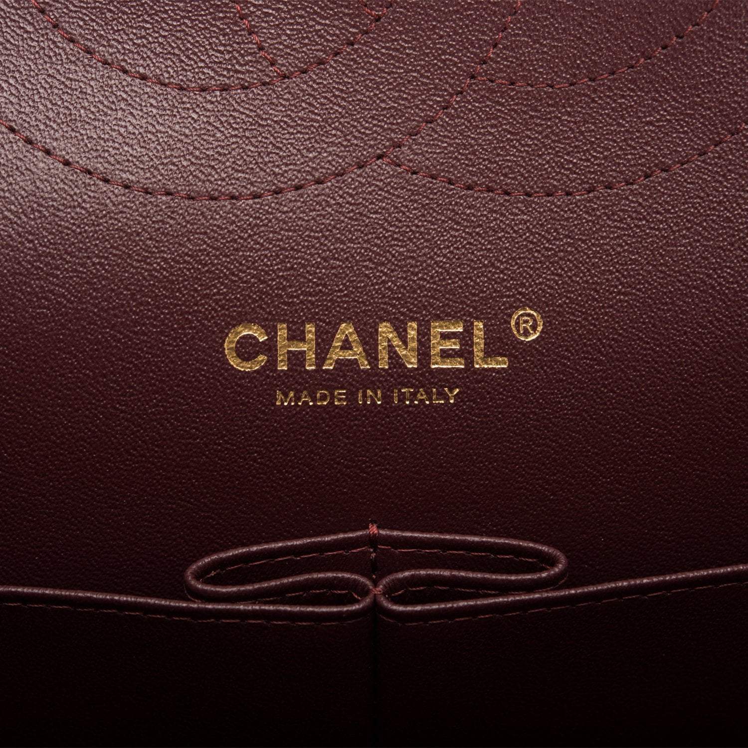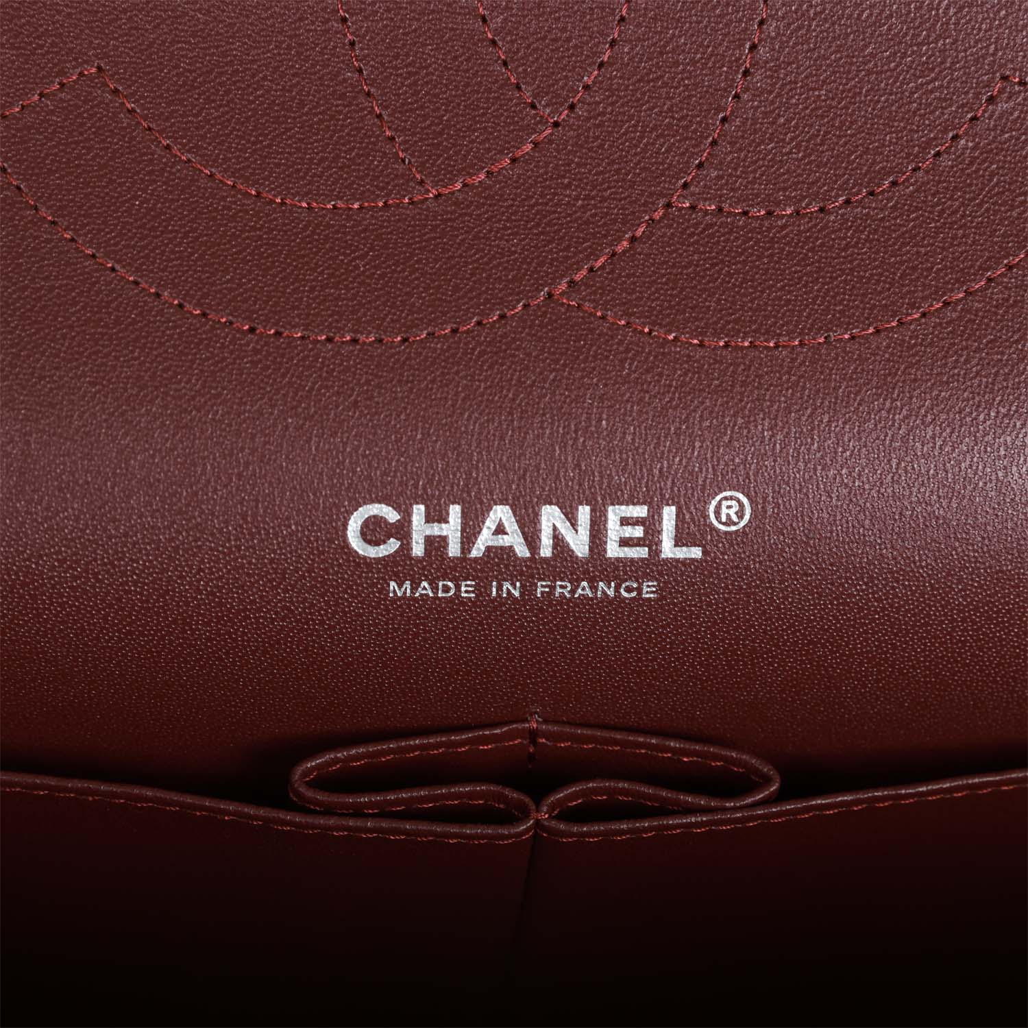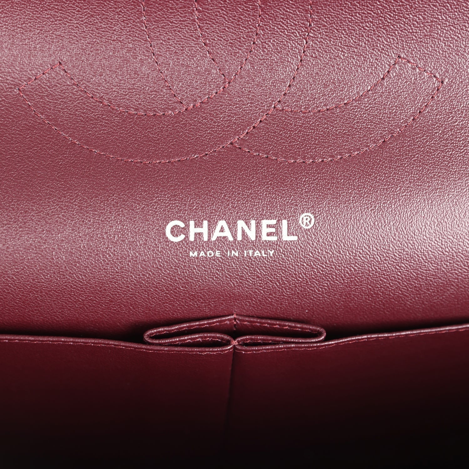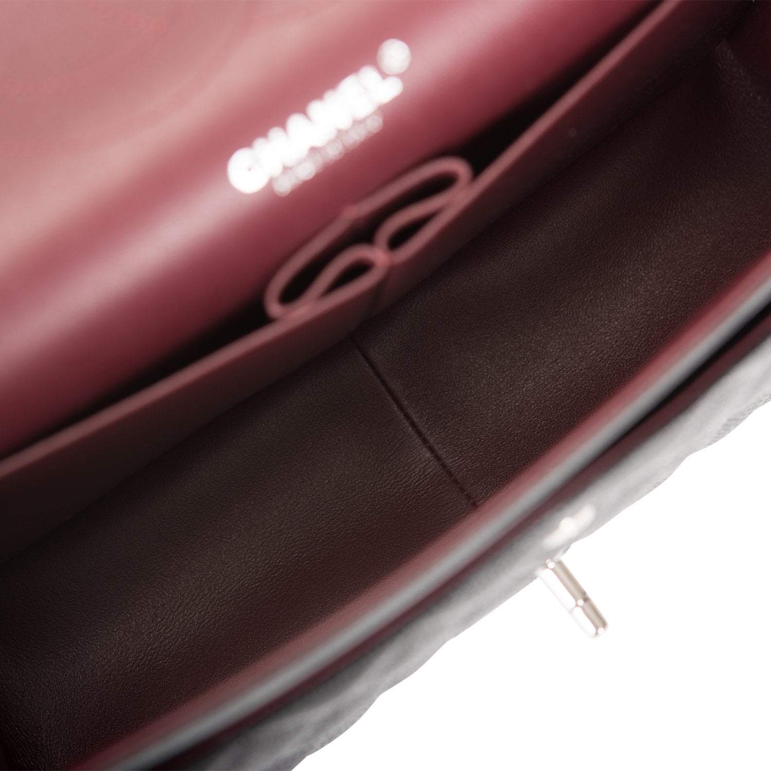 Regular price $1,630.00 Sale price $450.00 Save $1,180.00This Jumbo Classic Double Flap bag is in dark burgundy shiny grained calfskin leather with gold tone hardware and features a front flap with signature CC turnlock closure, half moon back pocket, and adjustable interwoven gold tone chainlink and dark burgundy leather shoulder strap.