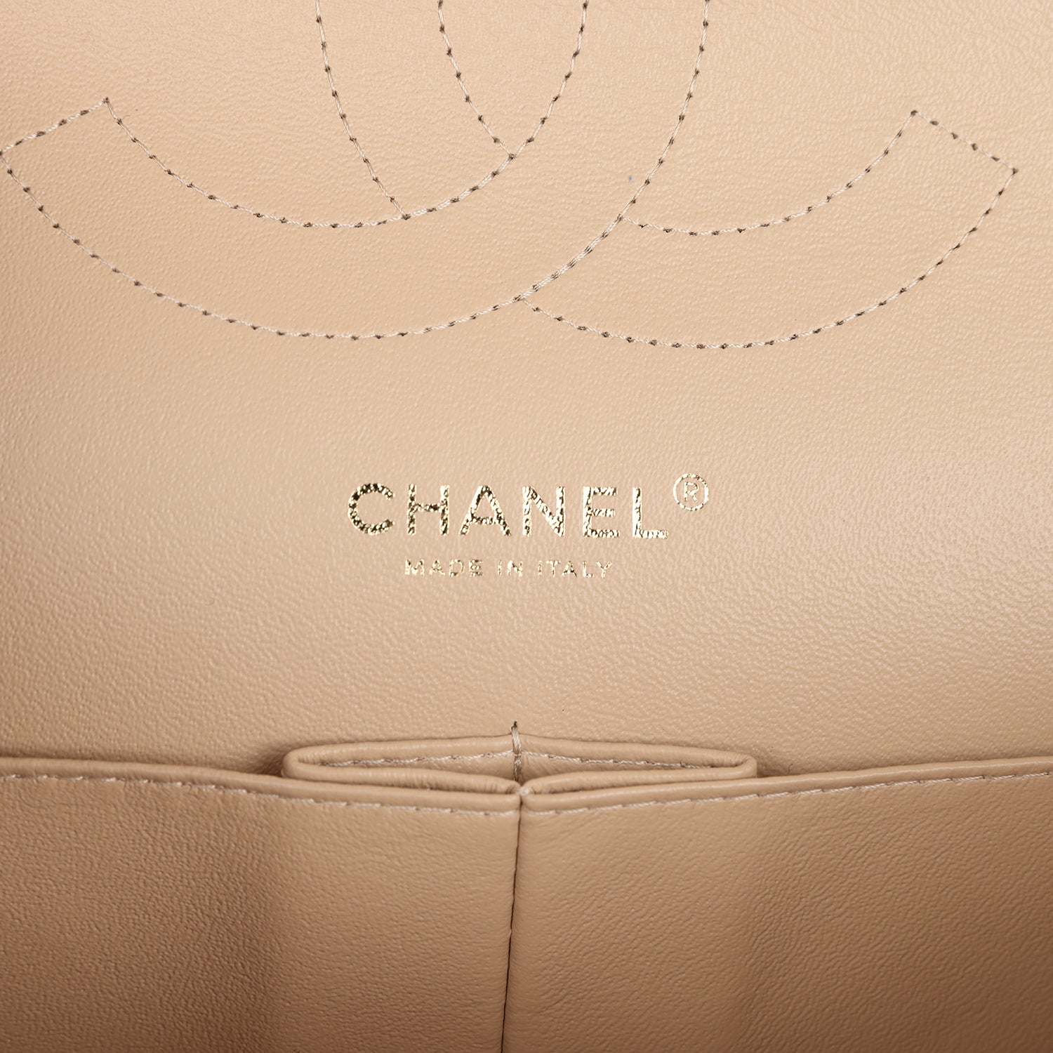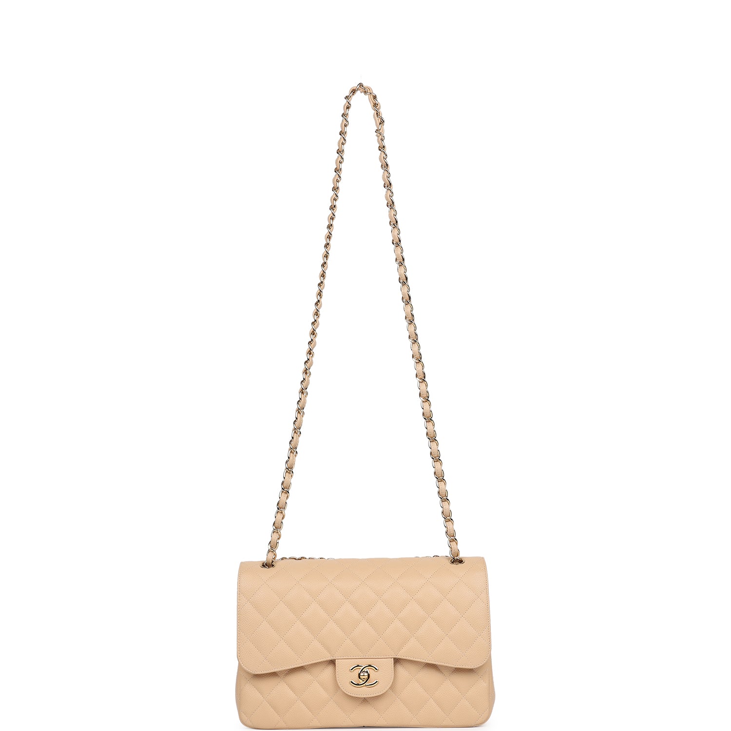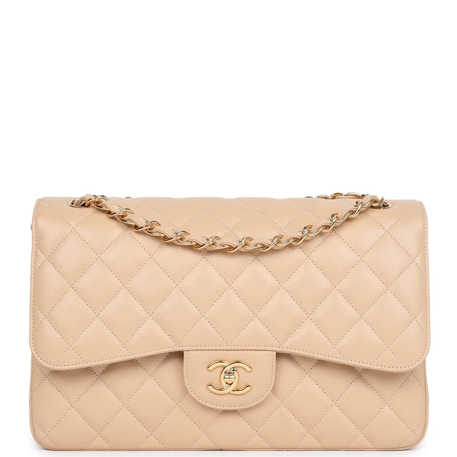 Regular price $2,480.00 Sale price $840.00 Save $1,640.00 Jumbo Classic Double Flap bag is in light beige caviar leather with gold tone hardware and features a front flap with signature CC turnlock closure, half moon back pocket, and adjustable interwoven gold tone chain link and light beige leather shoulder strap.