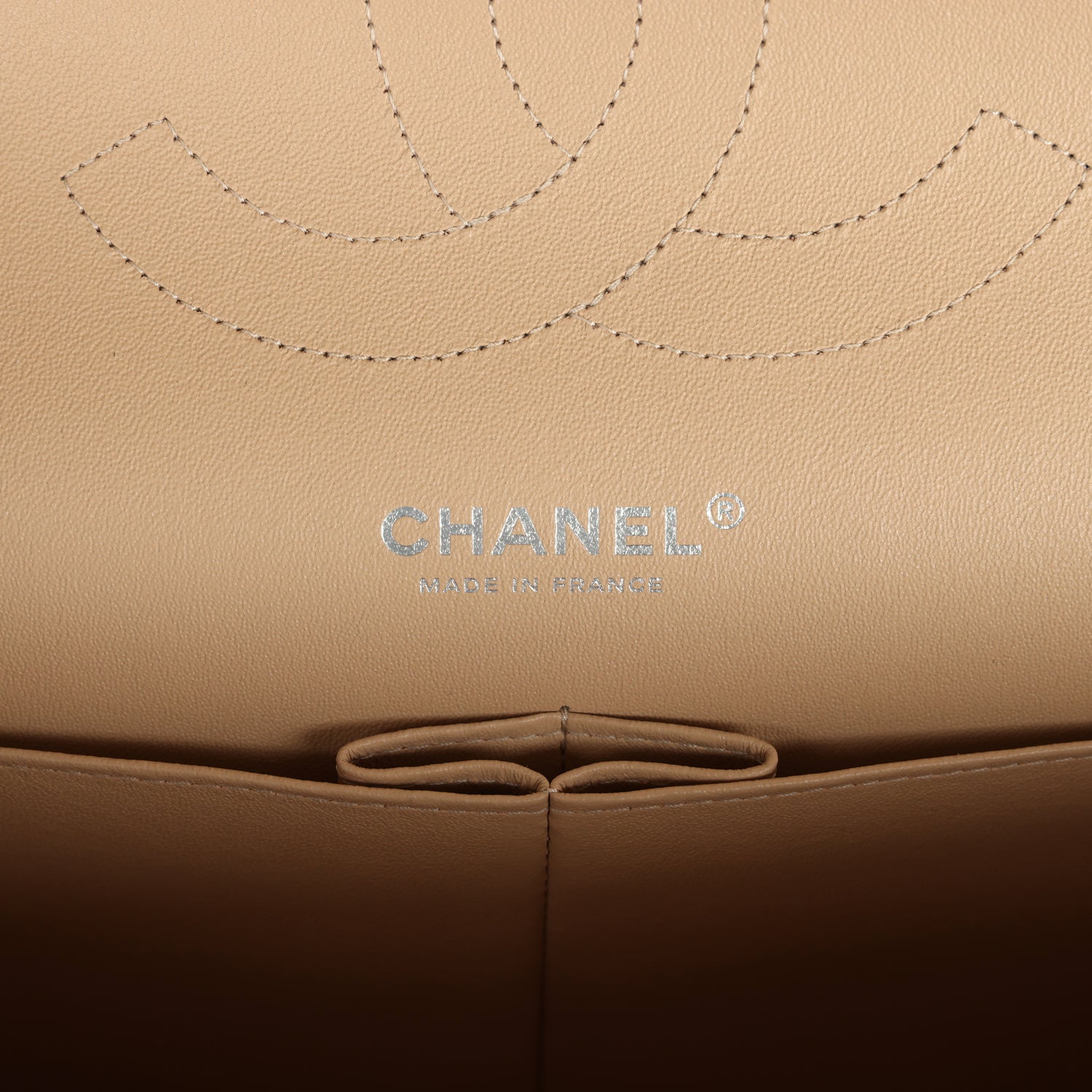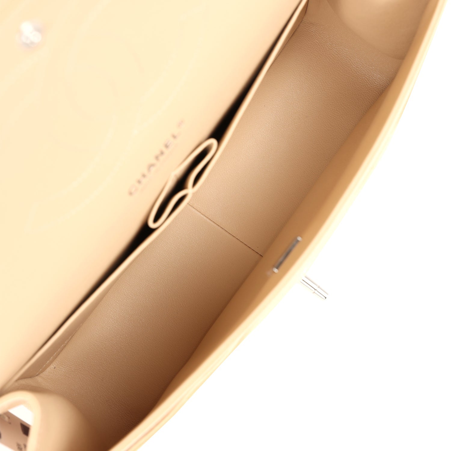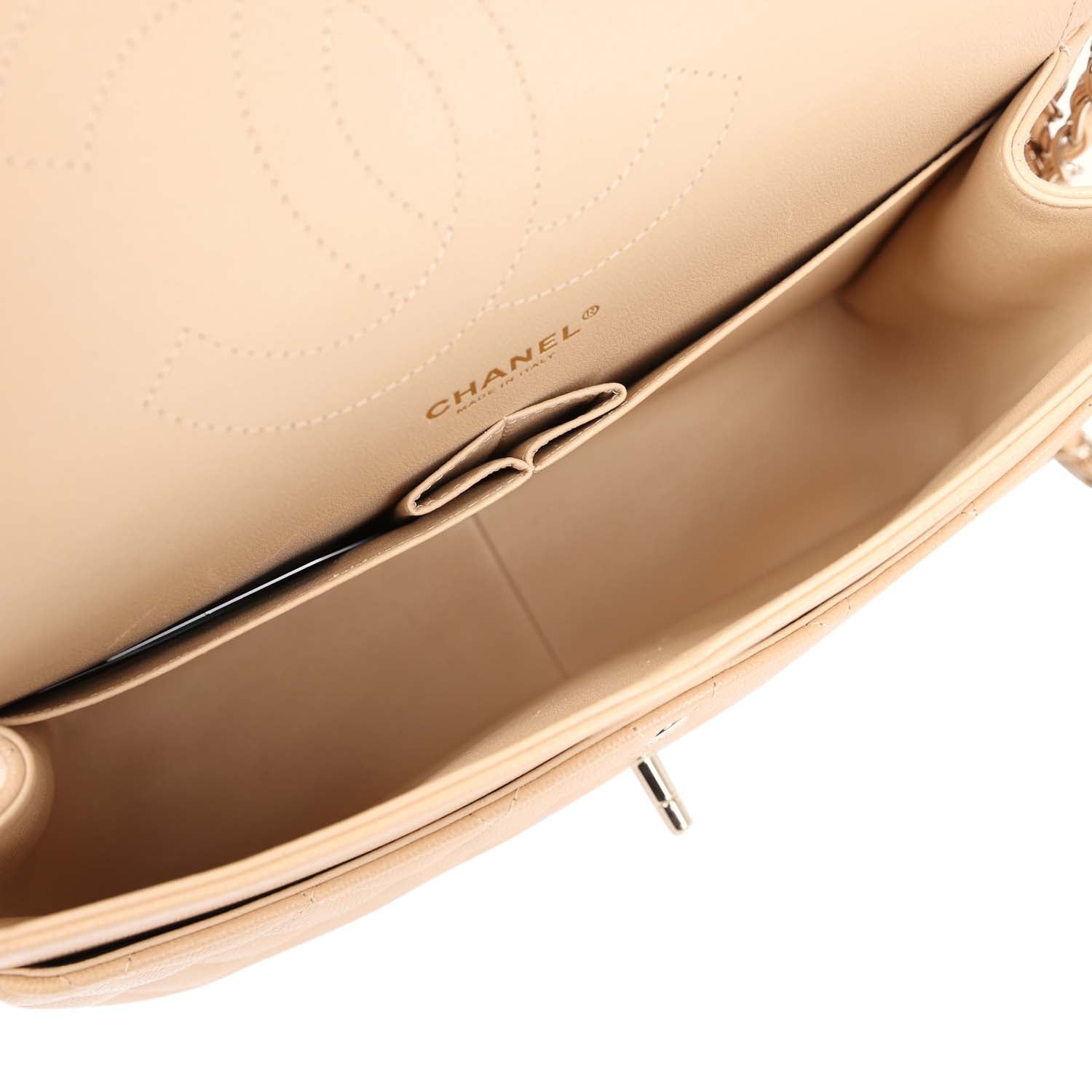 Regular price $2,070.00 Sale price $440.00 Save $1,630.00This Jumbo Classic Double Flap bag is in light beige caviar leather with silver tone hardware and features a front flap with signature CC turnlock closure, half moon back pocket, and adjustable interwoven silver tone chain link and beige leather shoulder strap.