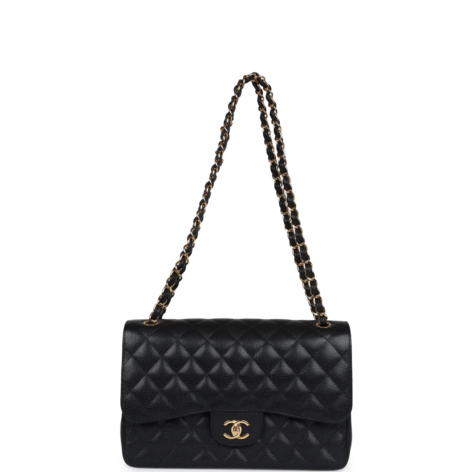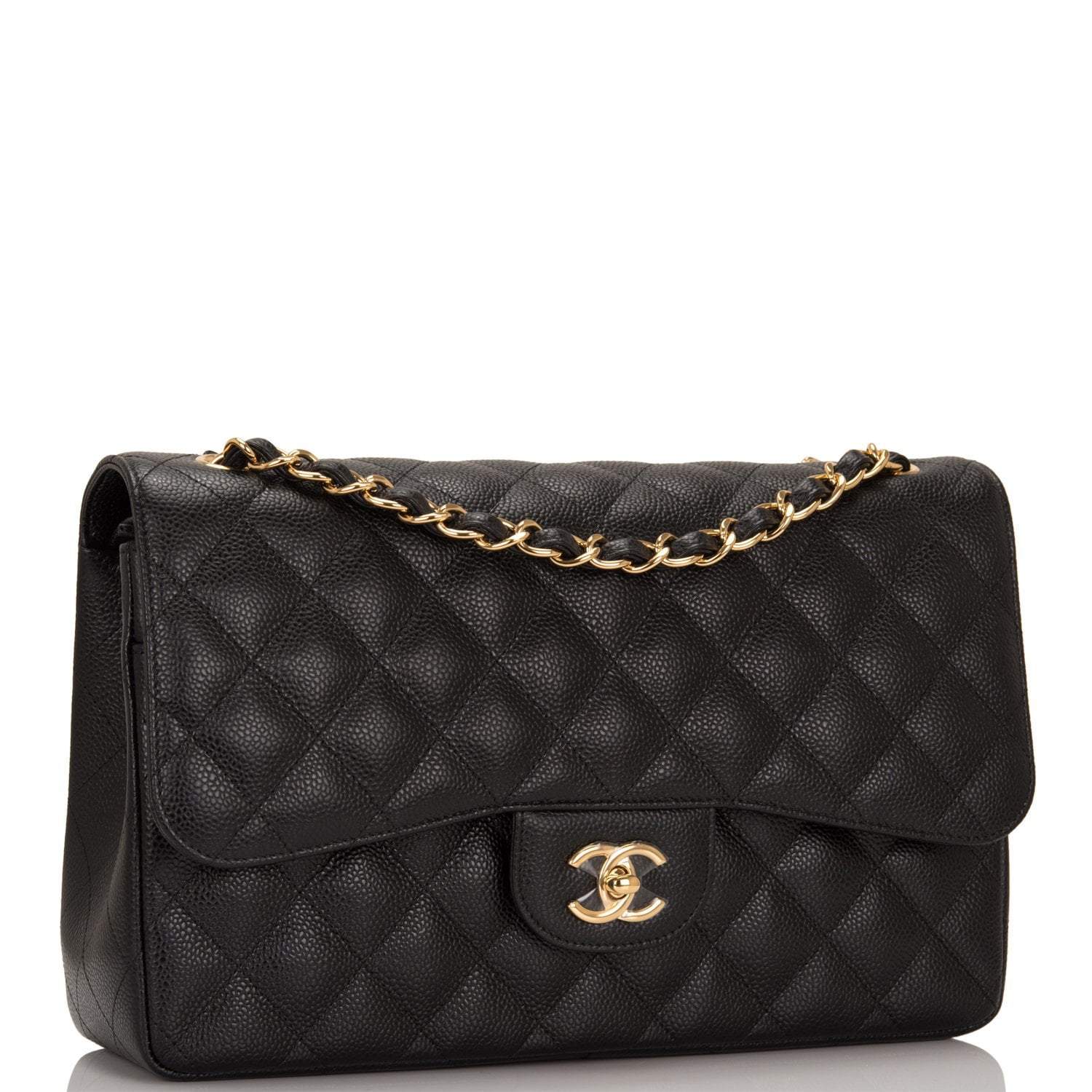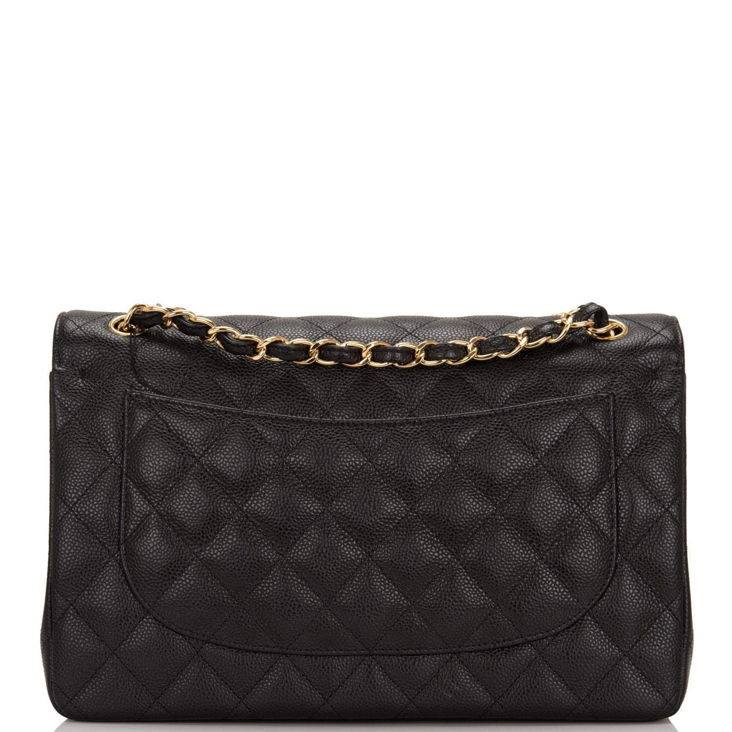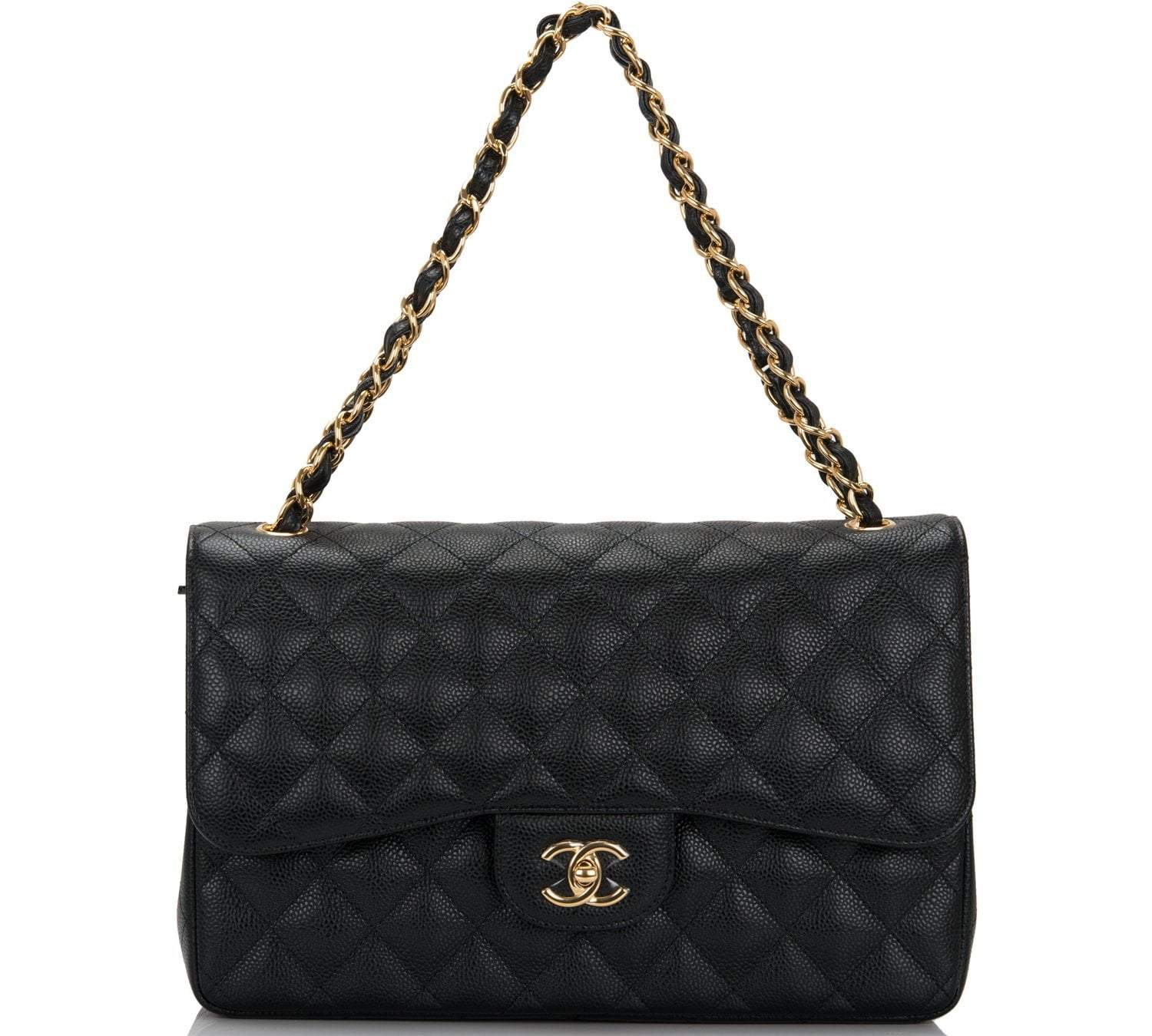 Regular price $1,430.00 Sale price $459.99 Save $970.01This Jumbo Classic Double Flap bag is in black caviar leather with gold tone hardware and features a front flap with signature CC turnlock closure, half moon back pocket, and adjustable interwoven gold tone chain link and black leather shoulder strap.
