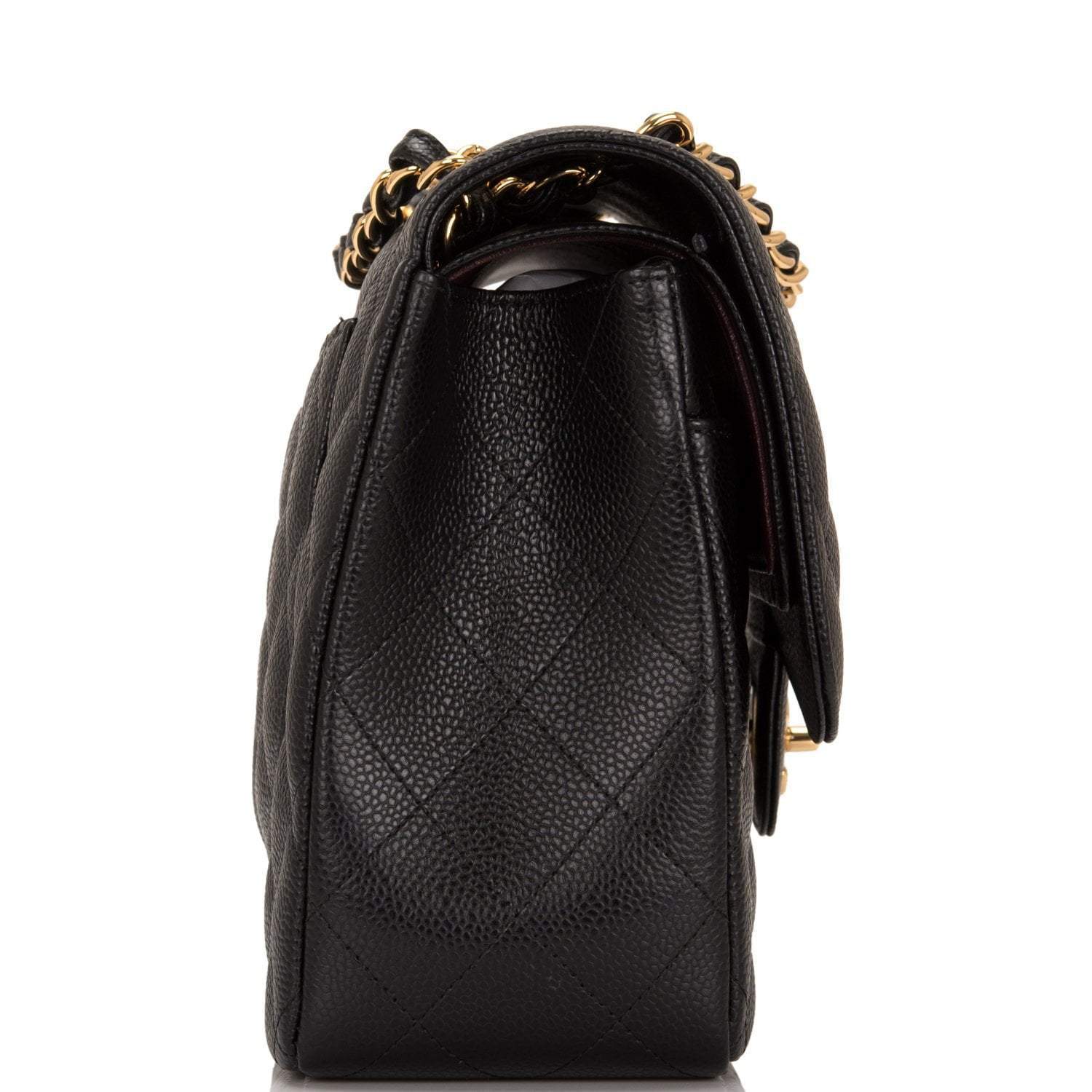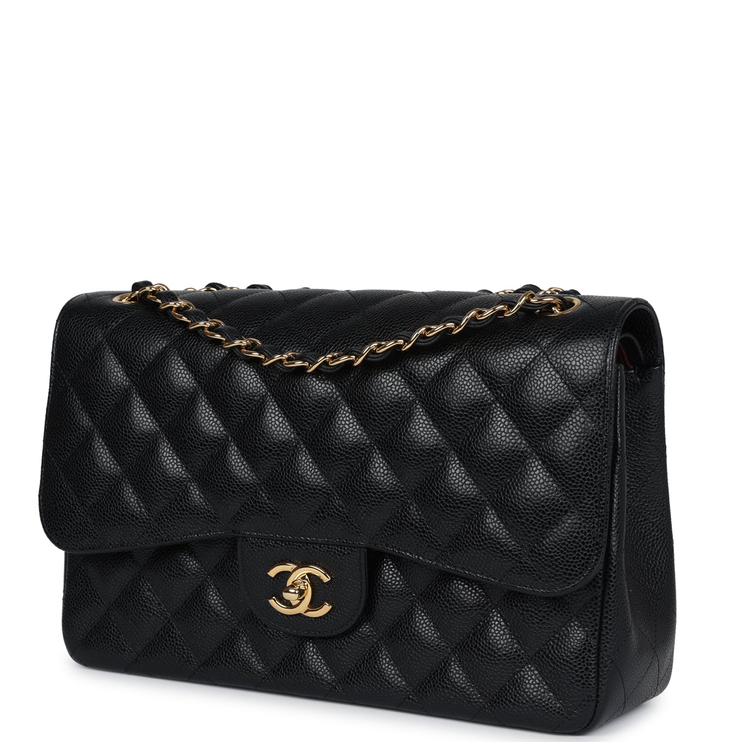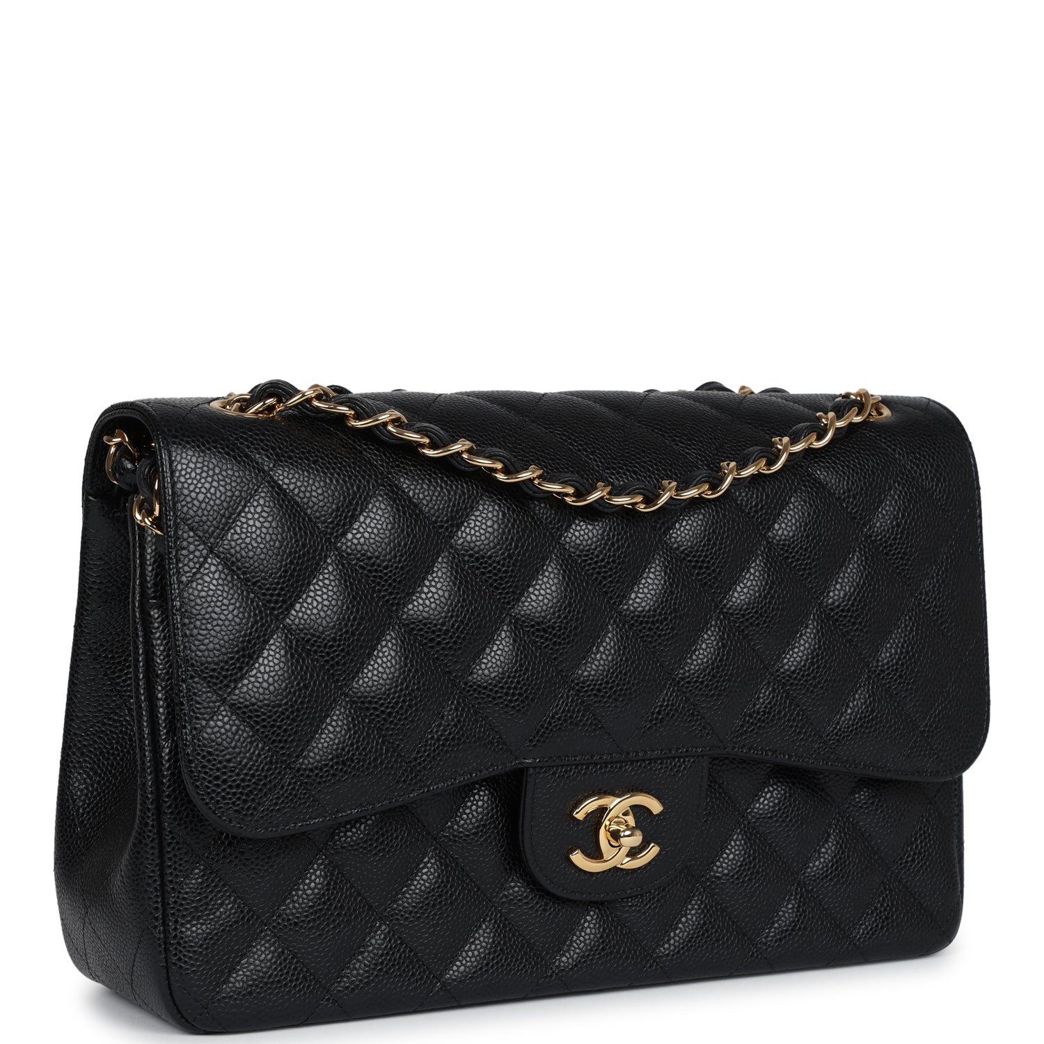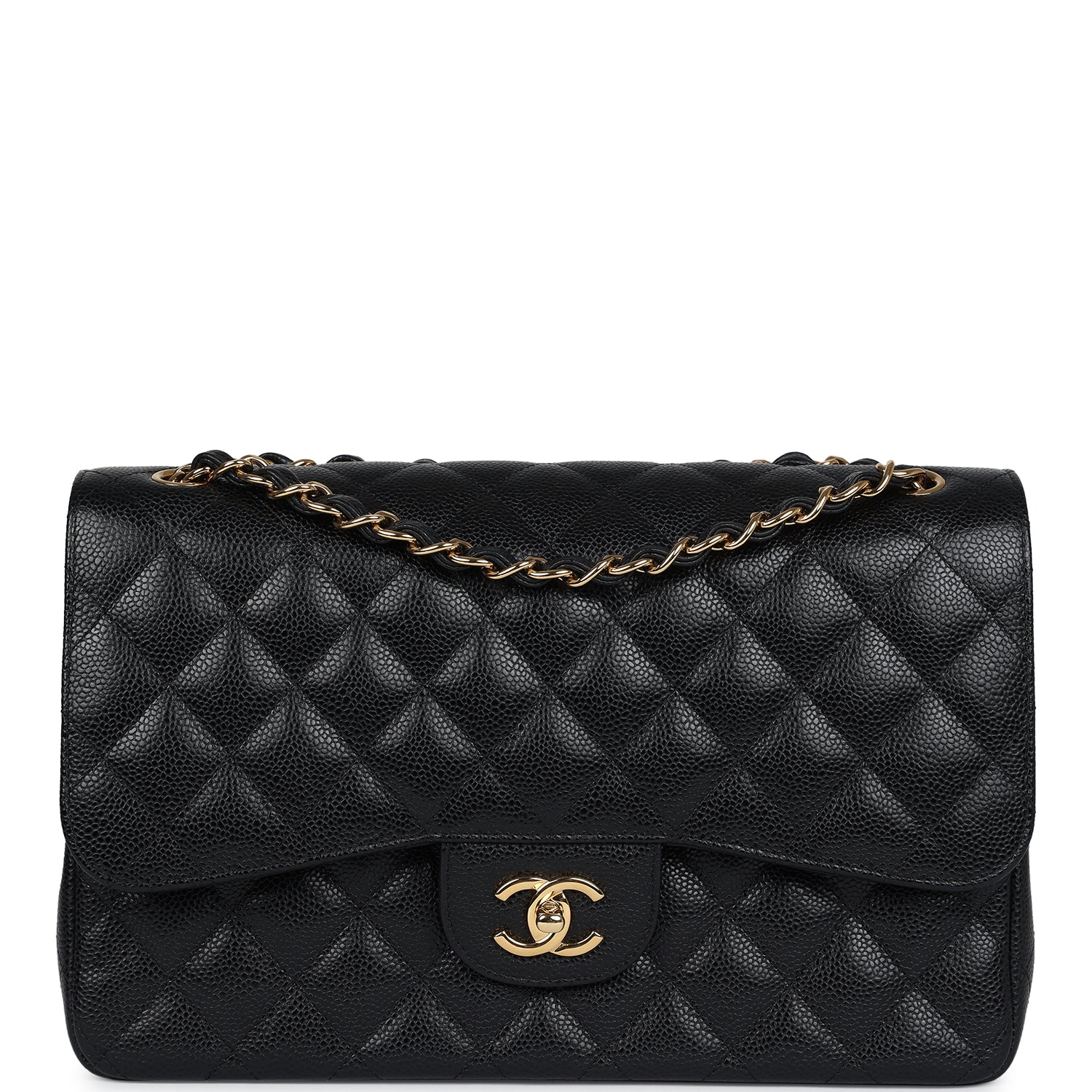Regular price $1,430.00 Sale price $459.99 Save $970.01This Jumbo Classic Double Flap bag is in black caviar leather with gold tone hardware and features a front flap with signature CC turnlock closure, half moon back pocket, and adjustable interwoven gold tone chain link and black leather shoulder strap.