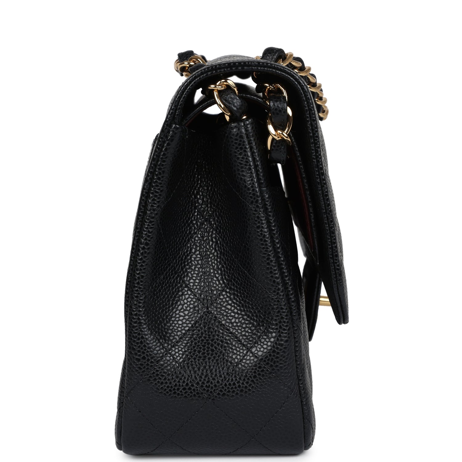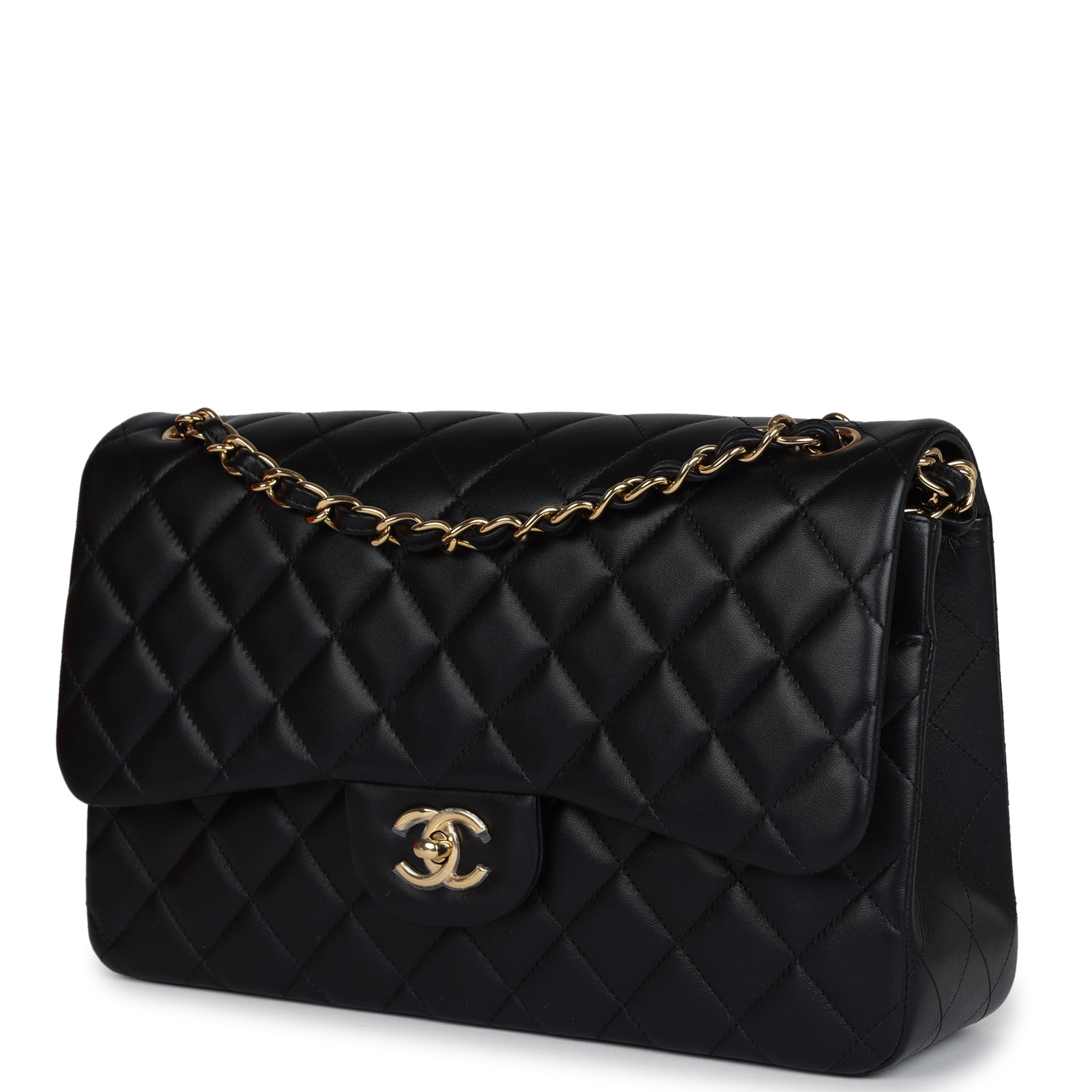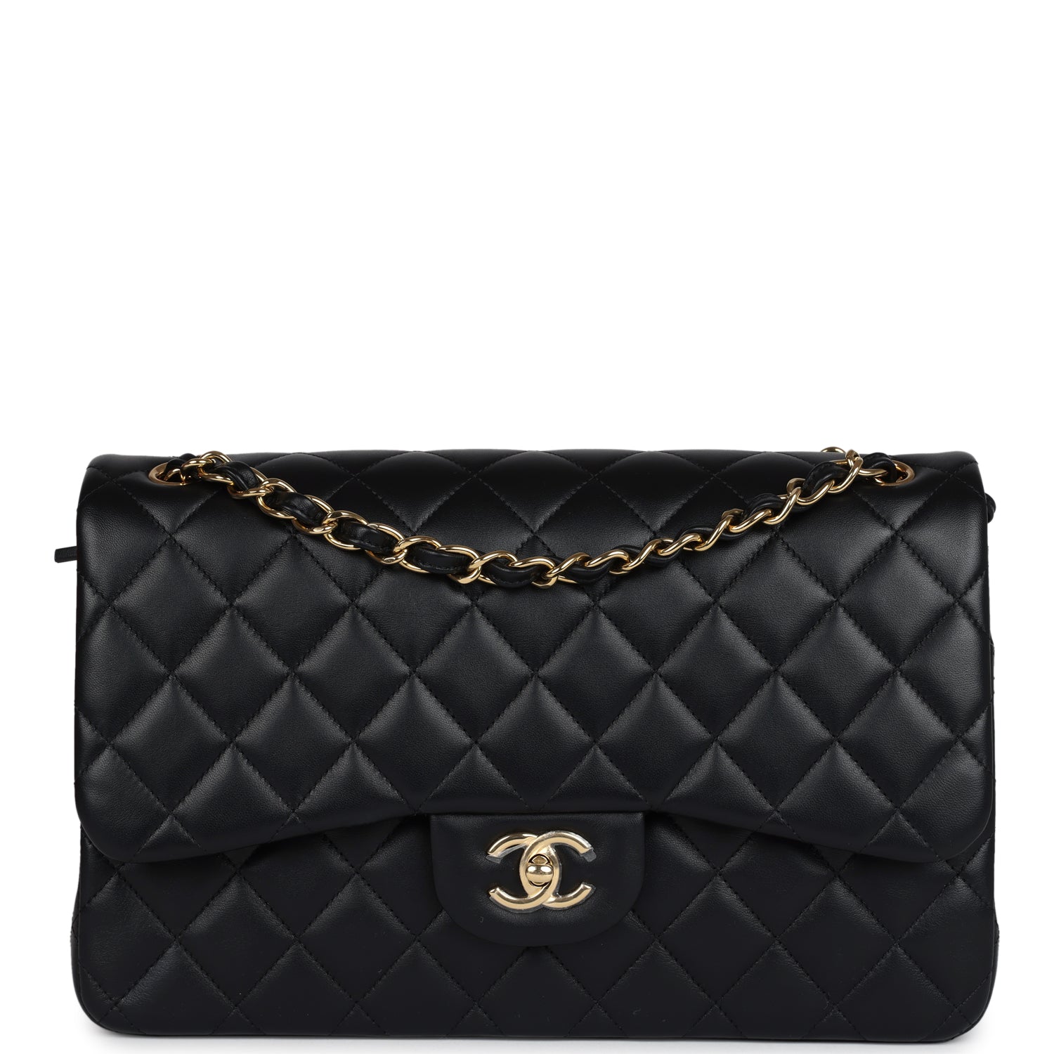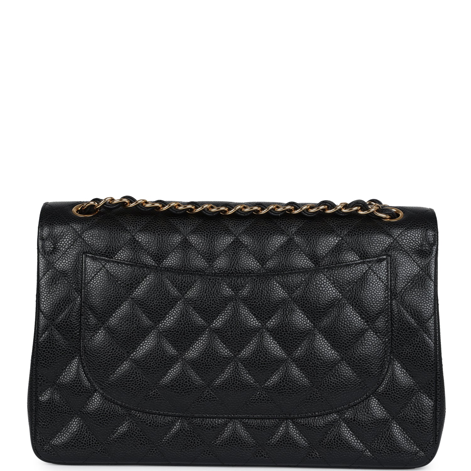 Regular price $1,430.00 Sale price $459.99 Save $970.01This Jumbo Classic Double Flap bag is in black caviar leather with gold tone hardware and features a front flap with signature CC turnlock closure, half moon back pocket, and adjustable interwoven gold tone chain link and black leather shoulder strap.