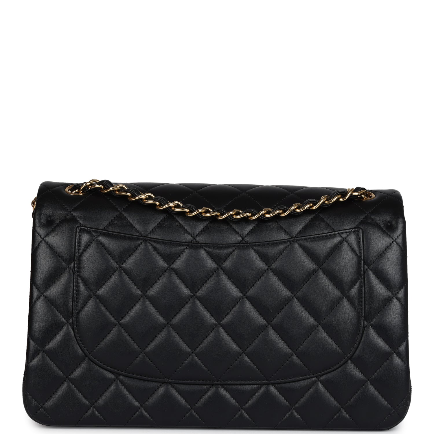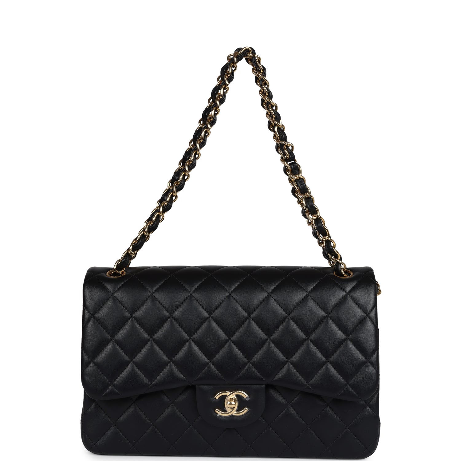 Regular price $1,960.00 Sale price $440.00 Save $1,520.00This Jumbo Classic Double Flap bag is in black lambskin leather with gold tone hardware and features a front flap with signature CC turnlock closure, half moon back pocket, and adjustable interwoven Gold tone chainlink and black leather shoulder strap.