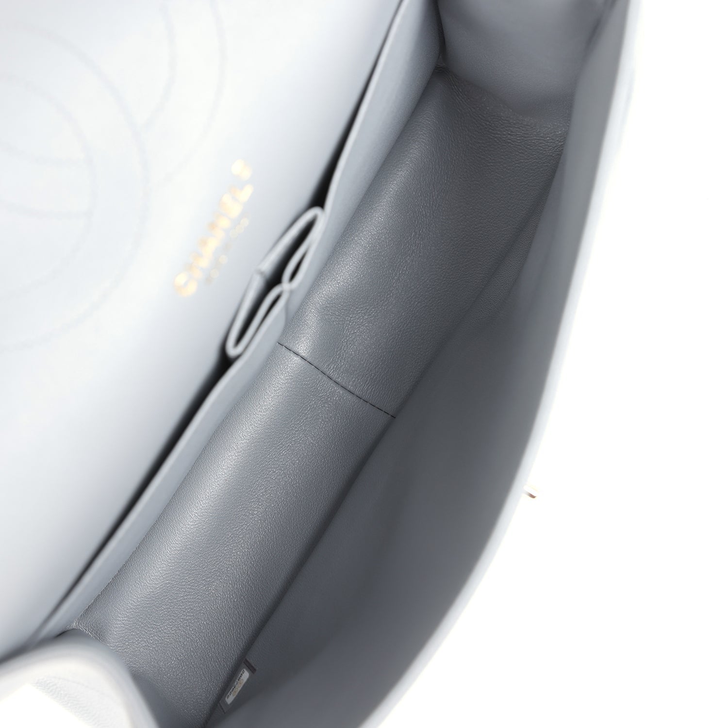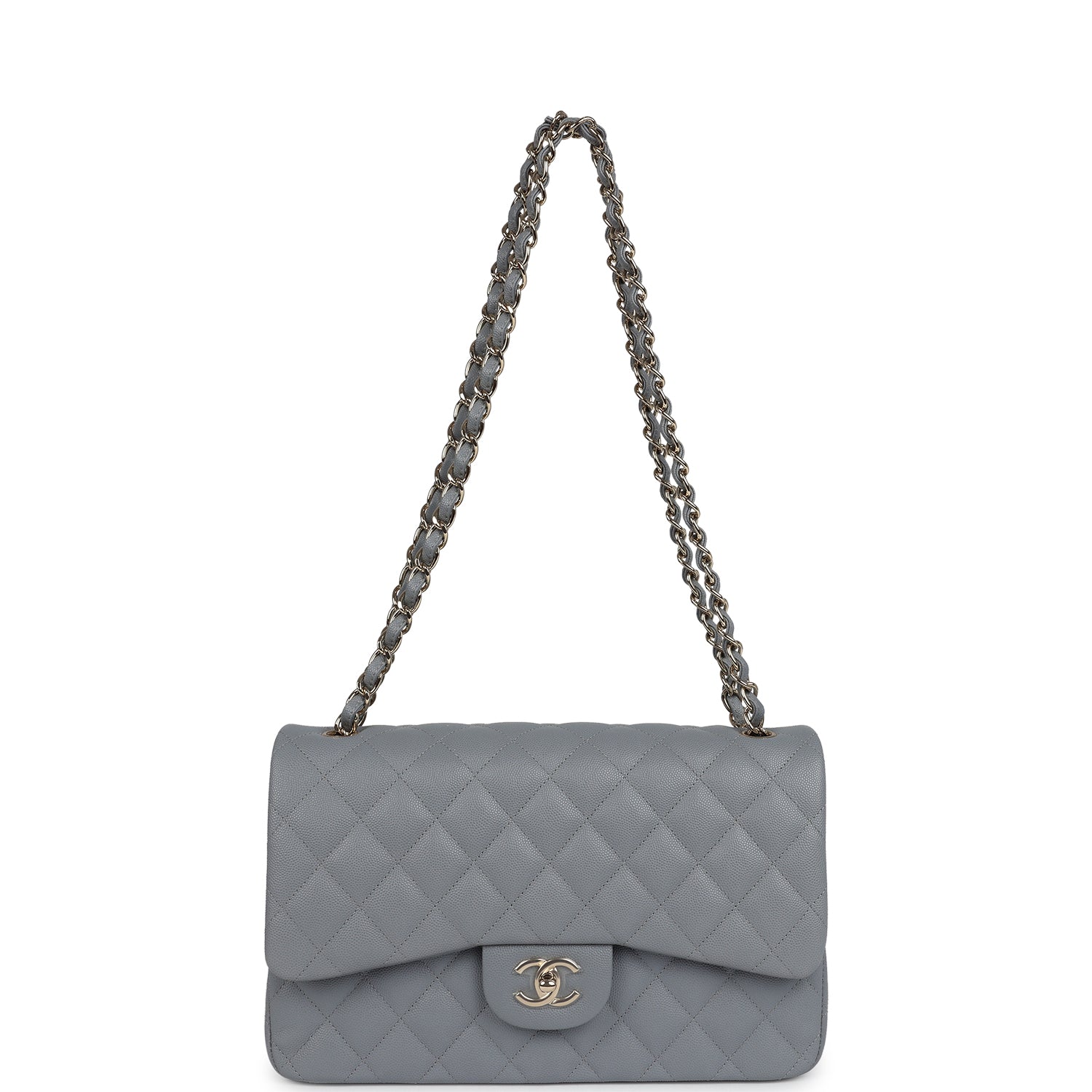 Regular price $2,020.00 Sale price $430.00 Save $1,590.00This Jumbo Classic Double Flap bag is in light grey shiny caviar leather with light gold tone hardware, front flap with CC turnlock closure, half moon back pocket and adjustable interwoven light gold tone chain link and light grey leather shoulder/crossbody strap.