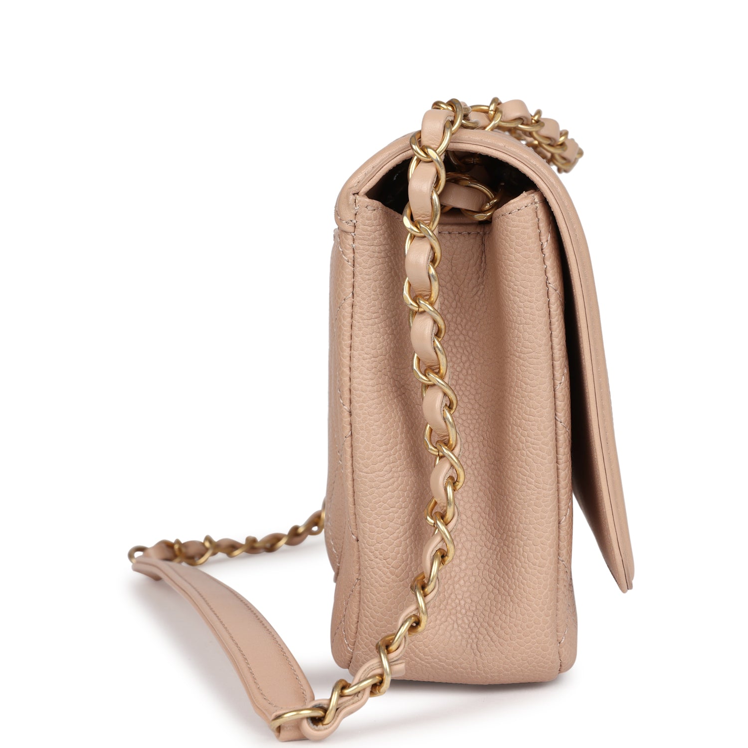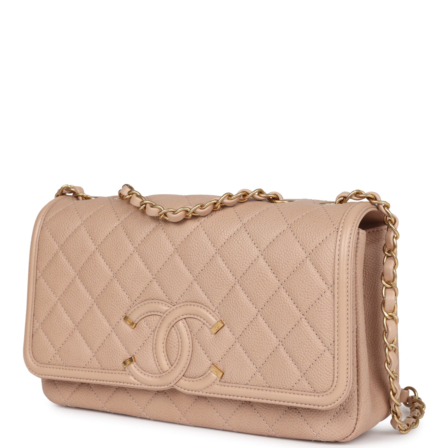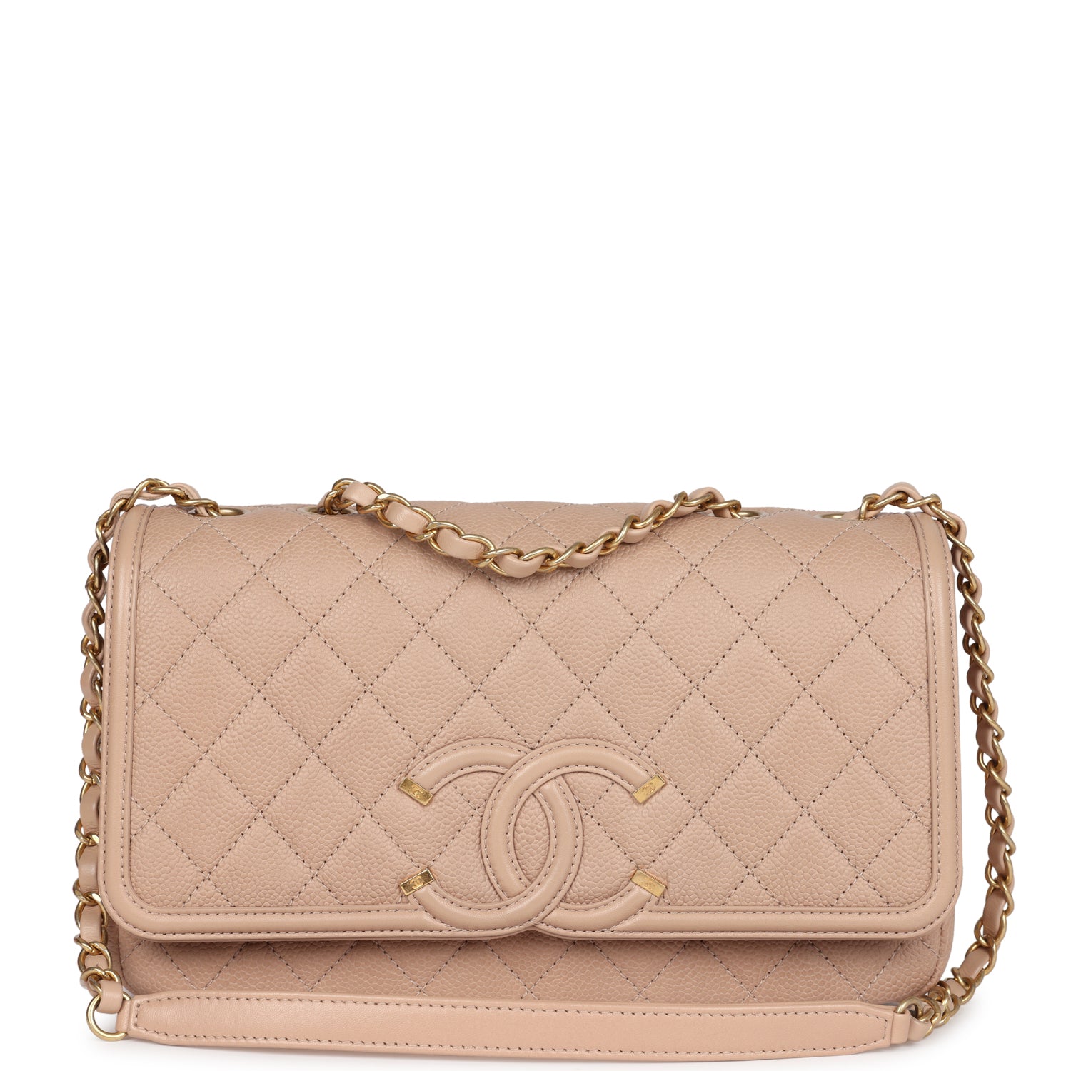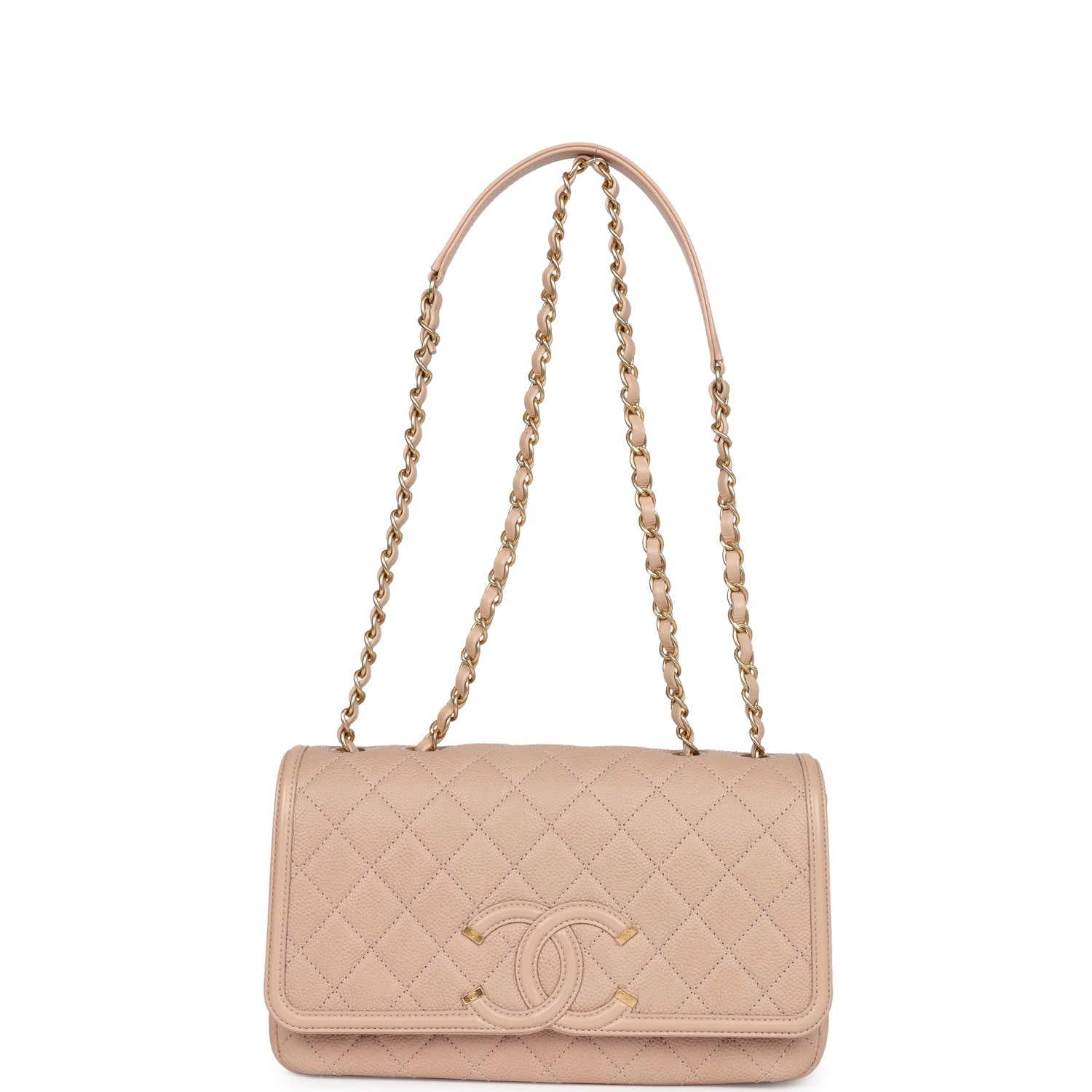 Regular price $1,900.00 Sale price $430.00 Save $1,470.00This Medium Classic Double Flap bag is in beige iridescent caviar leather with light gold tone hardware and features a front flap with signature CC turnlock closure, half moon back pocket, and adjustable interwoven light gold tone chain link and beige leather shoulder strap.