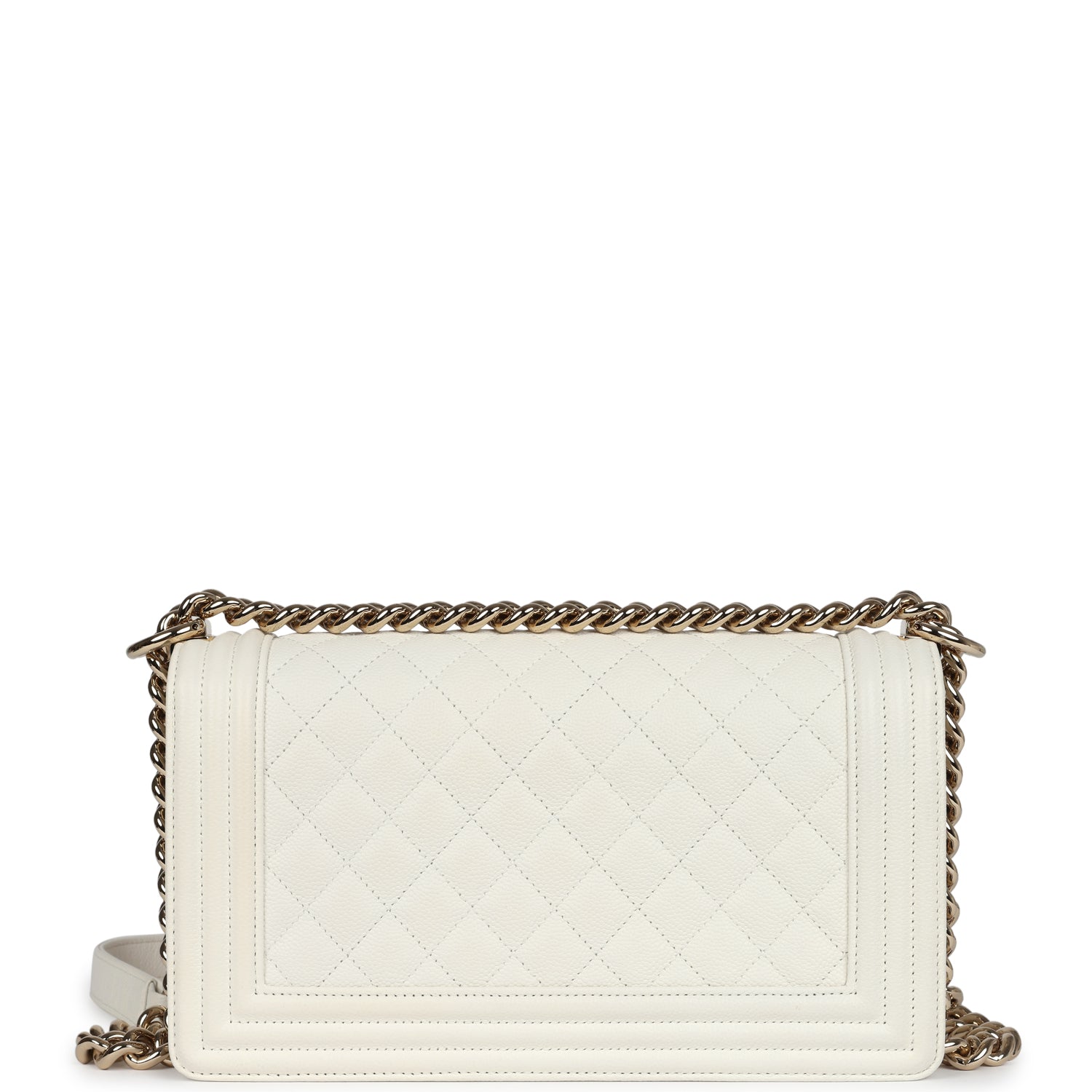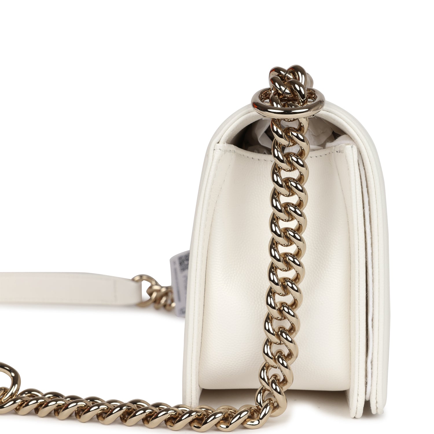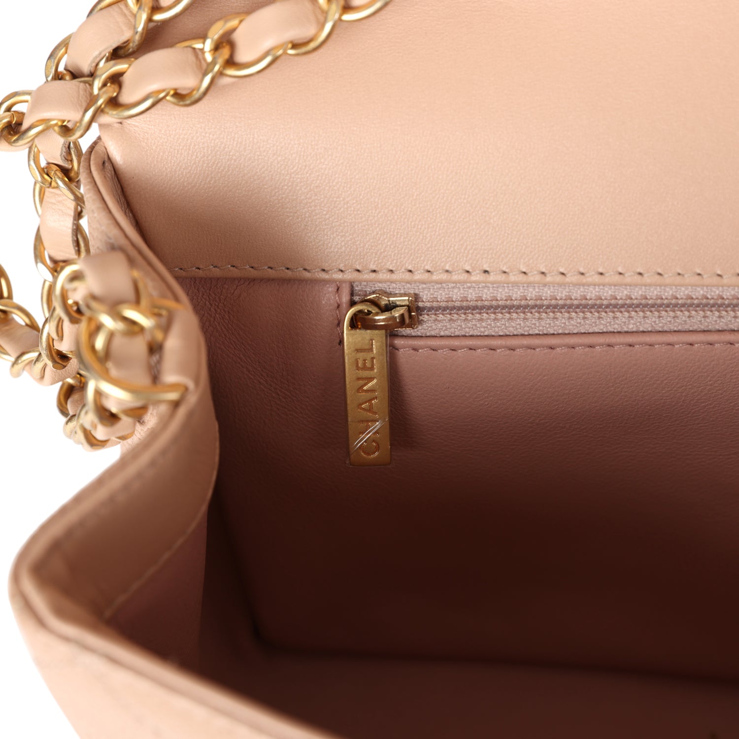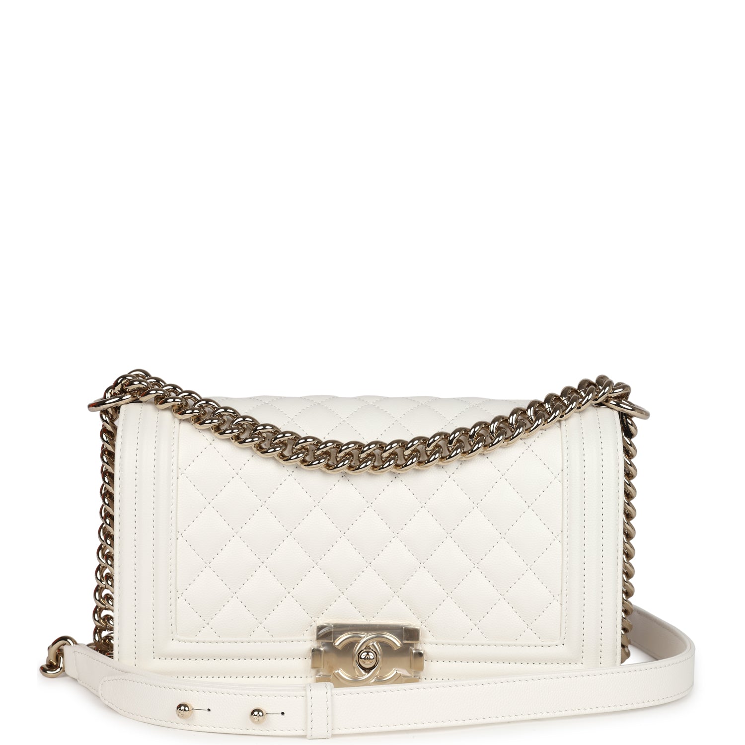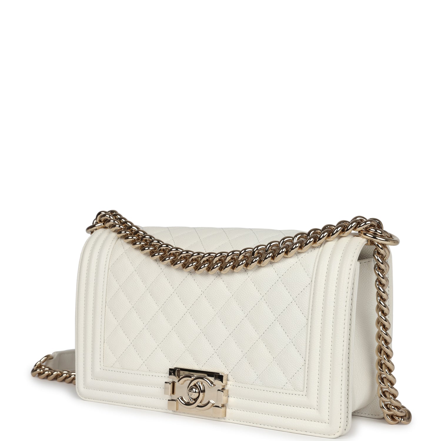 Regular price $1,900.00 Sale price $430.00 Save $1,470.00This Medium Classic Double Flap bag is in beige iridescent caviar leather with light gold tone hardware and features a front flap with signature CC turnlock closure, half moon back pocket, and adjustable interwoven light gold tone chain link and beige leather shoulder strap.