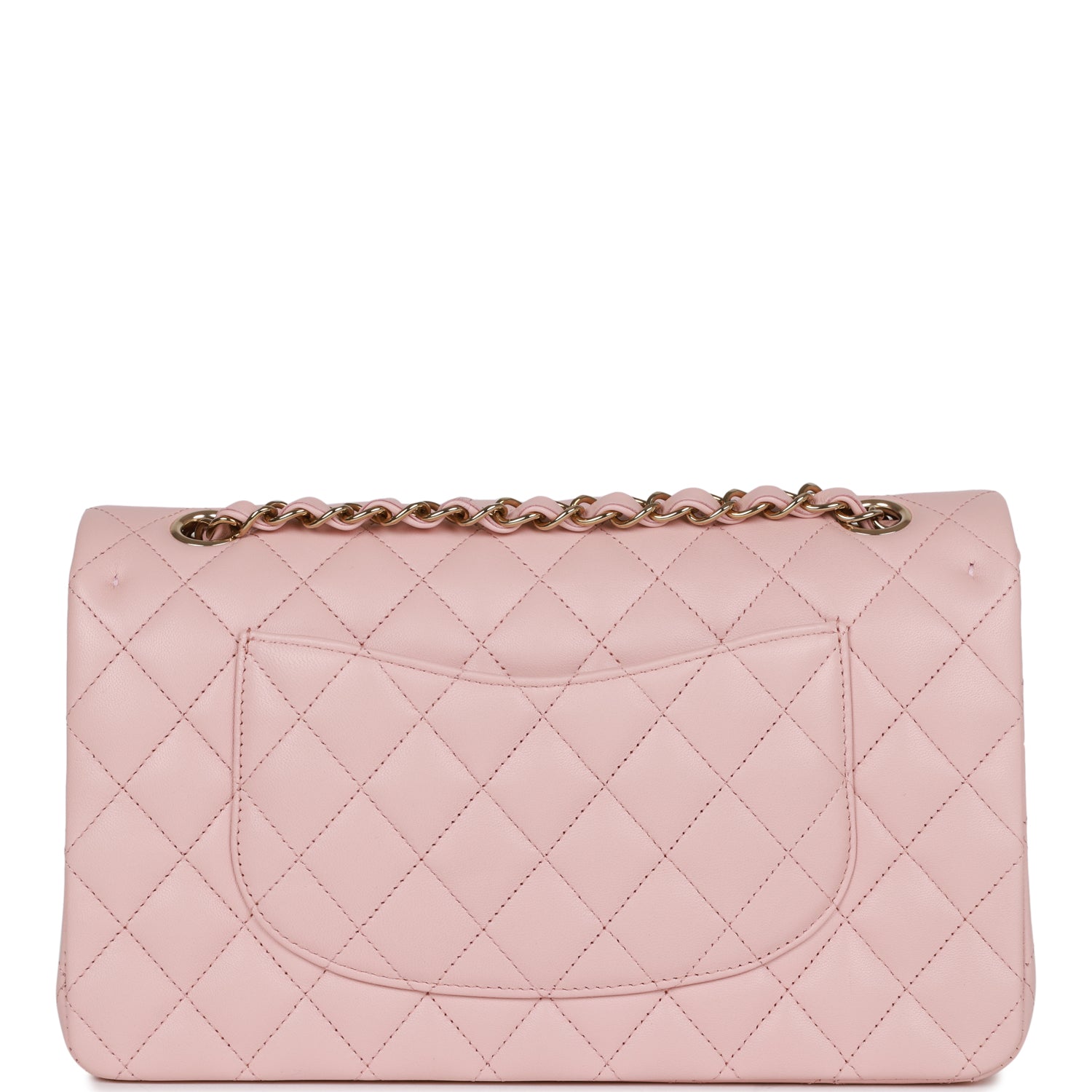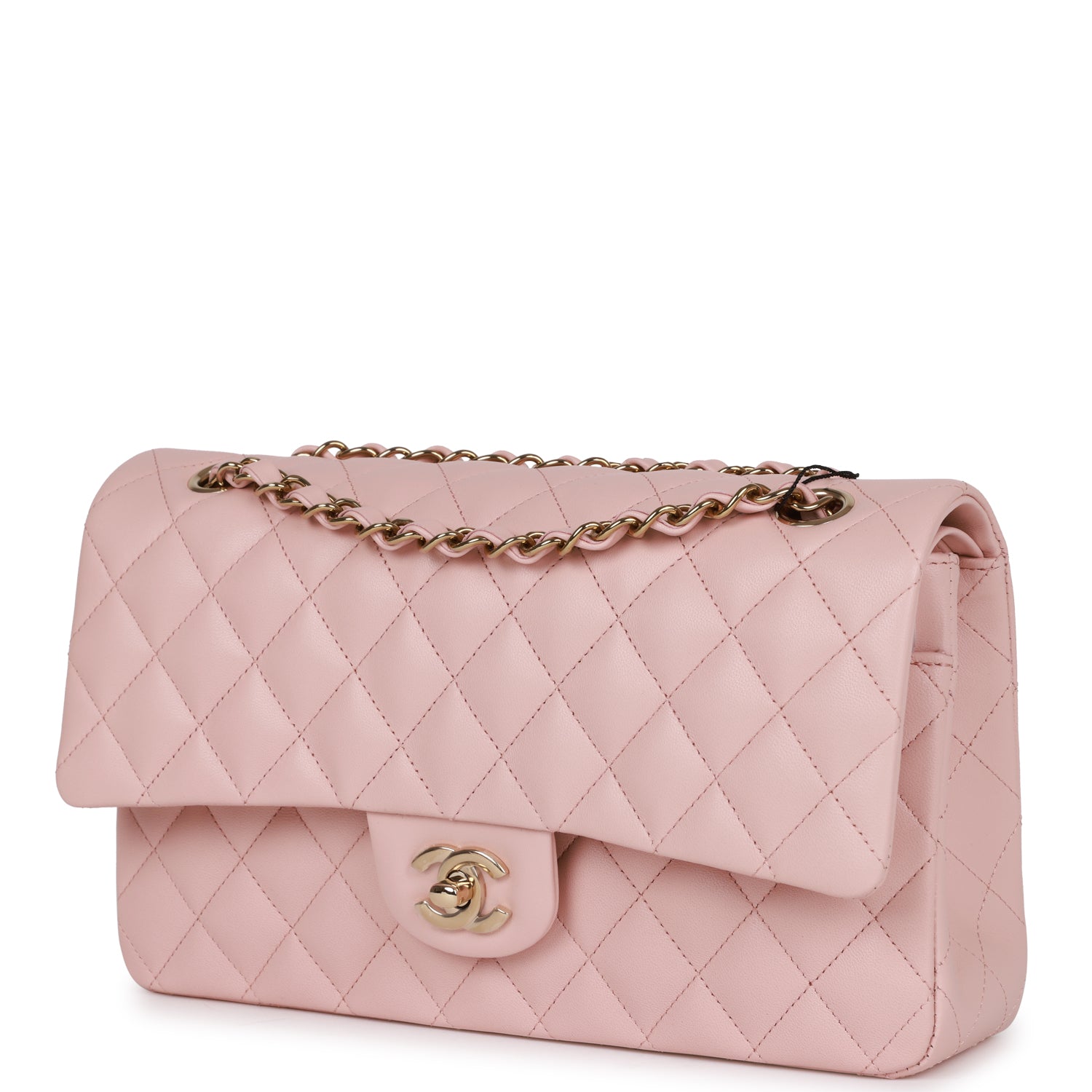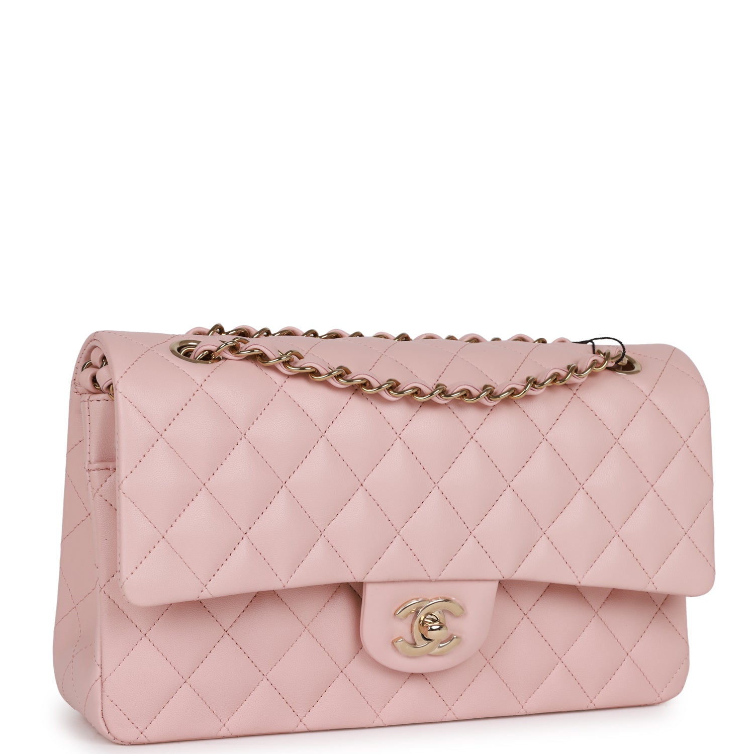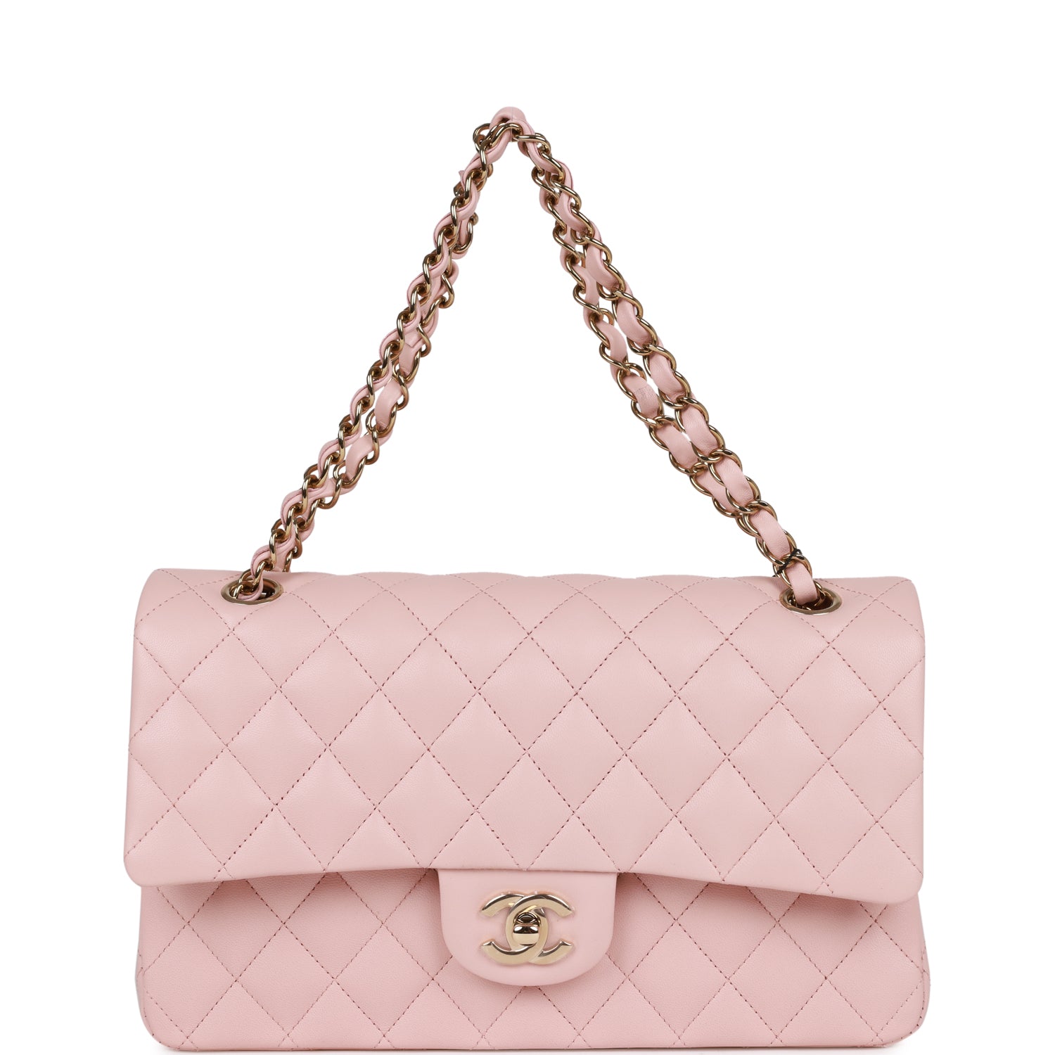 Regular price $2,150.00 Sale price $430.00 Save $1,720.00This Medium Classic Double Flap bag is in Light Pink lambskin leather with light gold tone hardware and features a front flap with signature CC turnlock closure, half moon back pocket, and an interwoven light gold tone chain link and light pink leather crossbody/shoulder strap.