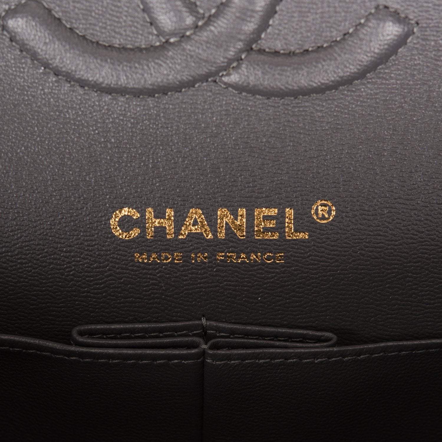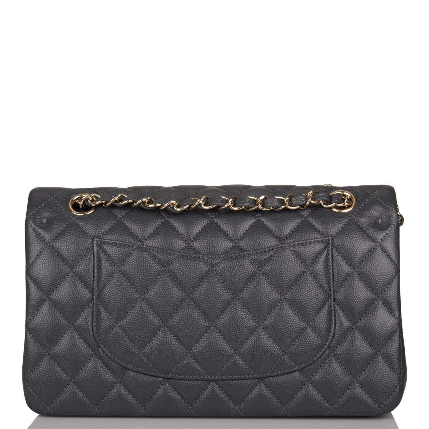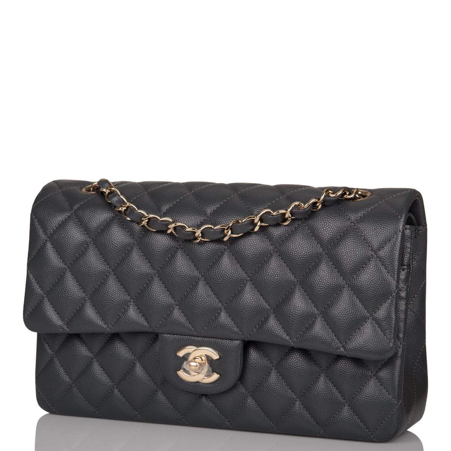 Regular price $1,092.25 Sale price $655.35 Save $436.90This Medium Classic Double Flap bag is in dark grey caviar leather with light gold tone hardware and features a front flap with signature CC turnlock closure, half moon back pocket, and adjustable interwoven light gold tone chain link and dark grey leather shoulder strap.