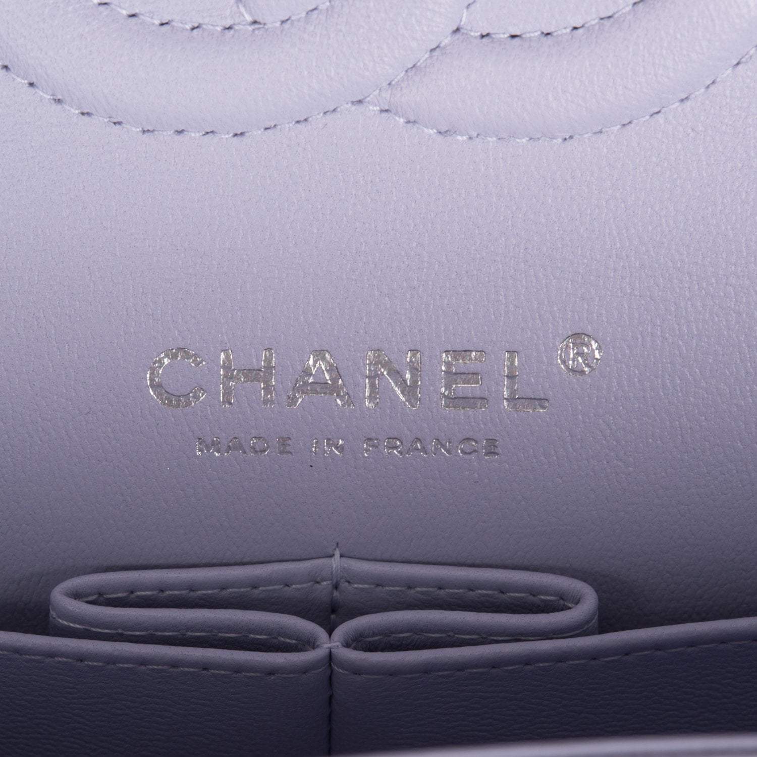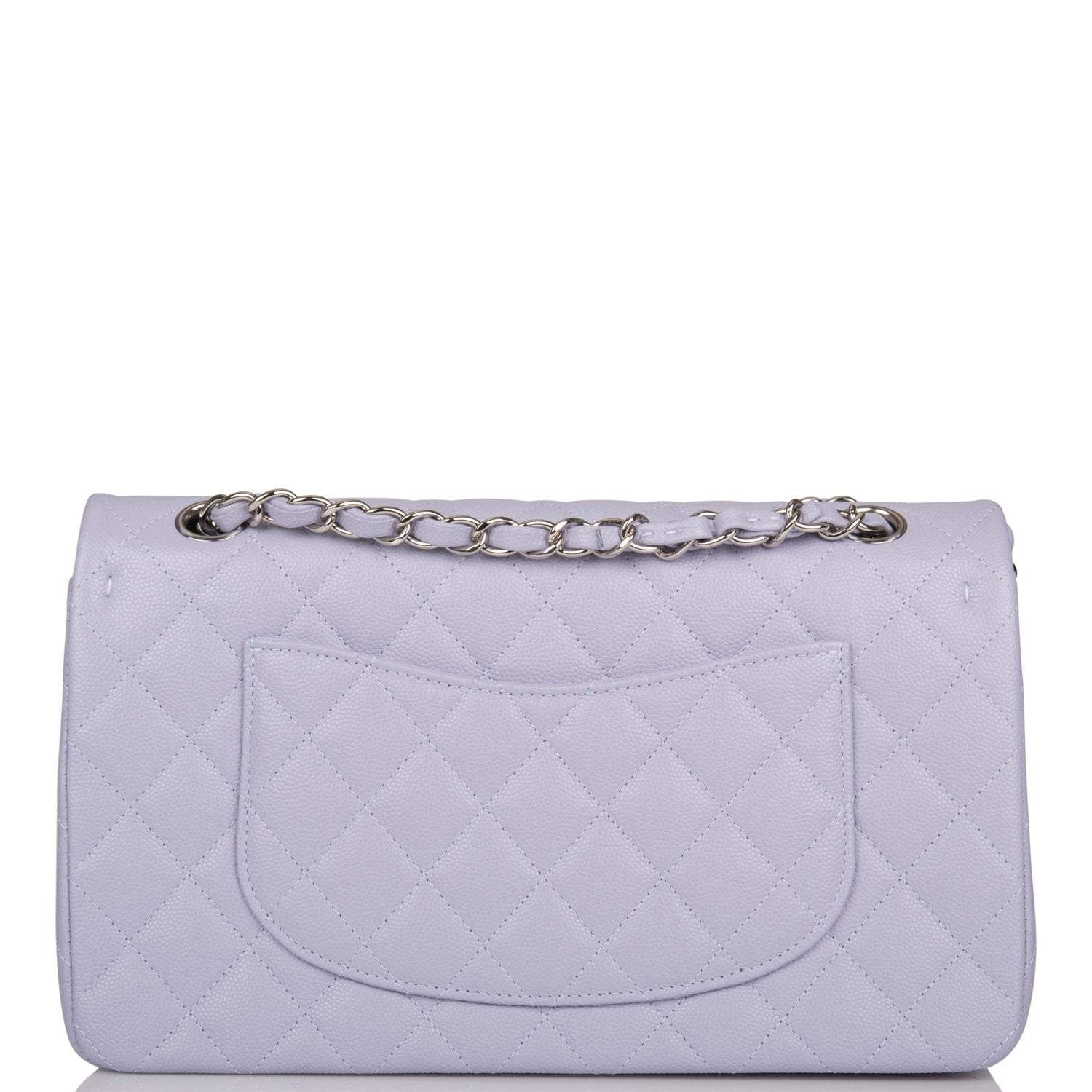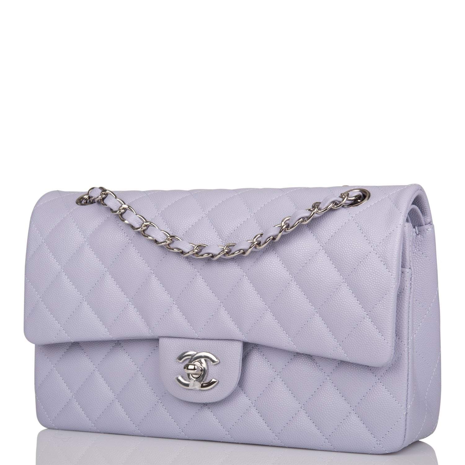 Regular price $1,089.46 Sale price $653.68 Save $435.78This Medium Classic Double Flap bag is in lavender caviar leather with silver tone hardware and features a front flap with signature CC turn lock closure, half moon back pocket, and adjustable interwoven silver tone chain link and light purple leather shoulder strap.