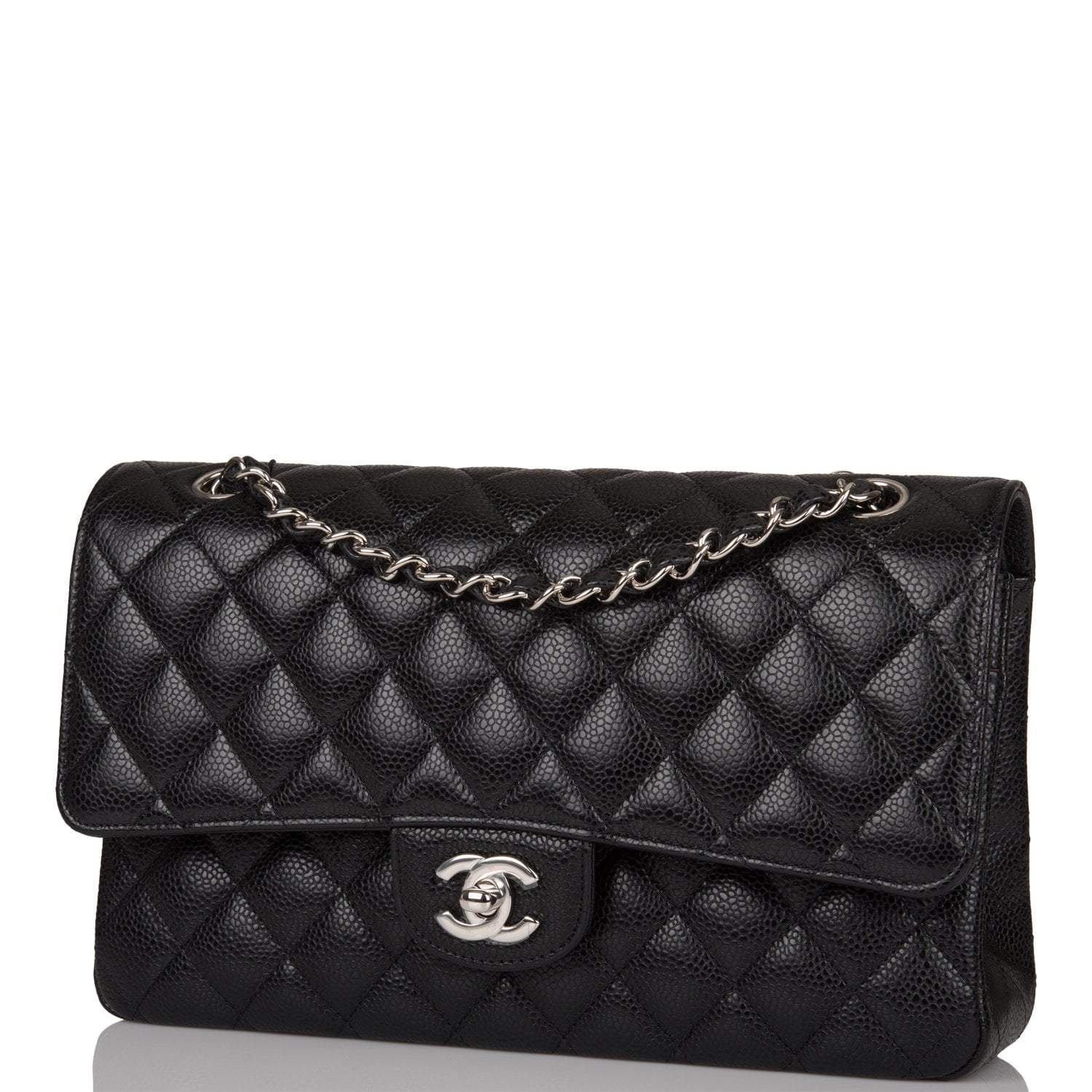 Regular price $1,095.97 Sale price $657.58 Save $438.39This Medium Classic Double Flap bag is in black caviar leather with silver tone hardware and features a front flap with signature CC turnlock closure, half moon back pocket, and adjustable interwoven silver tone chain link and black leather shoulder strap.