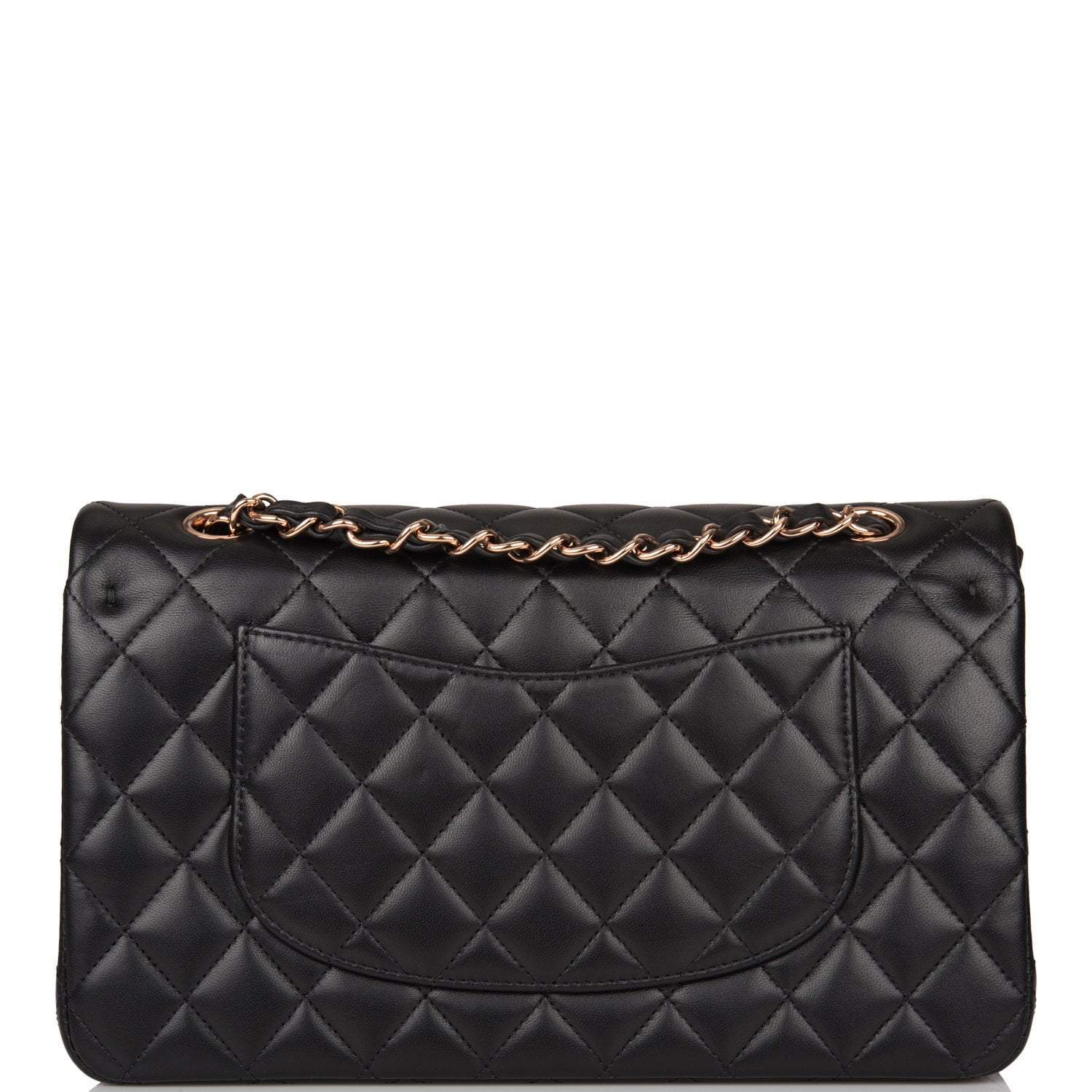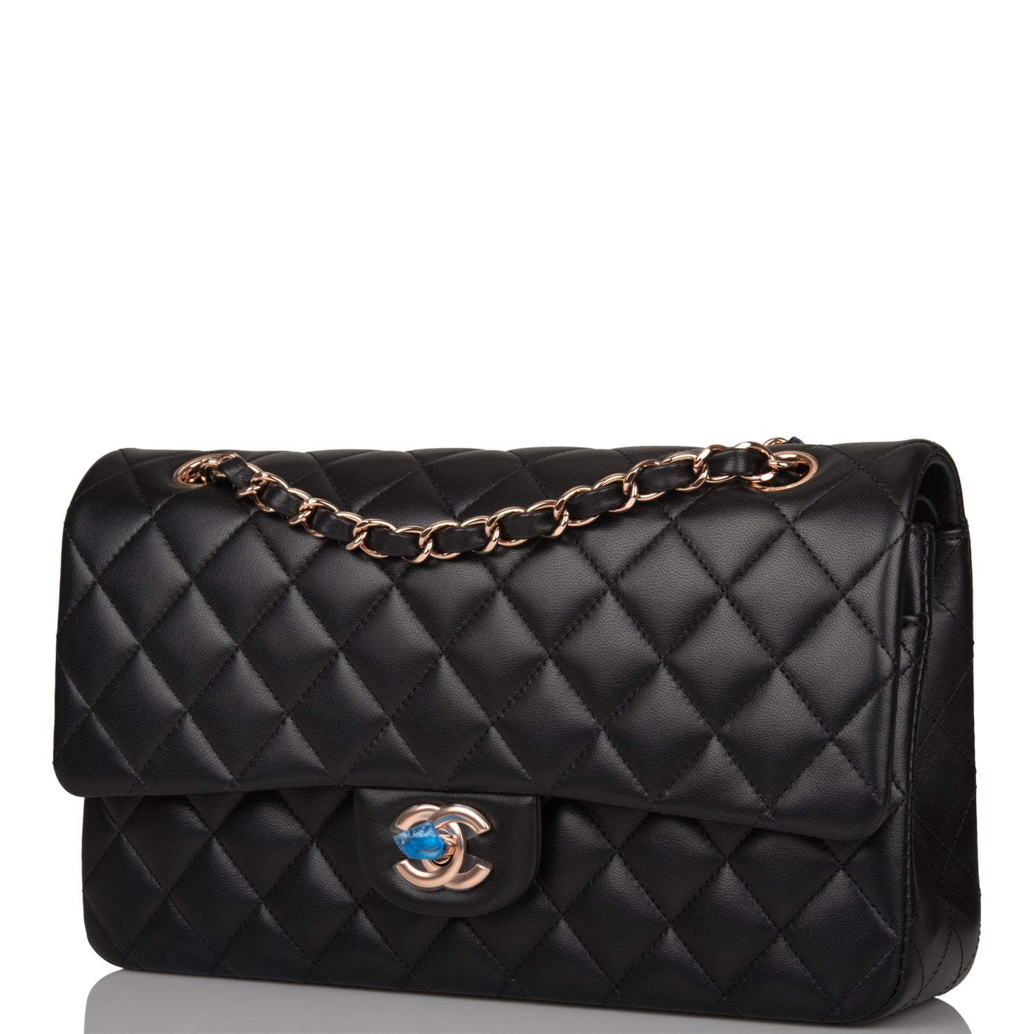 Regular price $1,095.97 Sale price $657.58 Save $438.39This Medium Classic Double Flap bag is in black lambskin leather with rose gold tone hardware and features a front flap with signature CC turn lock closure, half moon back pocket, and adjustable interwoven rose gold tone chain link and black leather shoulder strap.