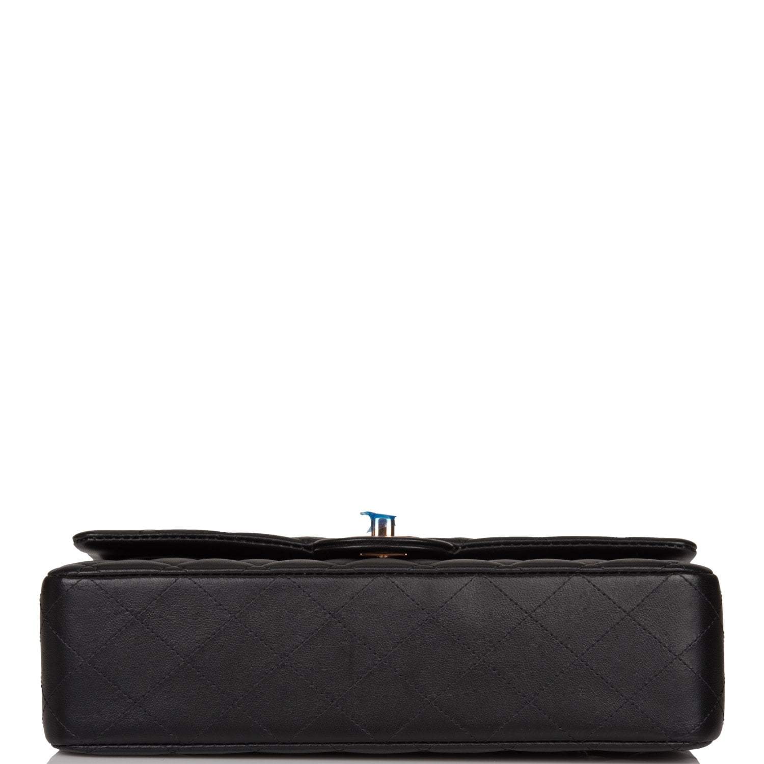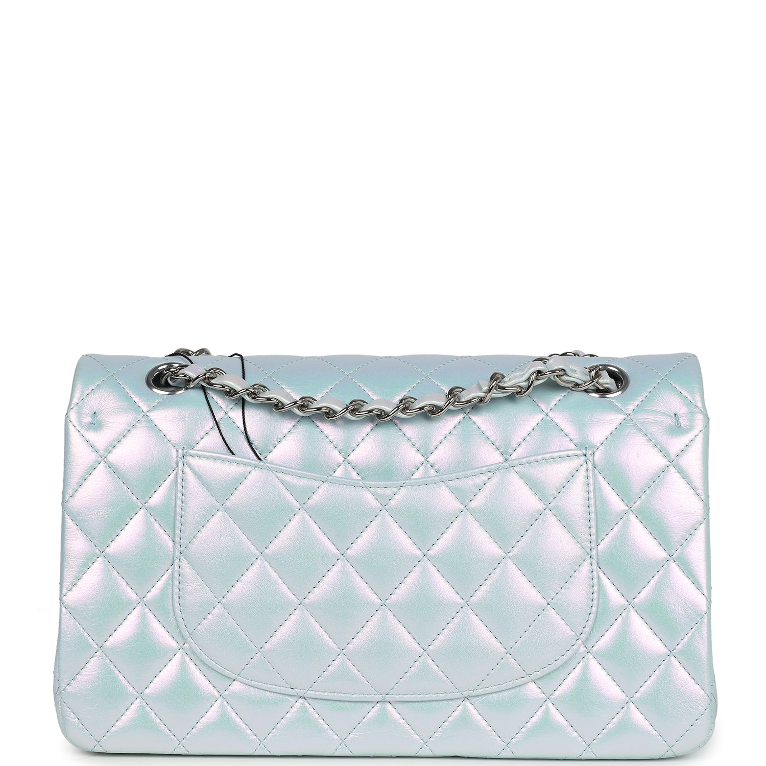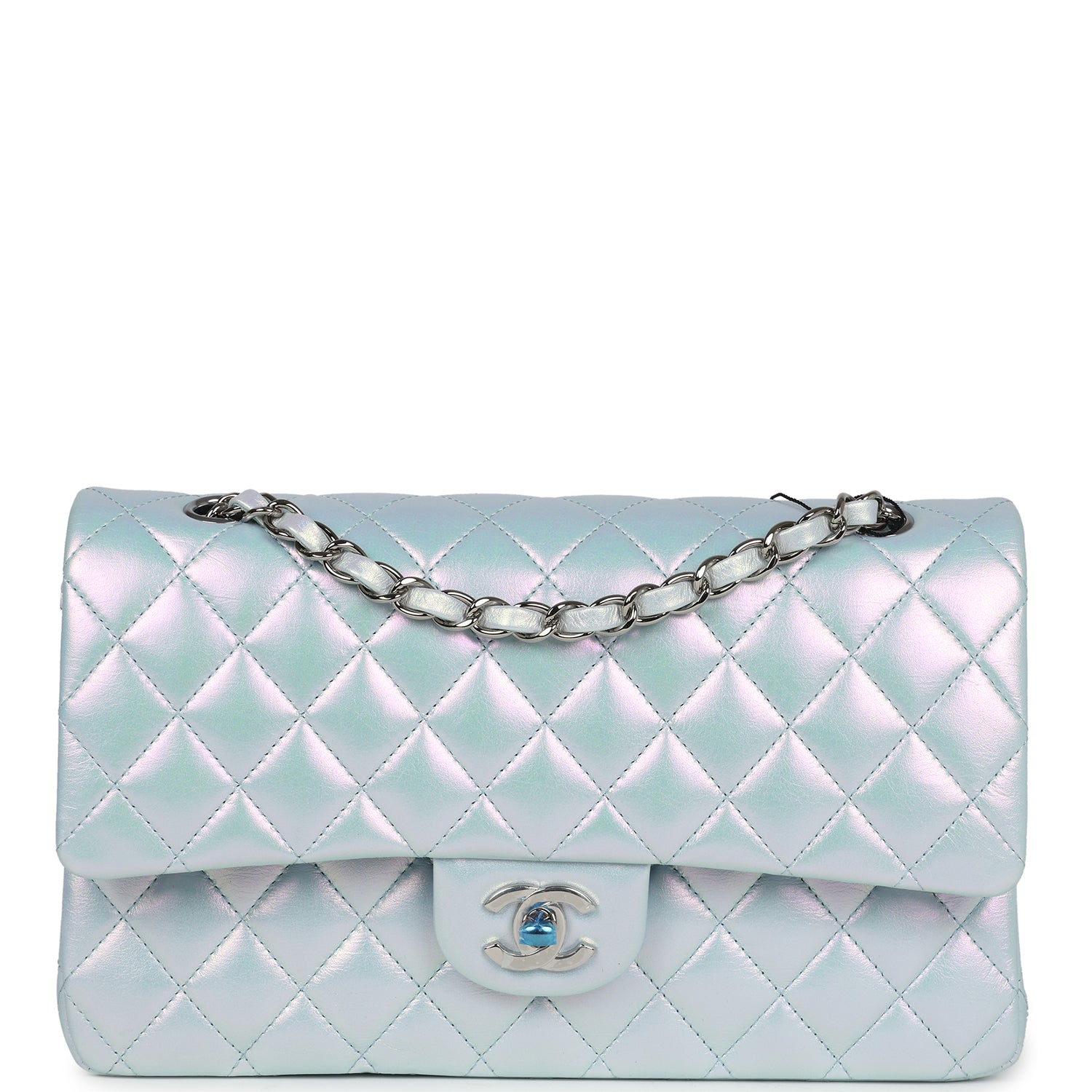 Regular price $1,900.00 Sale price $450.00 Save $1,450.00This medium Chanel Classic double flap bag is in blue iridescent calfskin leather with silver tone hardware and features a front flap with signature CC turnlock closure, half moon back pocket, and adjustable interwoven gold tone chain link and blue leather shoulder strap.