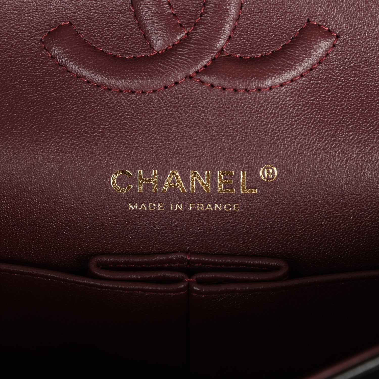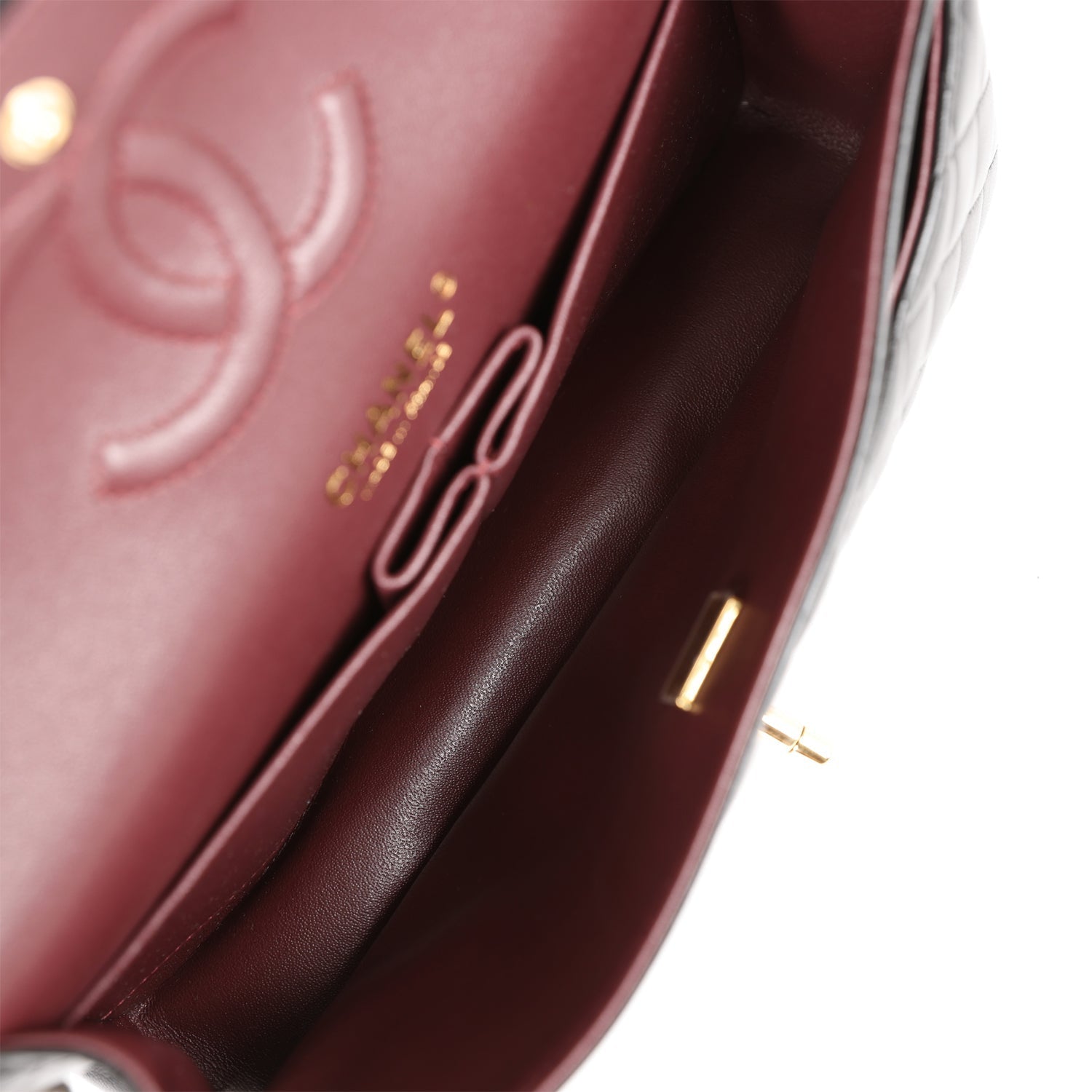 Regular price $1,950.00 Sale price $450.00 Save $1,500.00This Medium Classic Double Flap bag is in dark burgundy shiny caviar leather with light gold tone hardware and features a front flap with signature CC turnlock closure, half moon back pocket, and adjustable interwoven light gold tone chain link and dark burgundy leather shoulder strap.