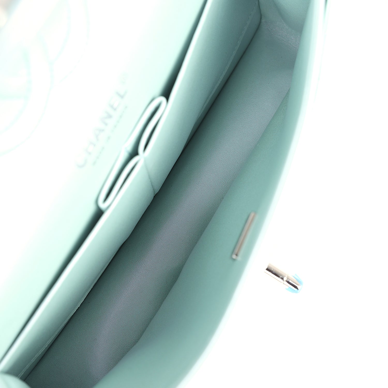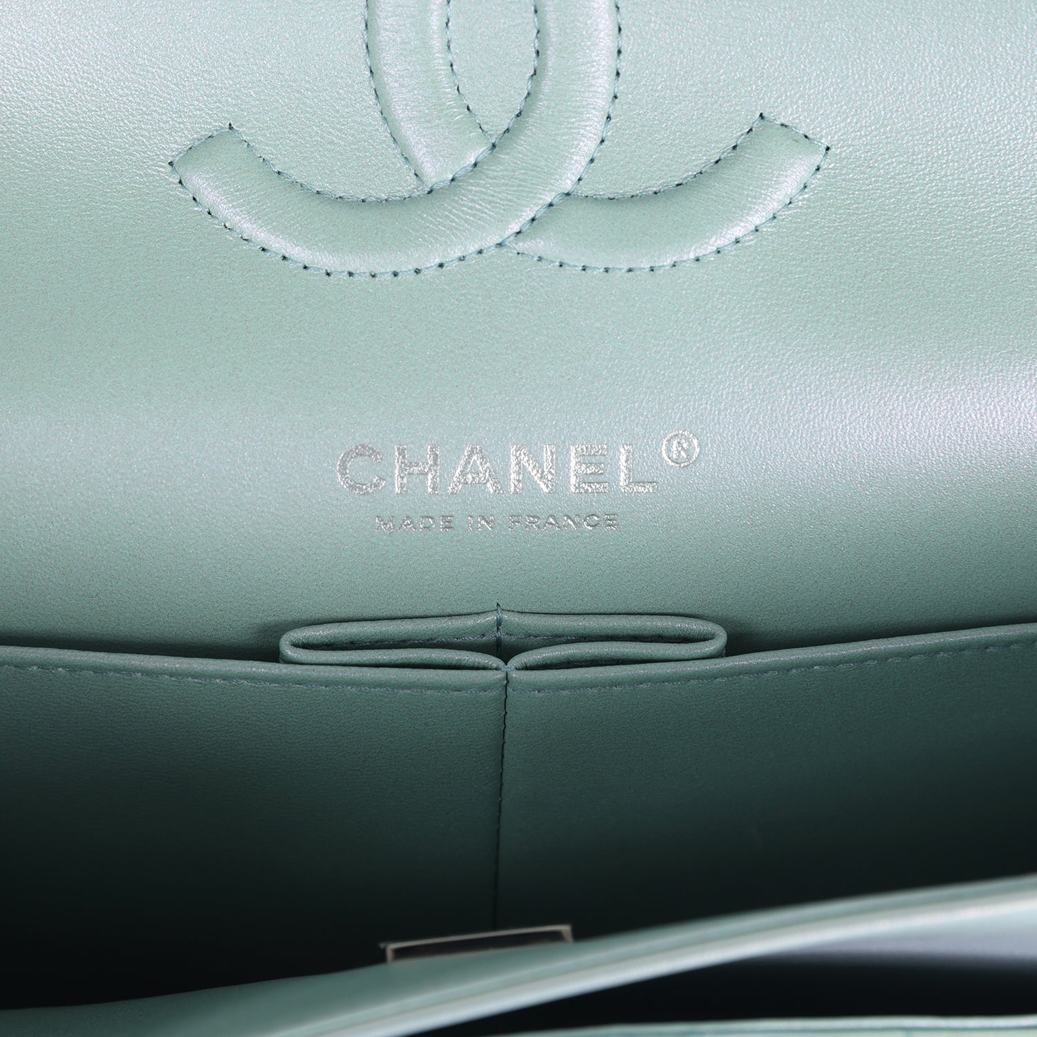 Regular price $2,010.00 Sale price $430.00 Save $1,580.00This Medium Classic Double Flap bag is in light green lambskin leather with light gold tone hardware and features a front flap with signature CC turnlock closure, half moon back pocket, and adjustable interwoven light gold tone chain link and light green leather shoulder strap.