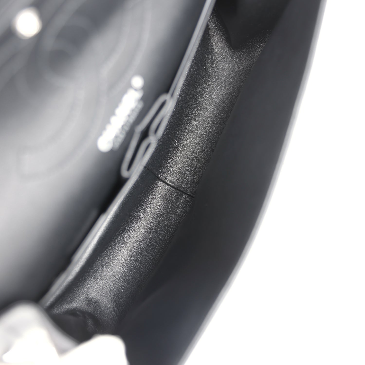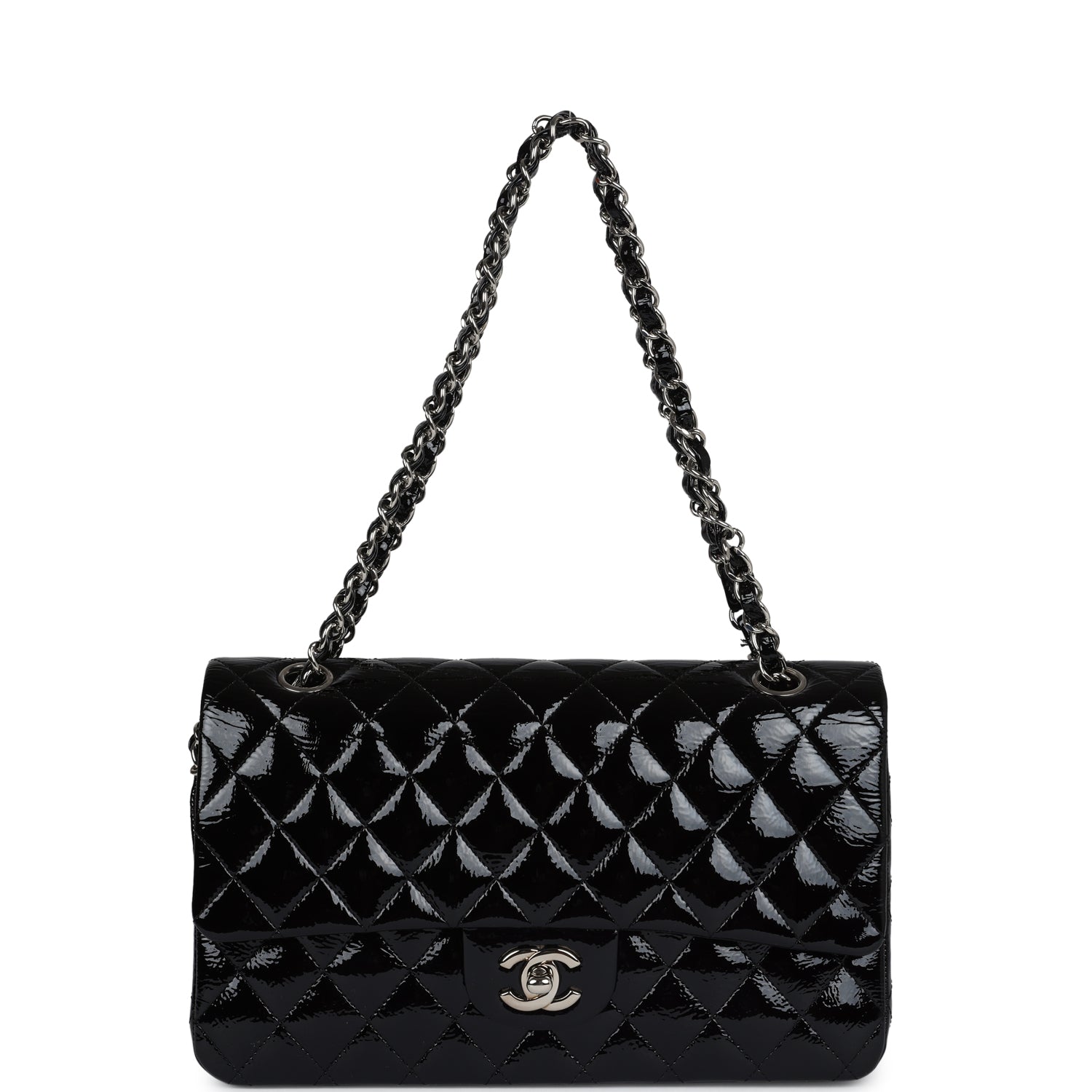 Regular price $19,850.00 Sale price $1,350.00 Save $18,500.00This Medium Classic Double Flap Bag is in black crumpled patent leather with silver hardware, front flap with CC turnlock closure, half moon back pocket and adjustable interwoven silver chain link and black patent leather shoulder/crossbody strap.