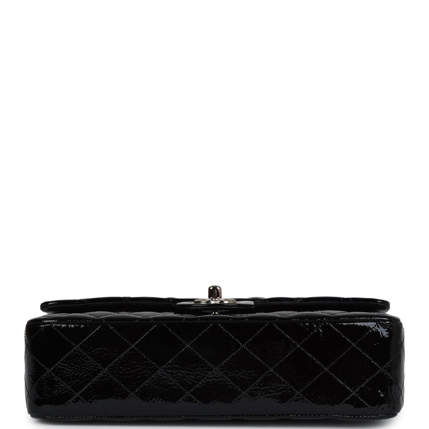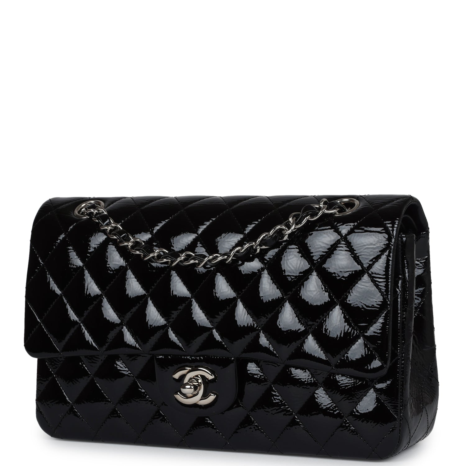 Chanel Medium Classic Double Flap Bag Black Crumpled Patent Leather Silver Hardware