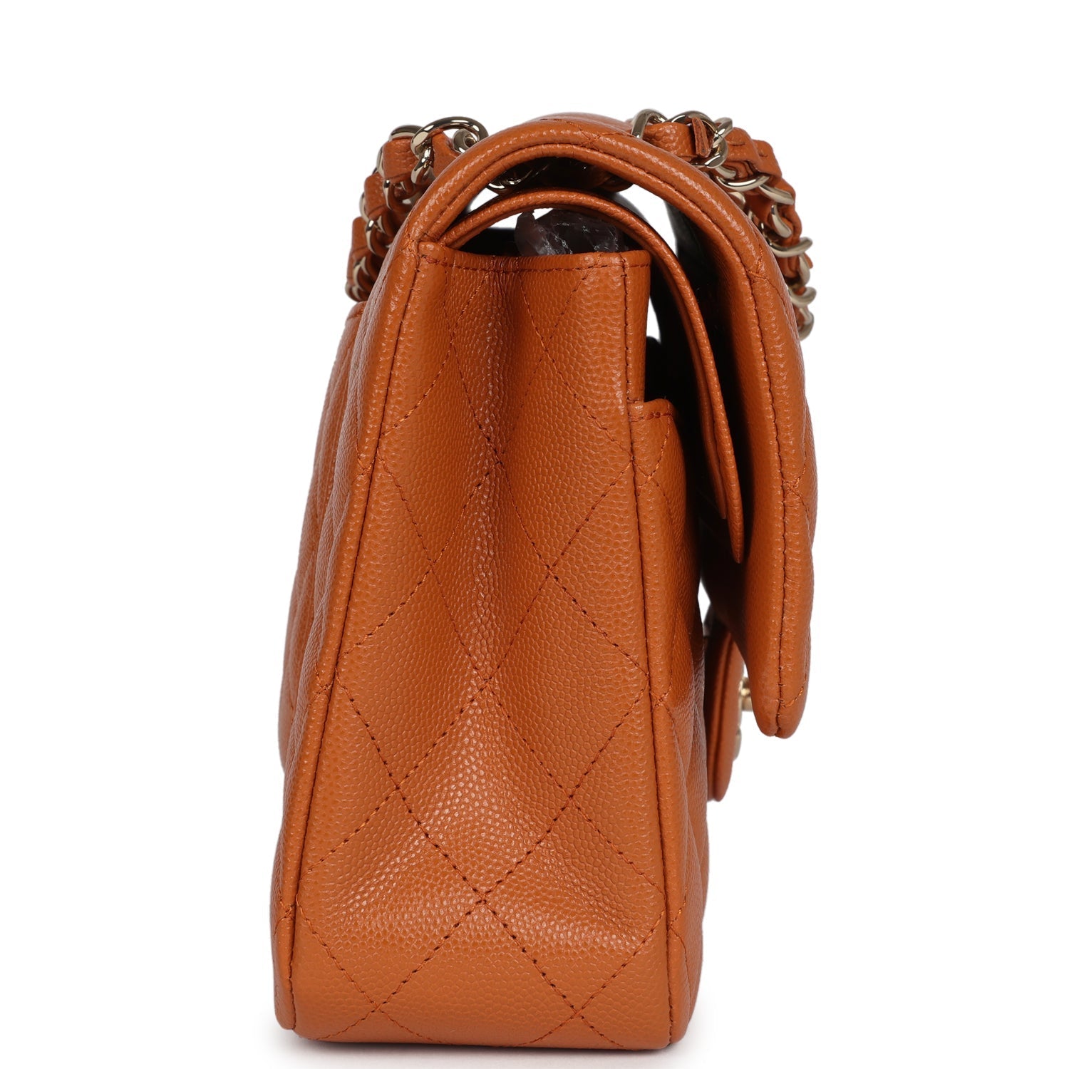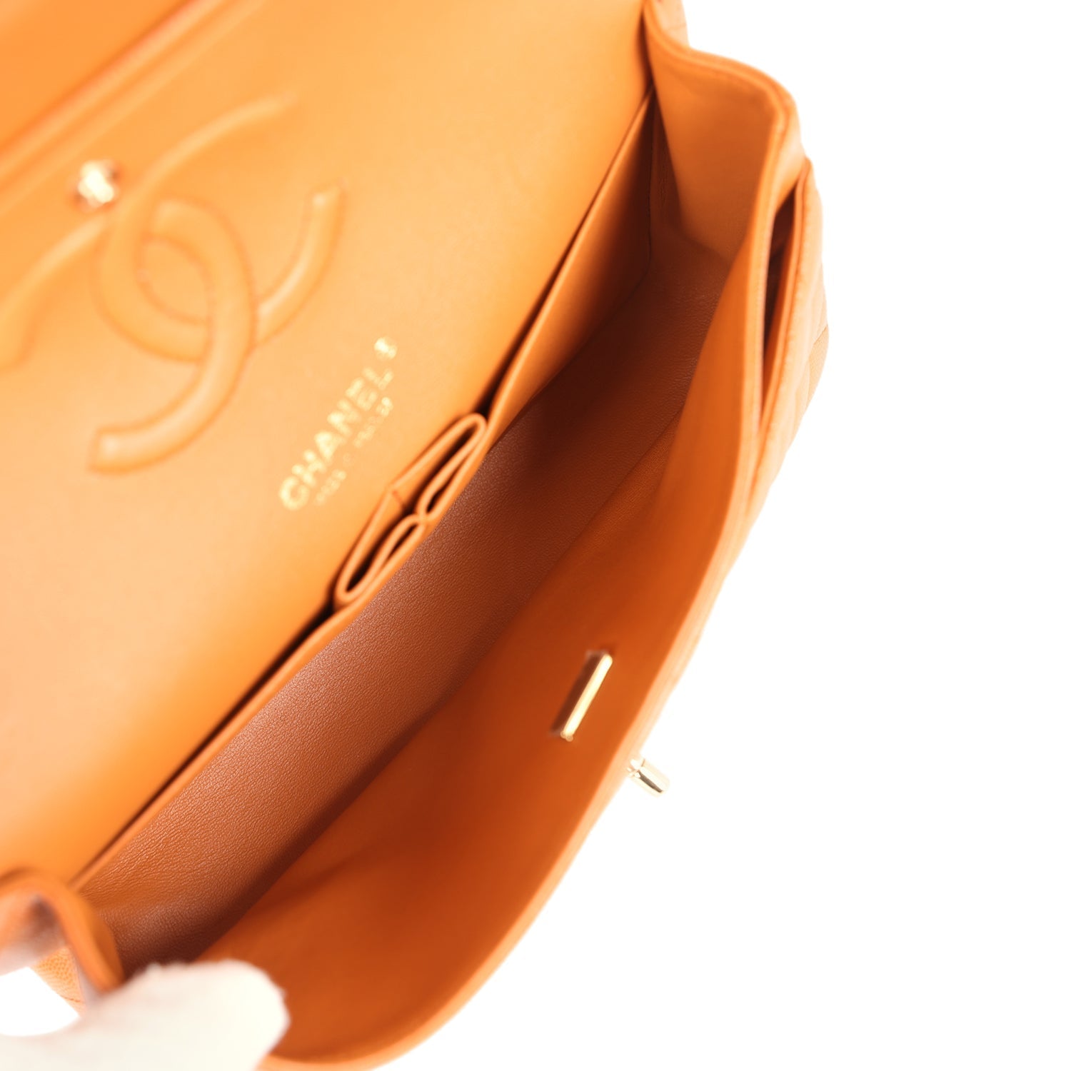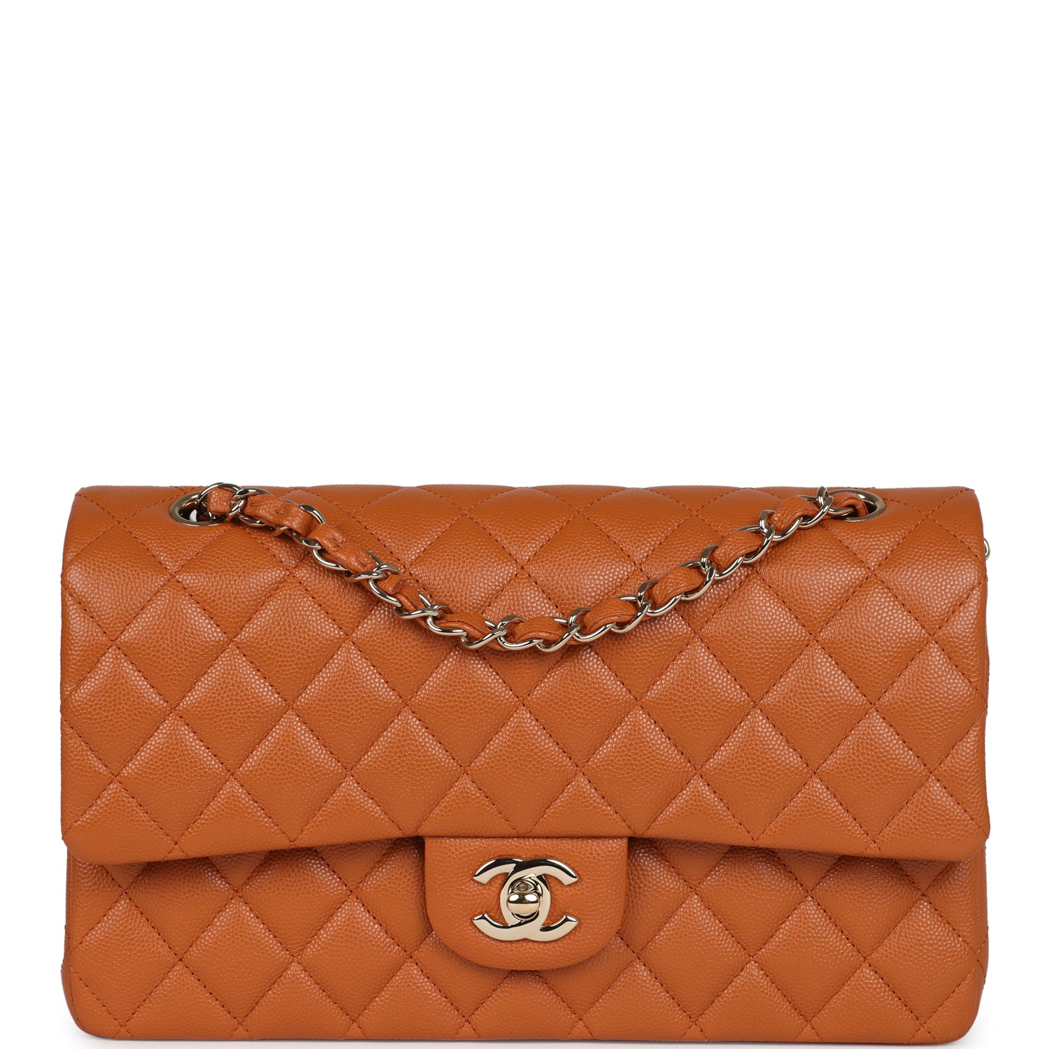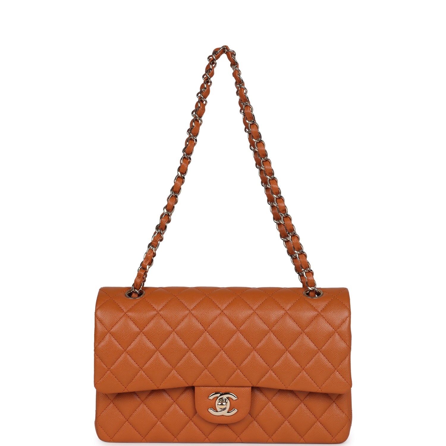 Regular price $1,910.00 Sale price $450.00 Save $1,460.00This Medium Classic Double Flap bag is in caramel brown caviar leather with light gold tone hardware and features a front flap with signature CC turnlock closure, half moon back pocket, and adjustable interwoven light gold tone chain link and caramel leather shoulder strap.