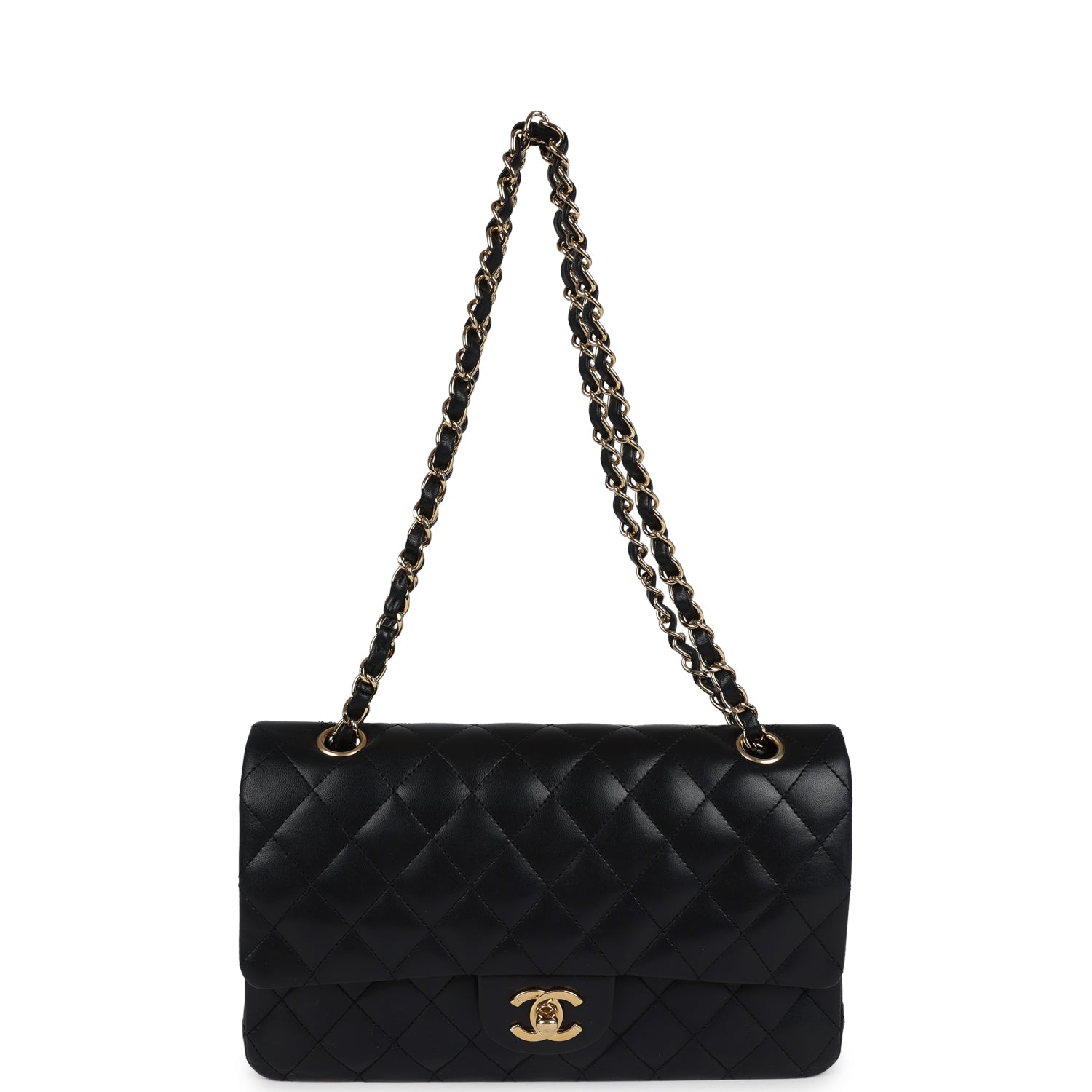 Regular price $1,750.00 Sale price $440.00 Save $1,310.00This Medium Classic Double Flap bag is in Black lambskin leather with gold tone hardware and features a front flap with signature CC turnlock closure, half moon back pocket, and adjustable interwoven gold tone chain link and black leather shoulder strap.