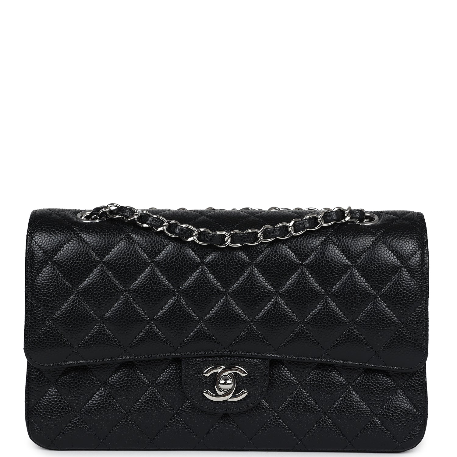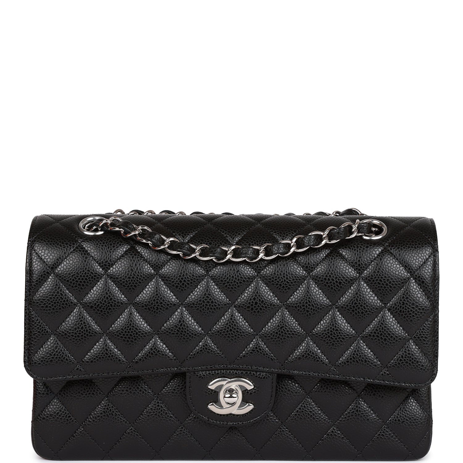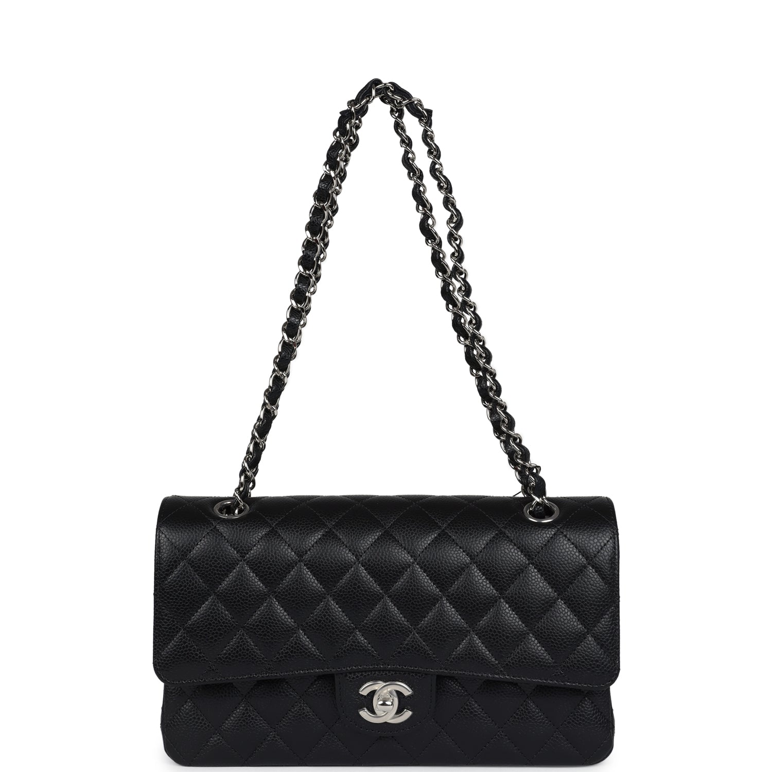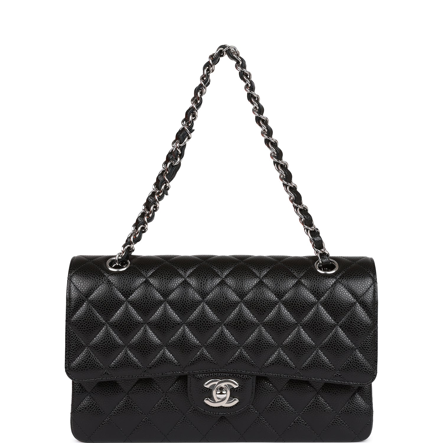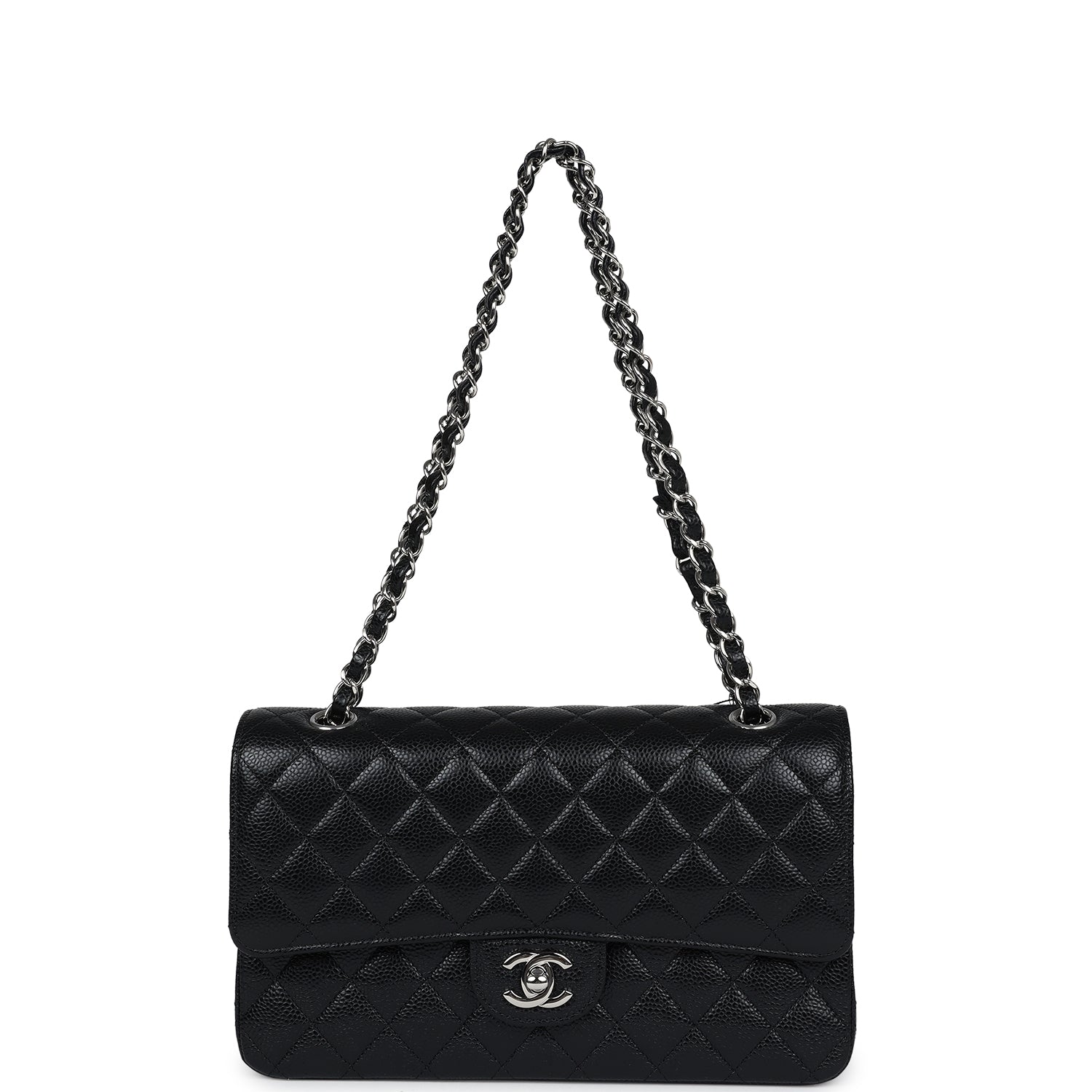 Regular price $17,420.00 Sale price $1,220.00 Save $16,200.00This medium classic double flap bag is in black caviar leather with silver hardware and features a front flap with signature CC turnlock closure, half moon back pocket, and adjustable interwoven silver tone chain link and black leather shoulder strap.
