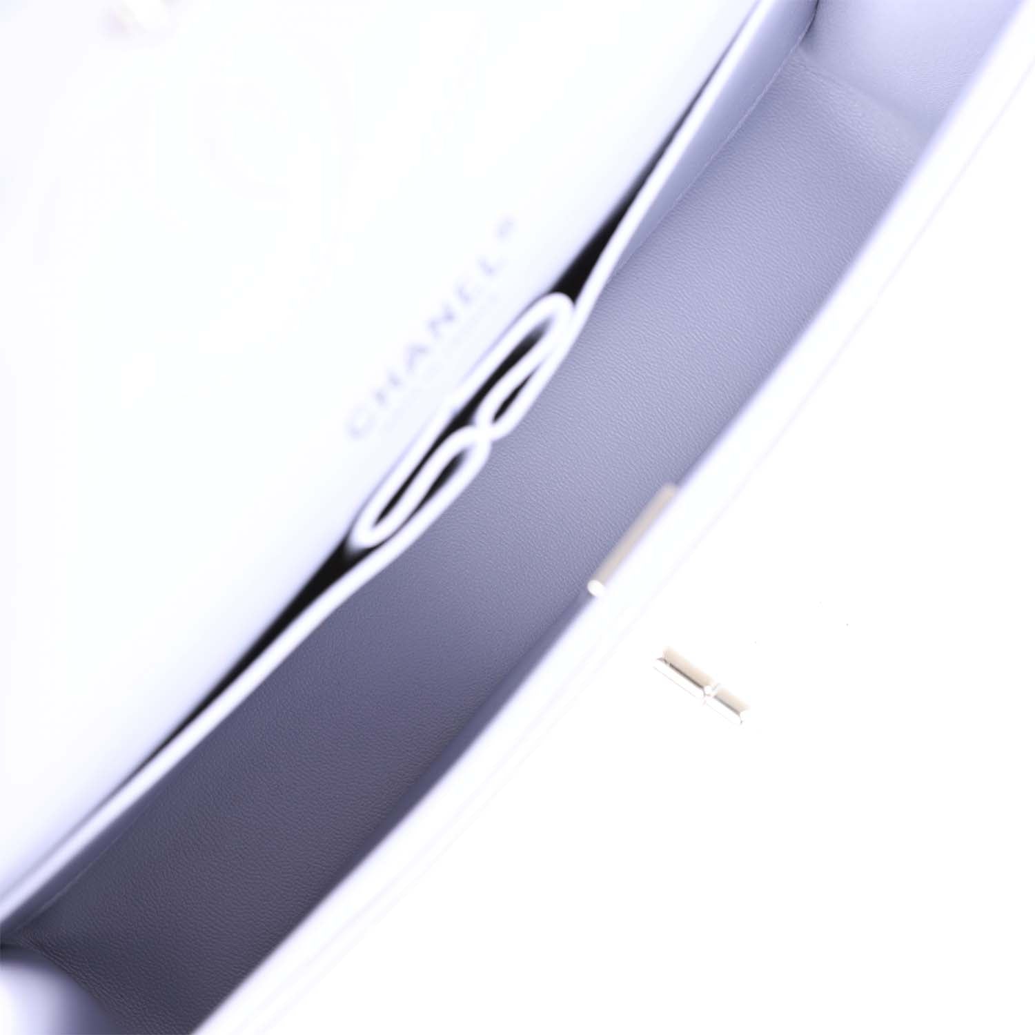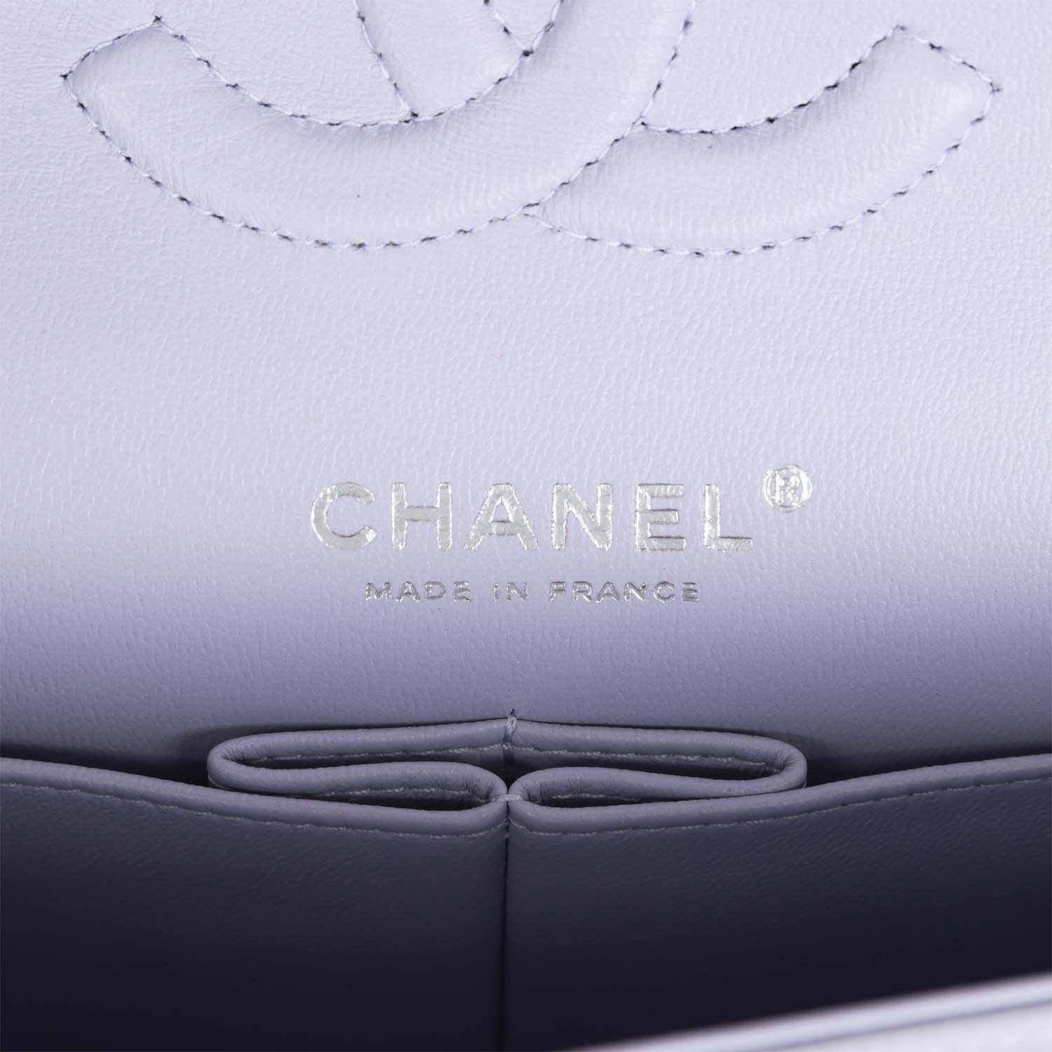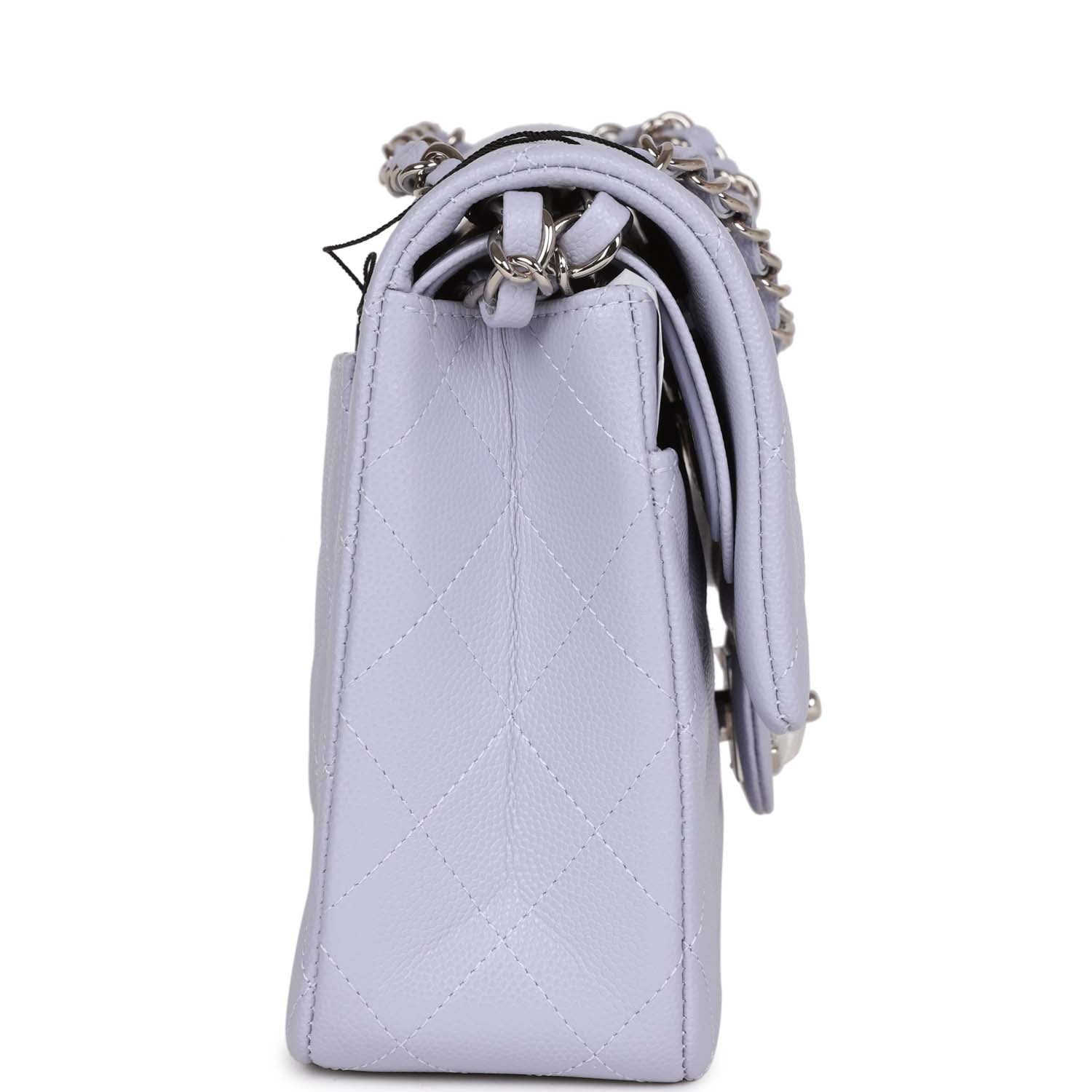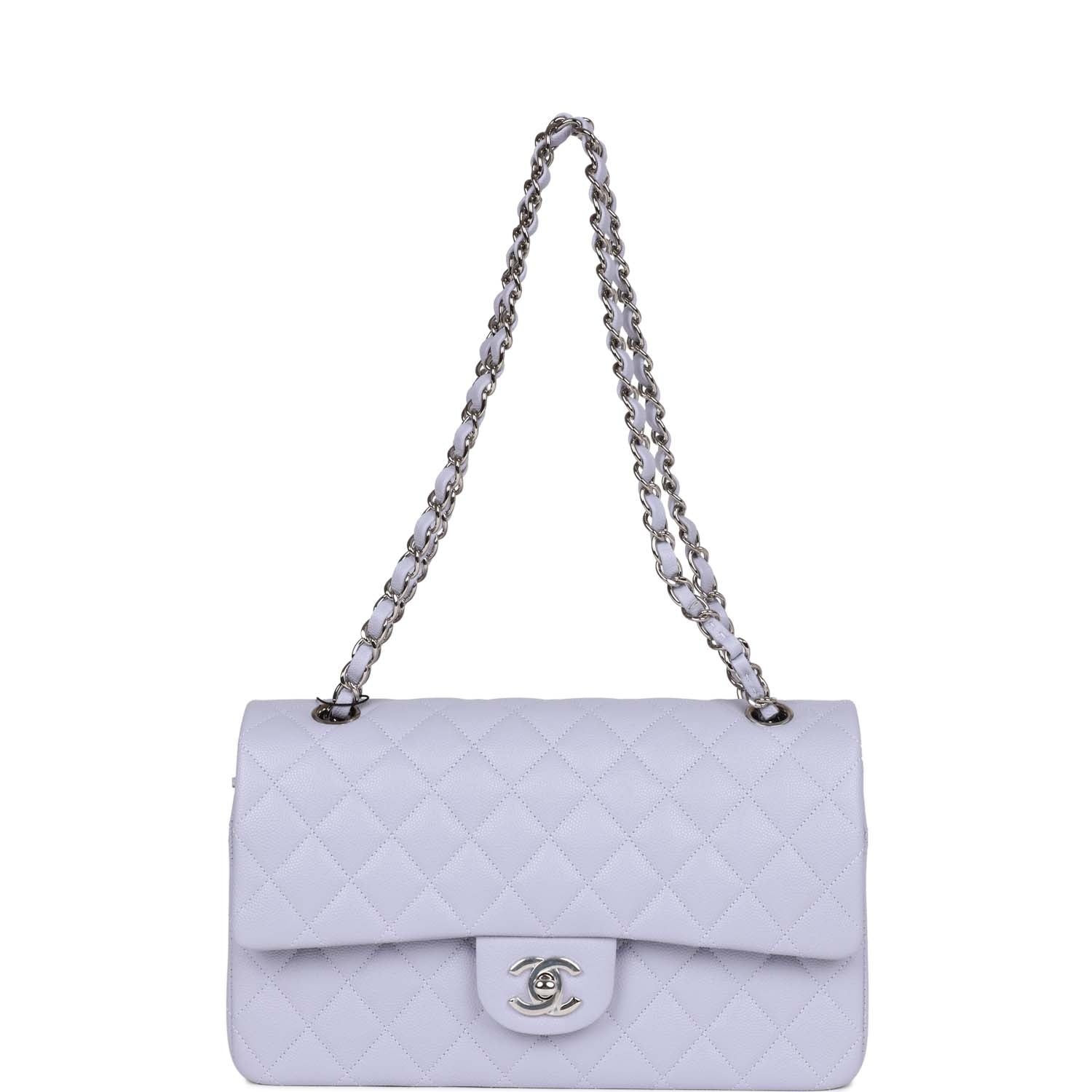 Regular price $1,970.00 Sale price $440.00 Save $1,530.00This Medium Classic Double Flap bag is in Light Purple caviar leather with silver hardware, front flap with CC turnlock closure, half moon back pocket, interwoven silver tone chain link and light purple leather shoulder/crossbody strap.
