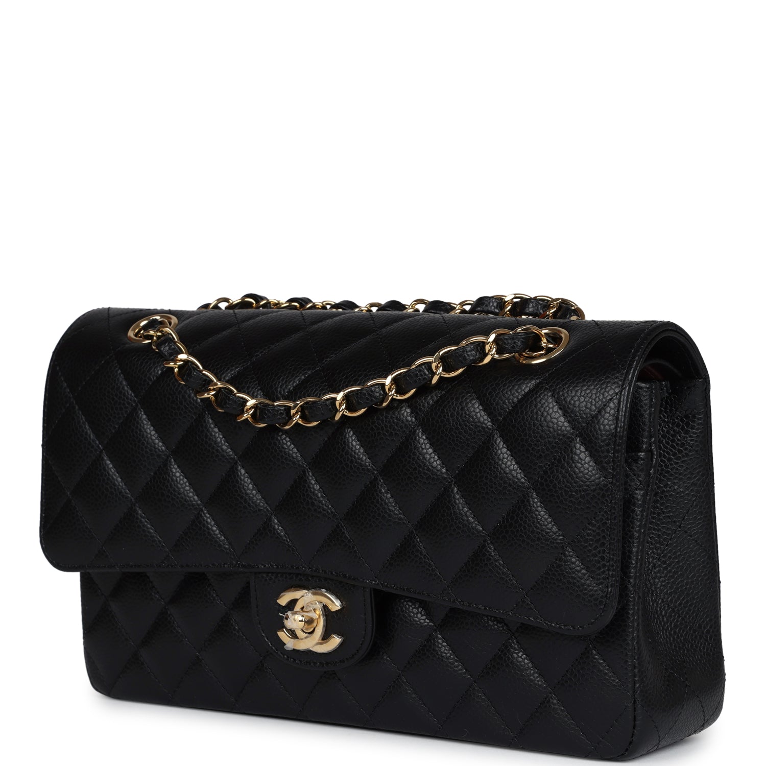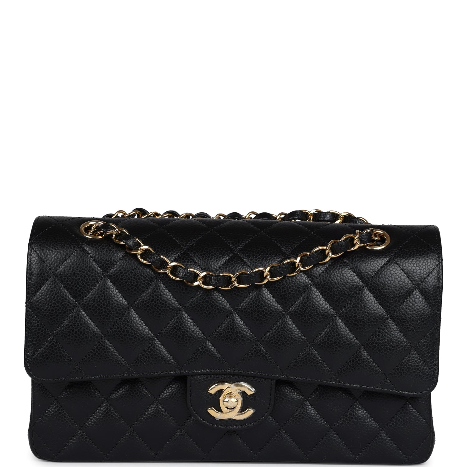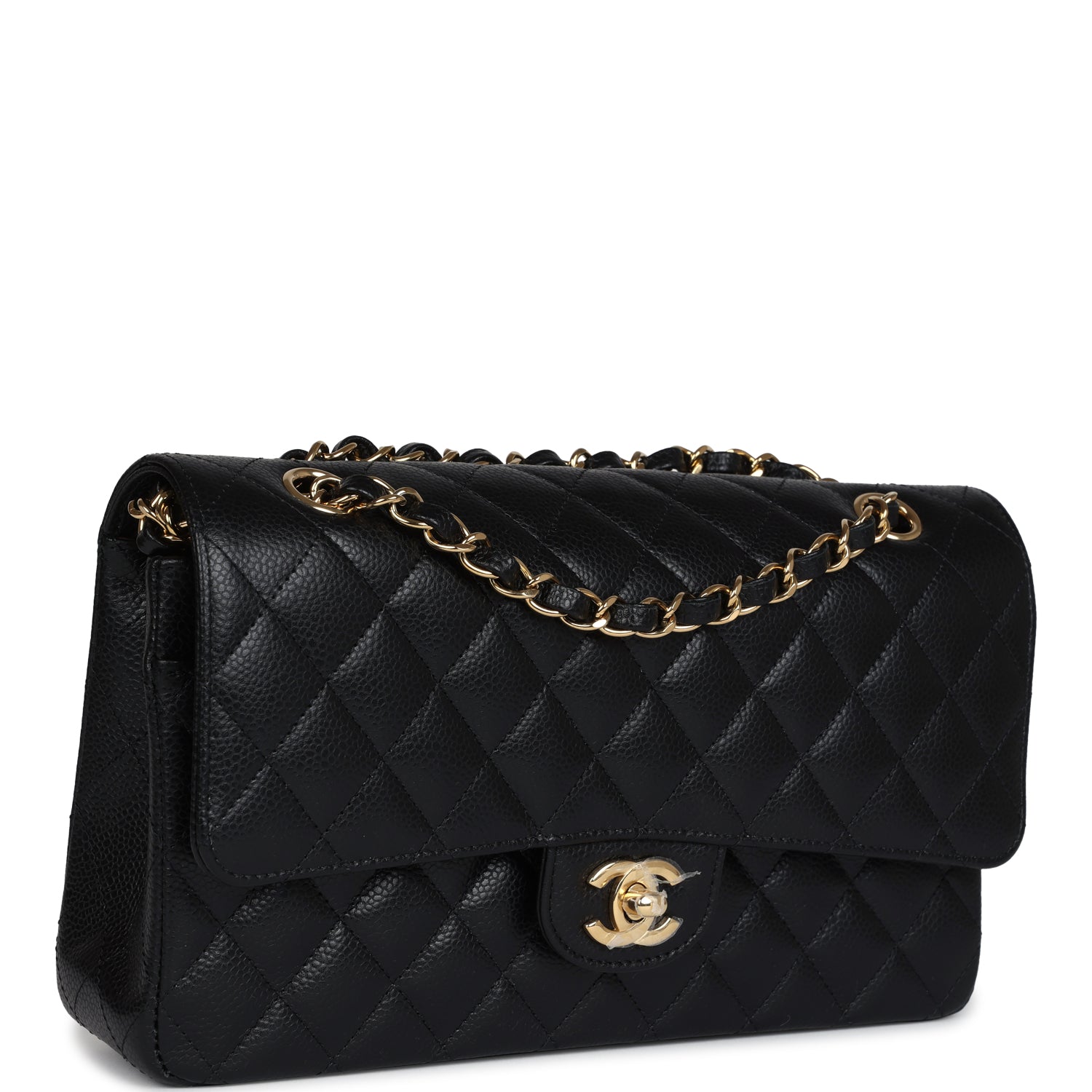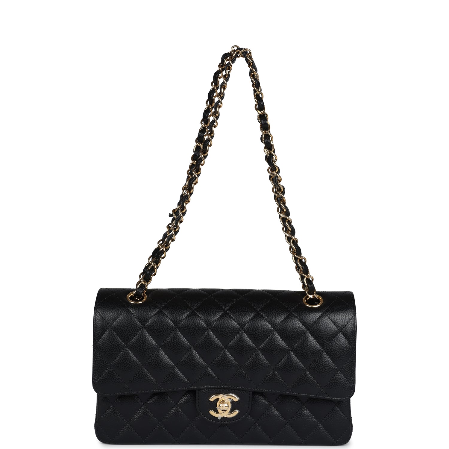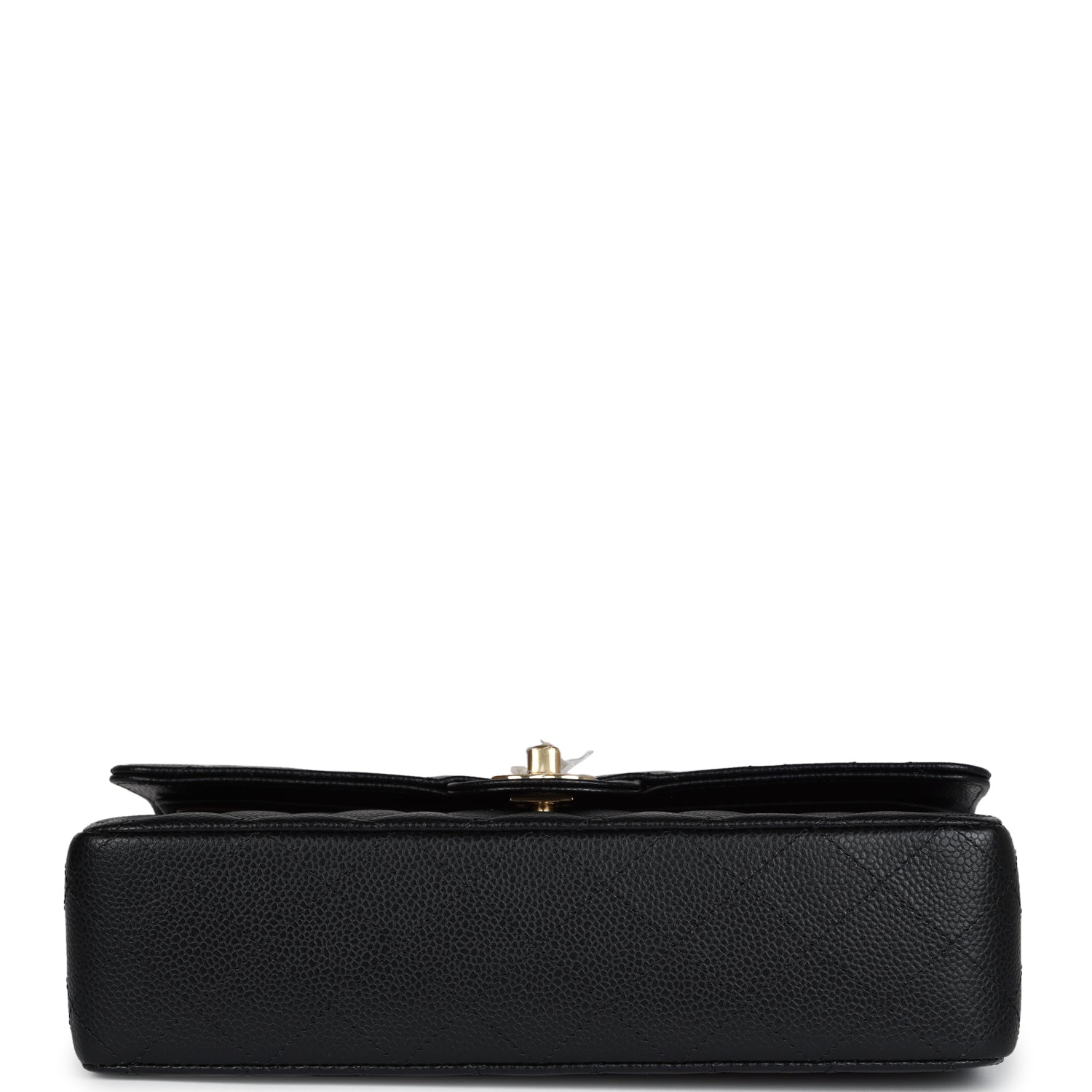 This Medium Classic Double Flap Bag is in black caviar leather with gold hardware, front flap with CC turnlock closure, tonal stitching, half moon back pocket and an adjustable interwoven gold chain link and Black leather shoulder/crossbody strap.