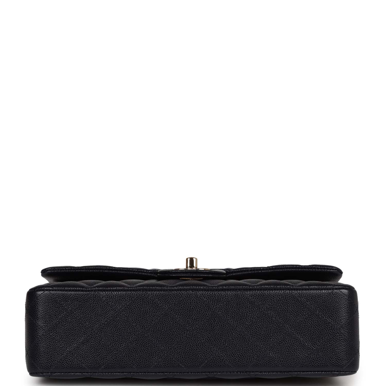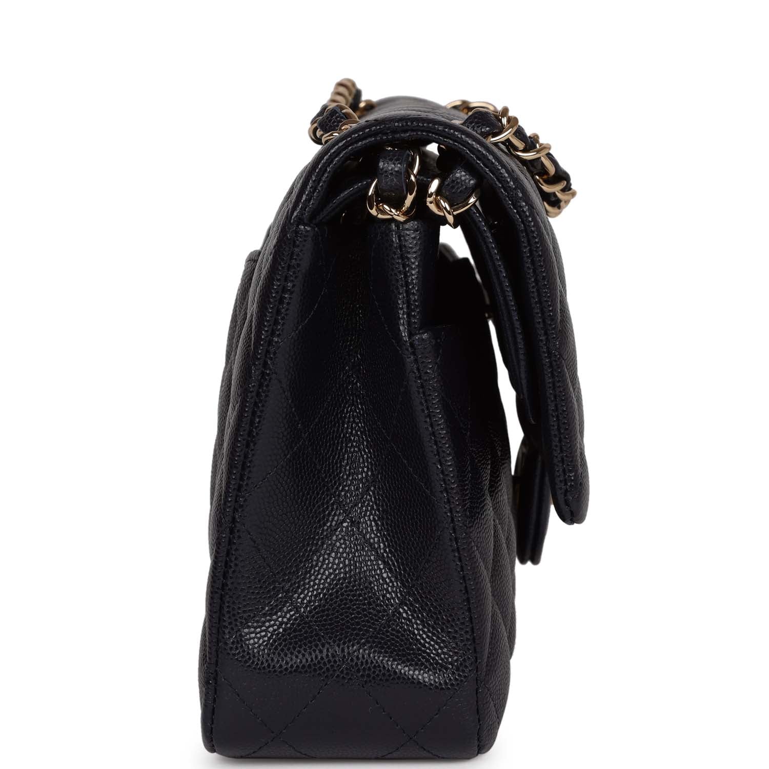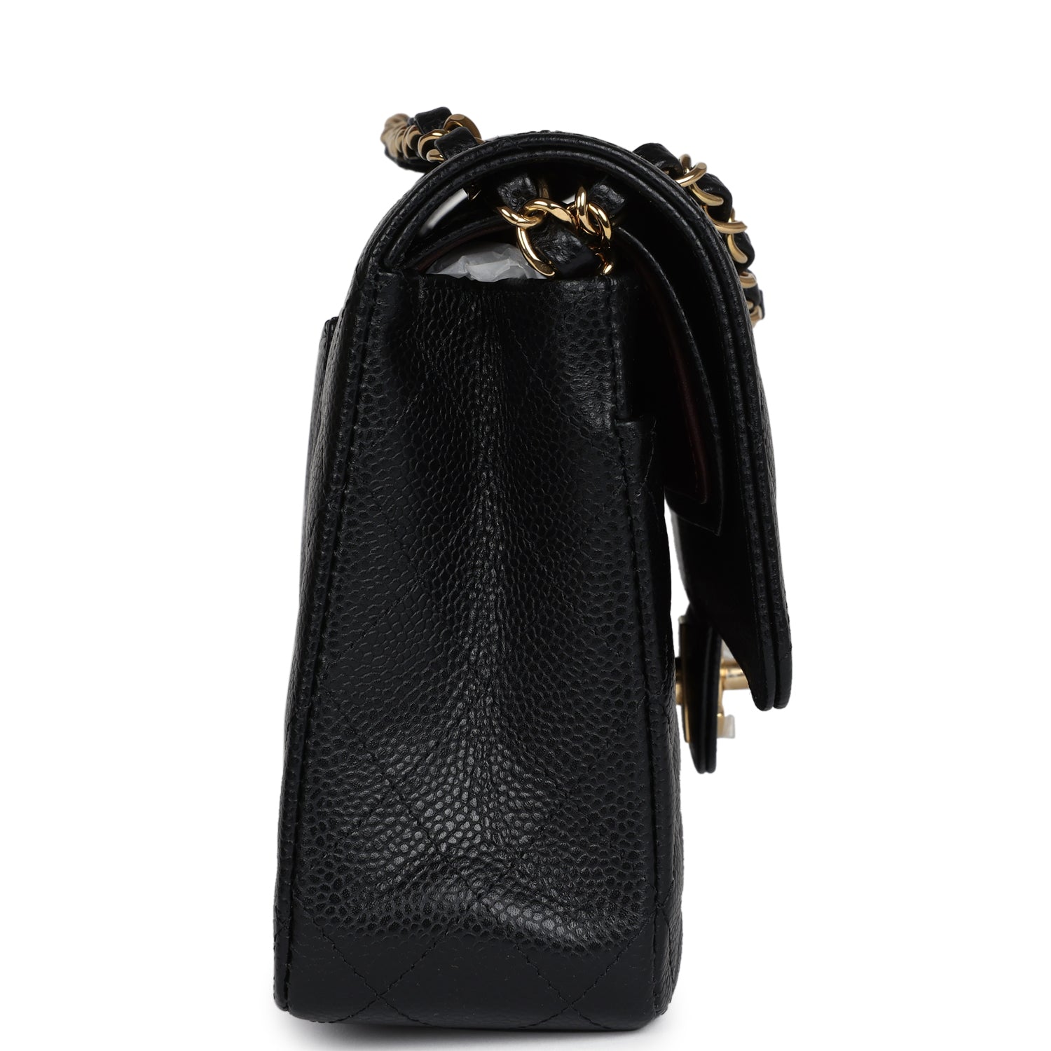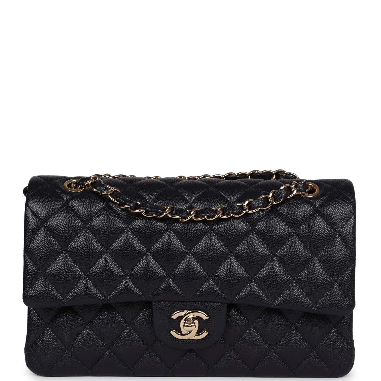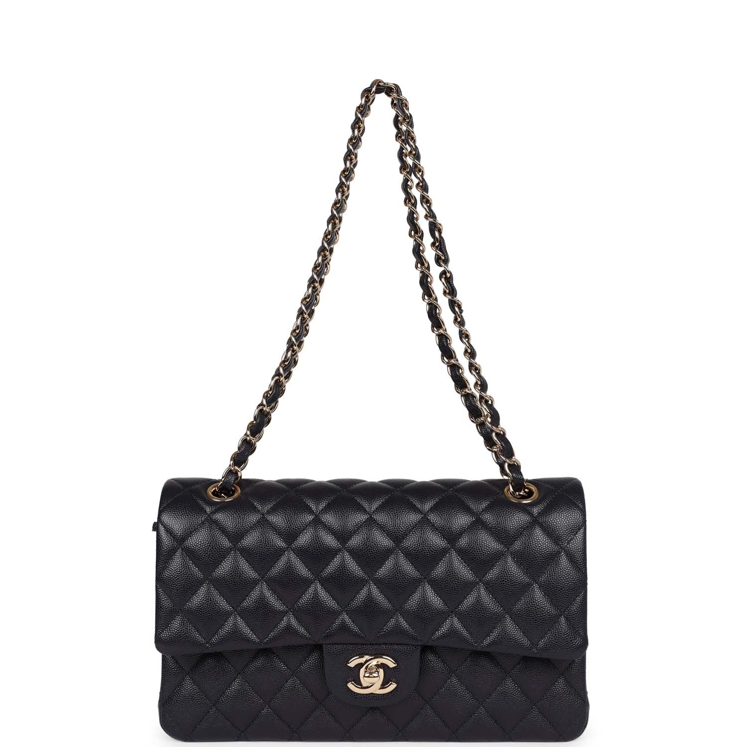This Medium Classic Double Flap Bag is in black caviar leather with gold hardware, front flap with CC turnlock closure, tonal stitching, half moon back pocket and an adjustable interwoven gold chain link and Black leather shoulder/crossbody strap.