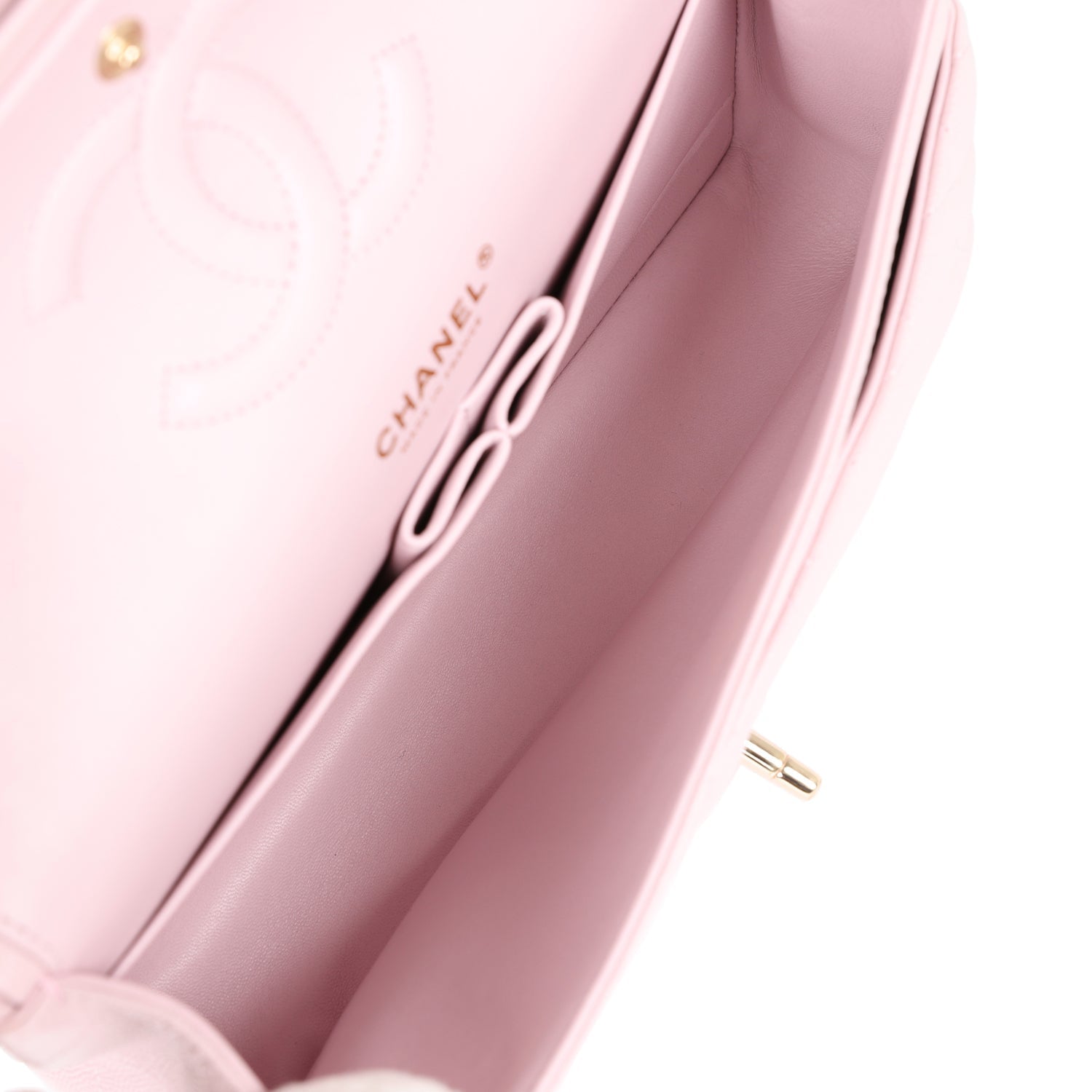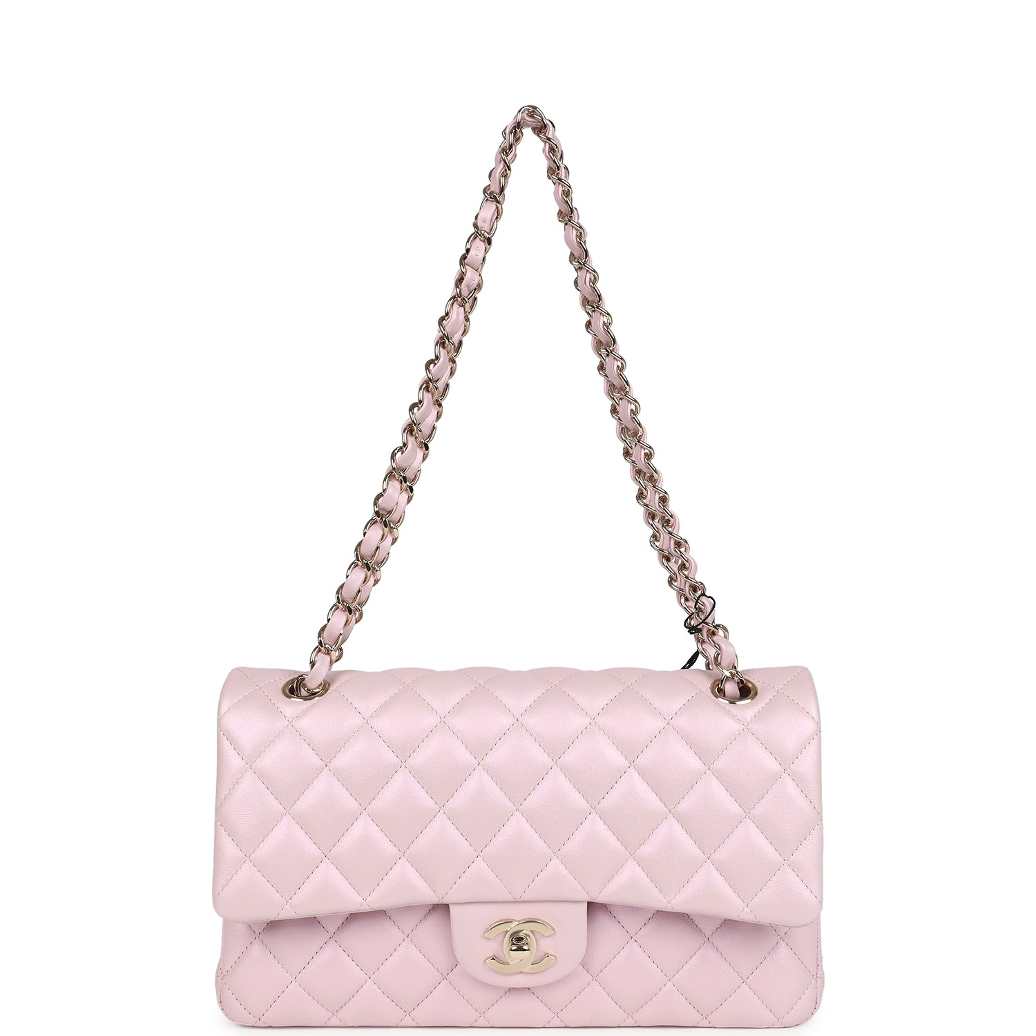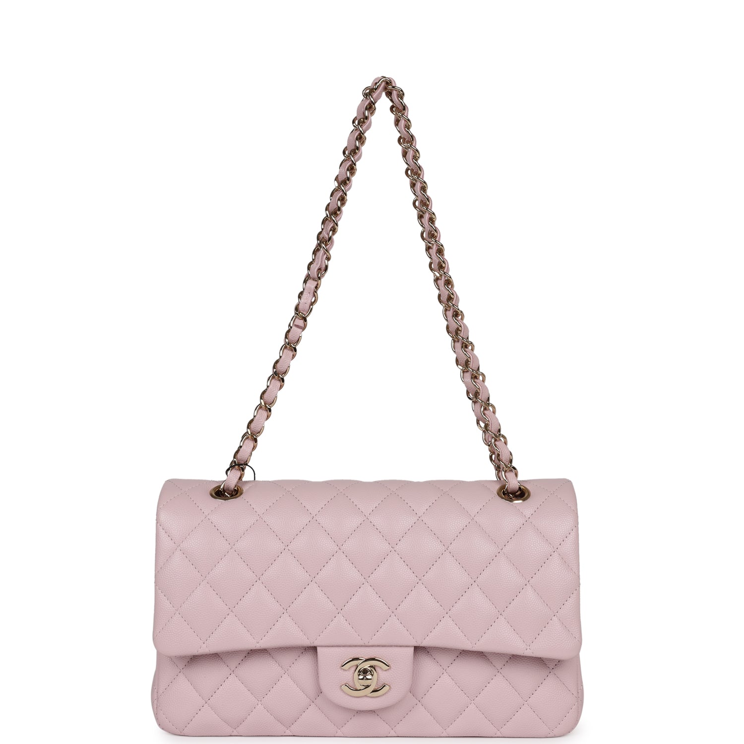 Regular price $1,630.00 Sale price $430.00 Save $1,200.00This Medium Classic Double Flap bag is in Light Pink caviar leather with light gold tone hardware and features a front flap with signature CC turnlock closure, half moon back pocket, and adjustable interwoven light gold tone chain link and light pink leather shoulder strap.