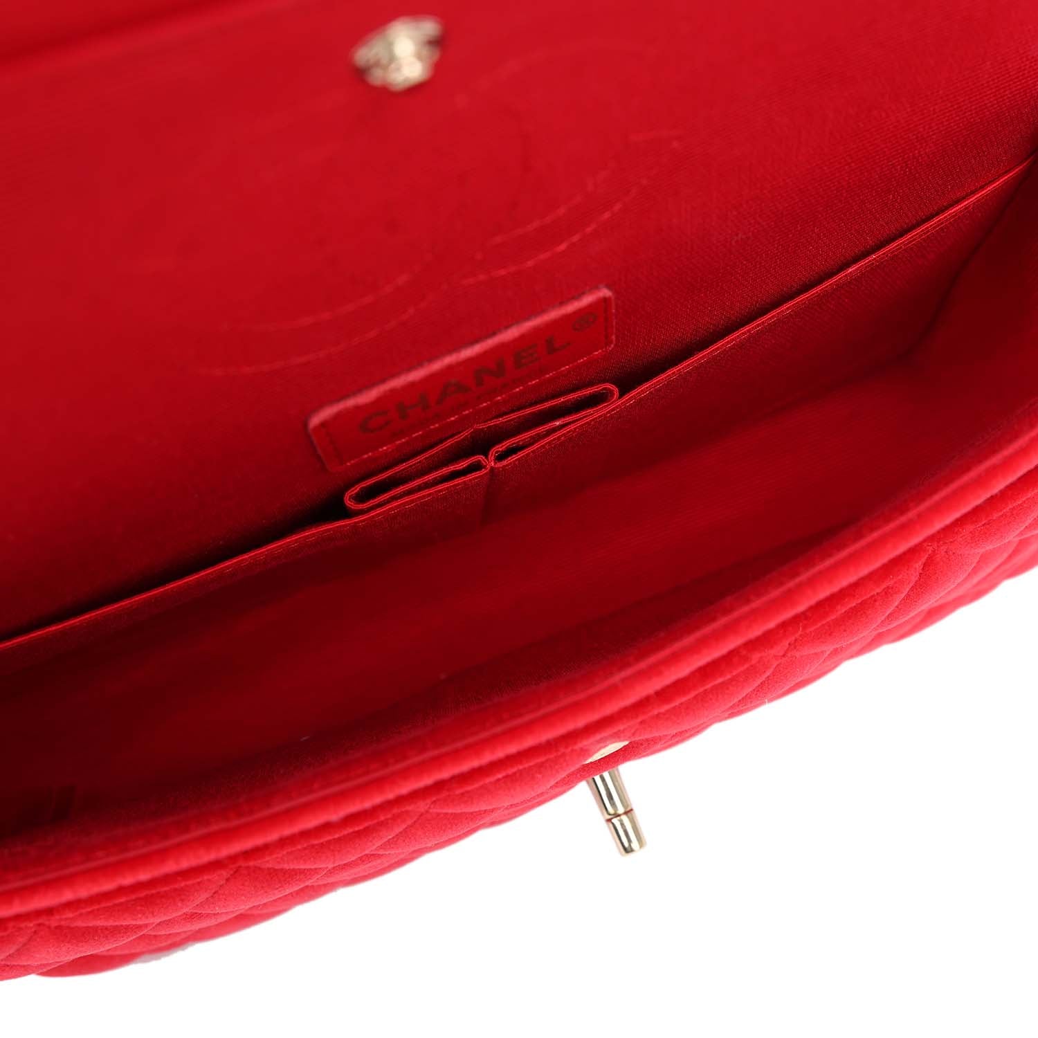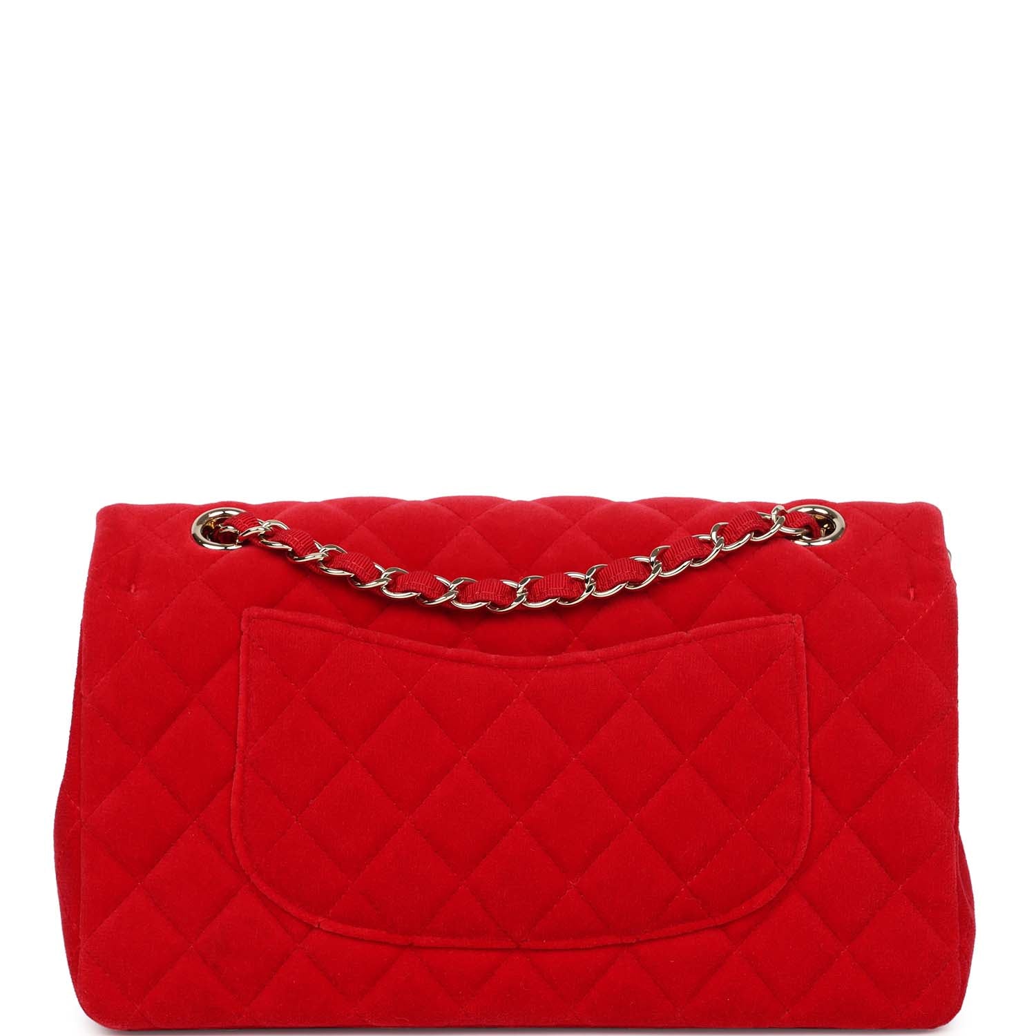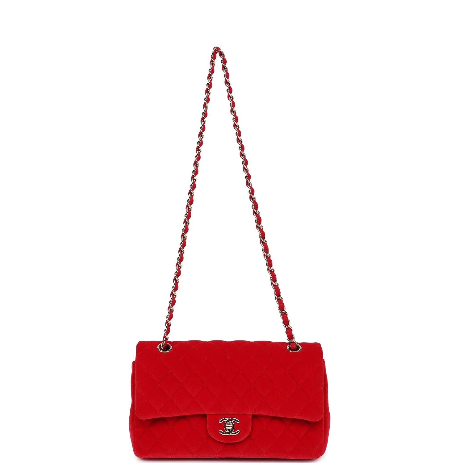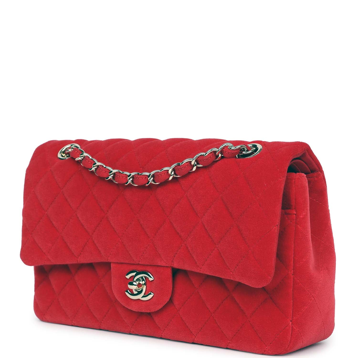 Regular price $1,620.00 Sale price $450.00 Save $1,170.00This Medium Classic Double Flap Bag is in red velvet fabric with light gold tone hardware featuring, signature diamond quilt, front flap with CC turnlock closure, half moon back pocket and an adjustable interwoven light gold tone chainlink and Red grossgrain shoulder/crossbody strap.