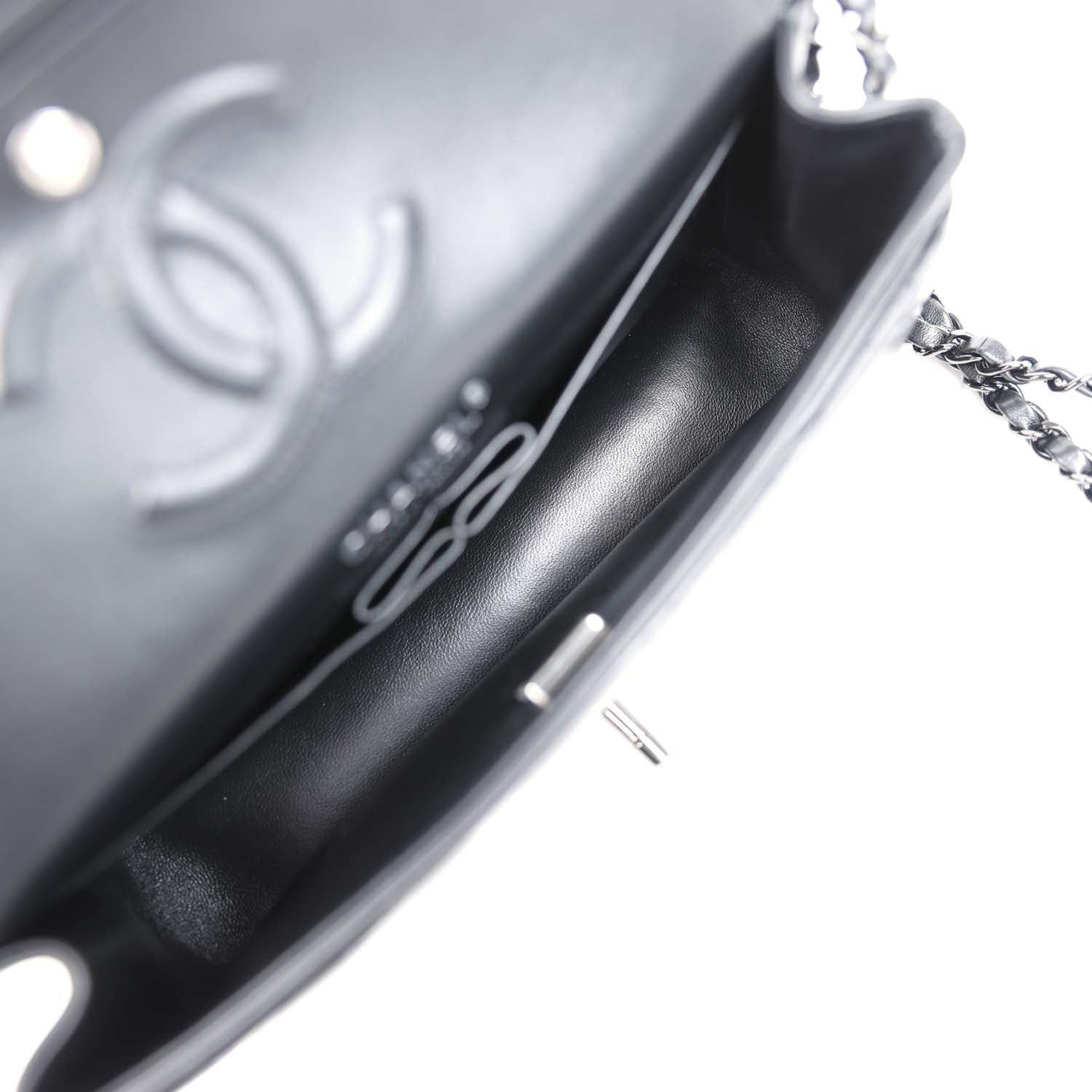 Regular price $1,420.00 Sale price $479.99 Save $940.01This medium classic double flap bag is in black lambskin leather with silver hardware and features a front flap with signature CC turnlock closure, half moon back pocket, and adjustable interwoven silver tone chain link and black leather shoulder strap.