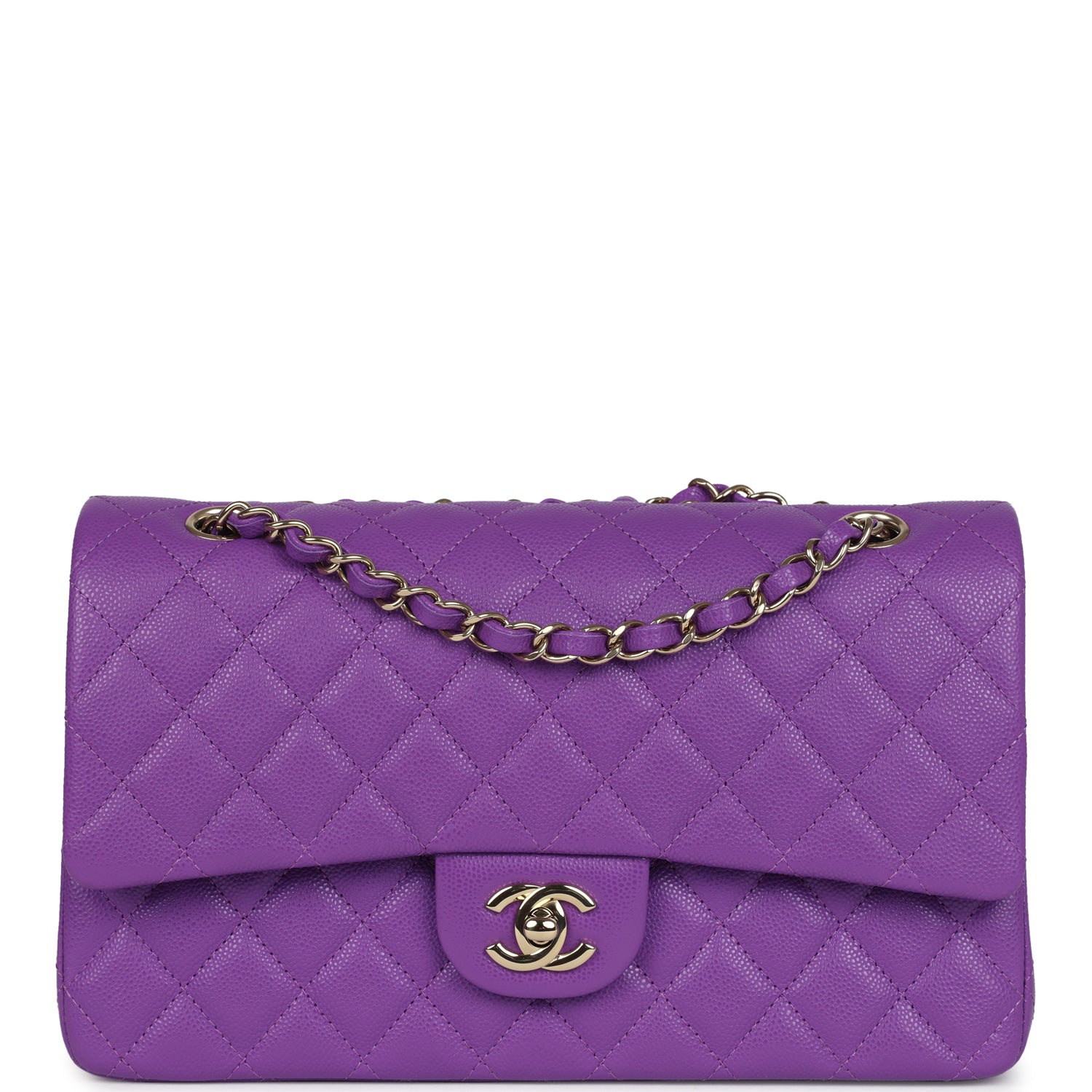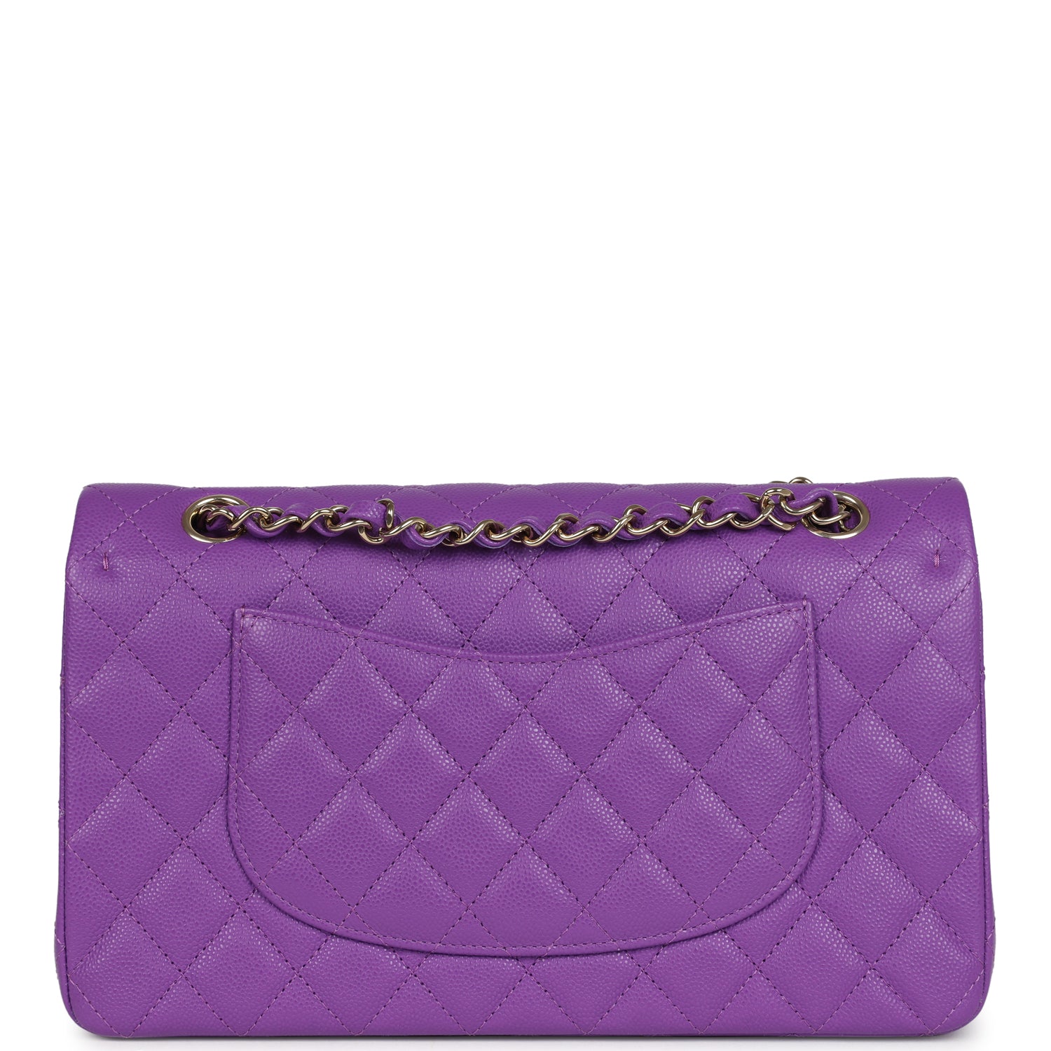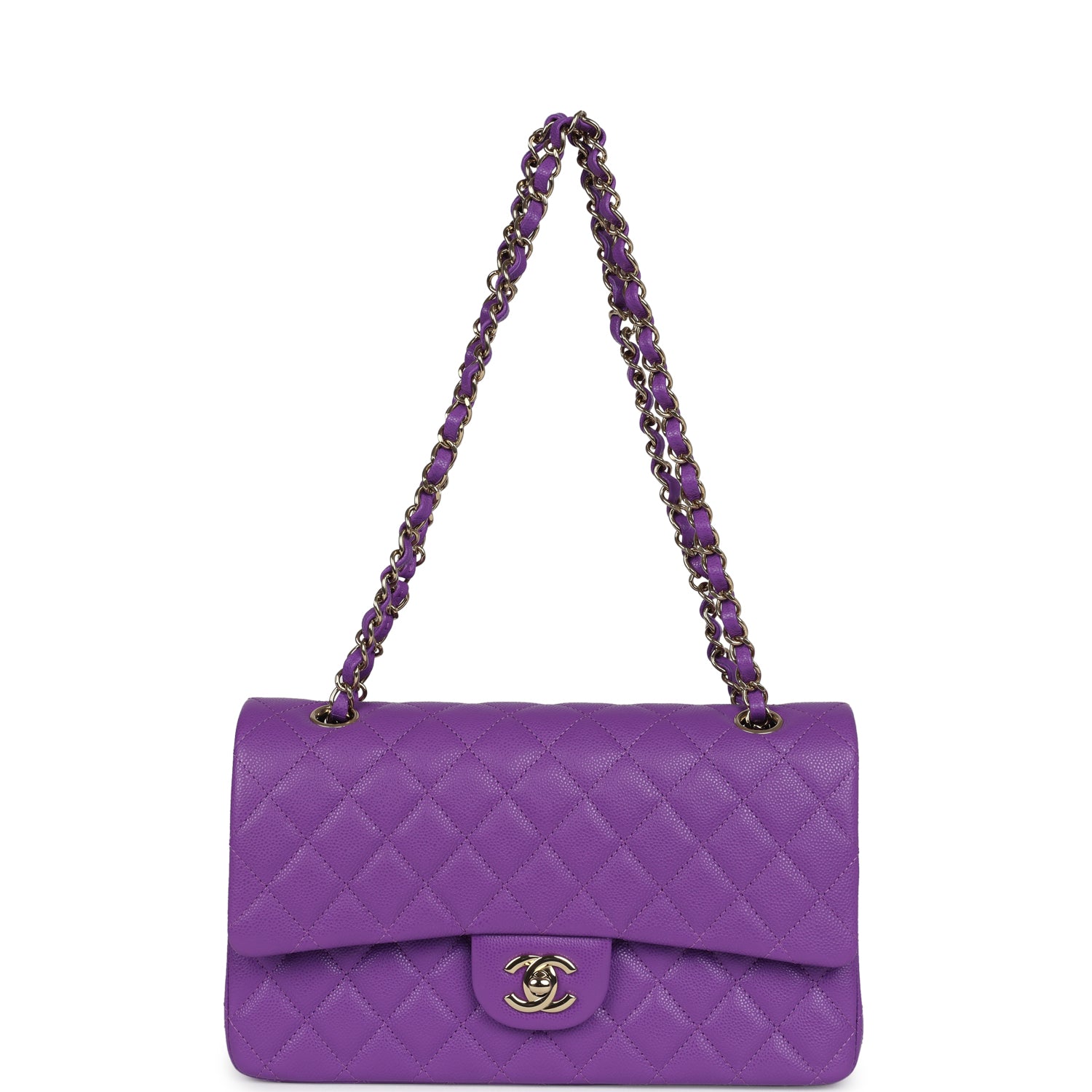 Regular price $1,620.00 Sale price $450.00 Save $1,170.00This Medium Classic Double Flap bag is in purple caviar leather with light gold tone hardware and features a front flap with signature CC turnlock closure, half moon back pocket, and adjustable interwoven light gold tone chain link and Purple leather shoulder strap.
