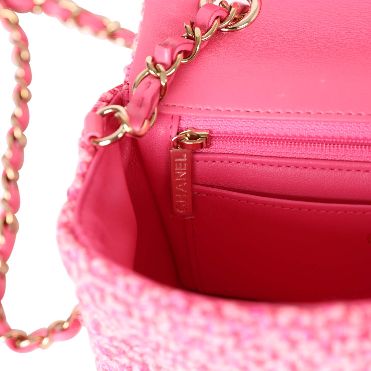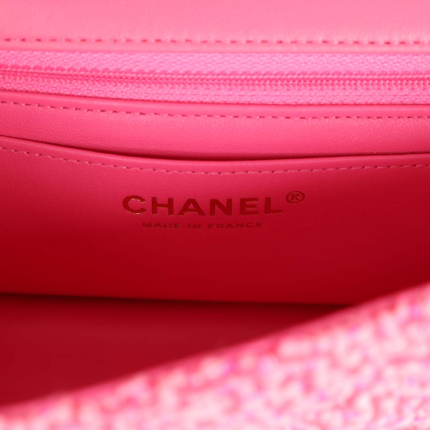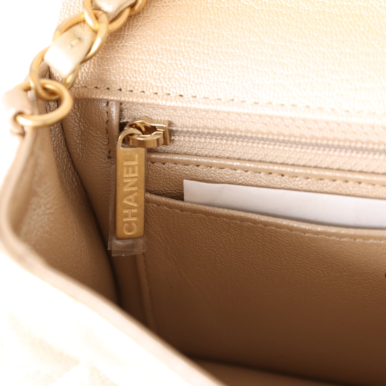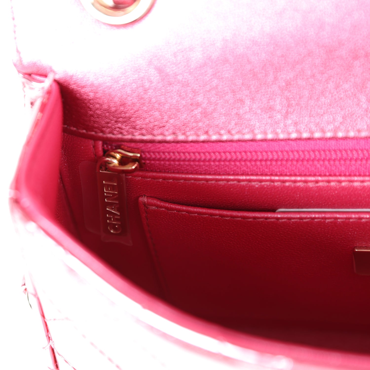 The interior is lined in Pink Metallic calfskin leather, one slip pocket with Chanel logo and one zippered pocket.