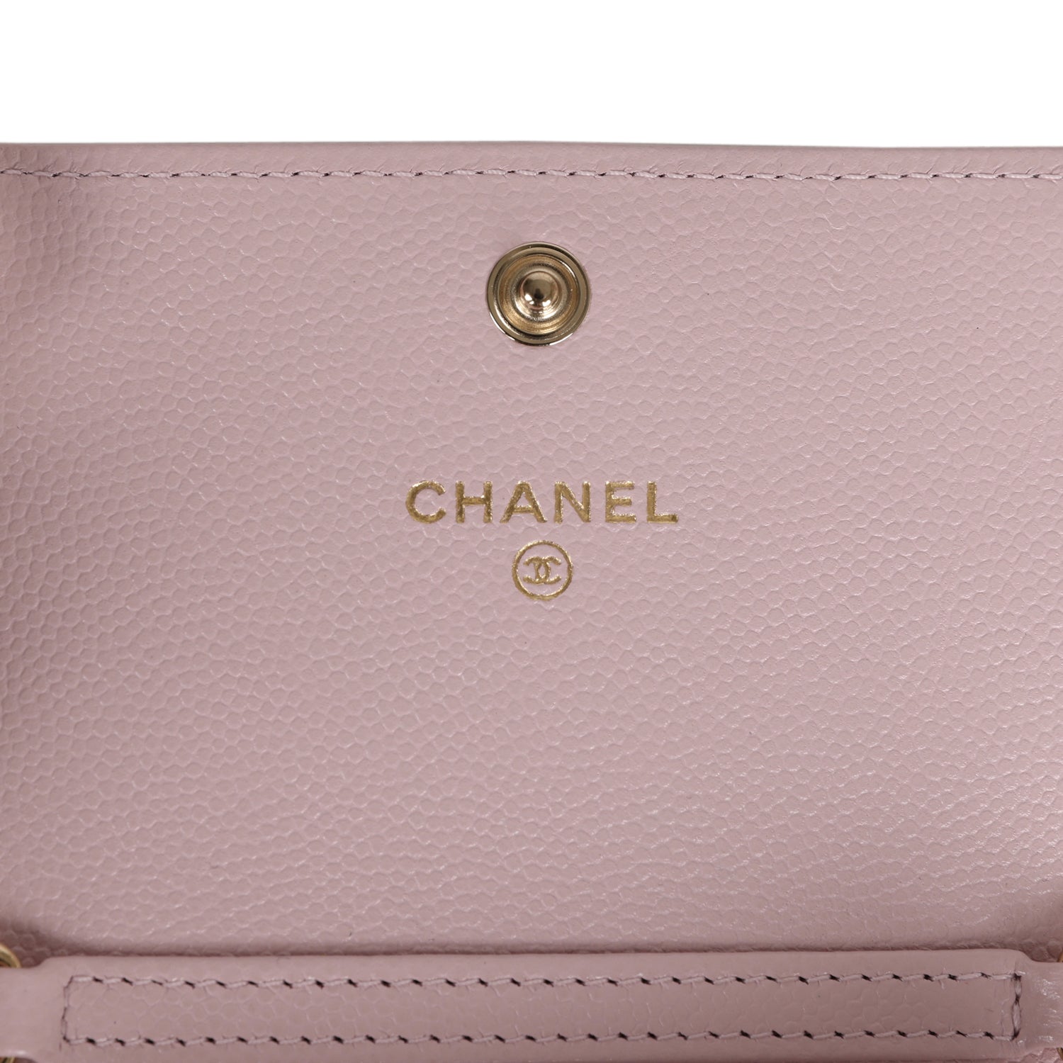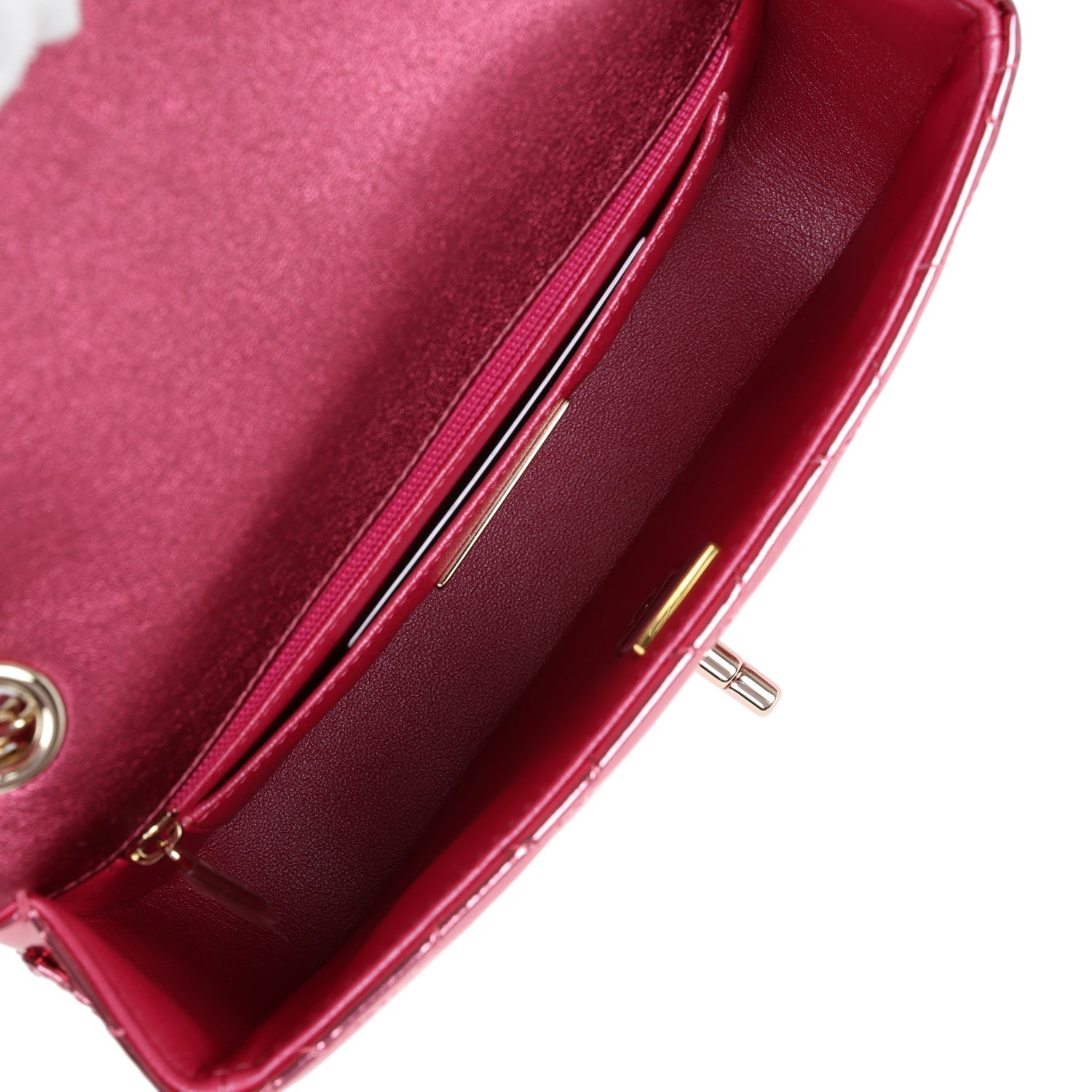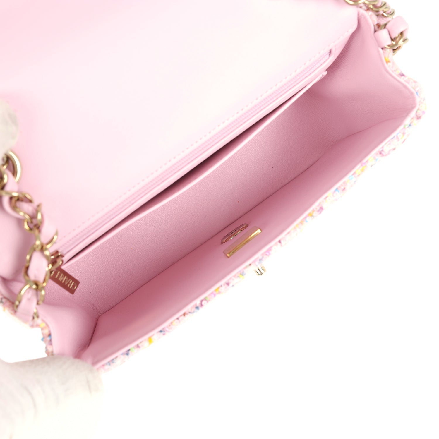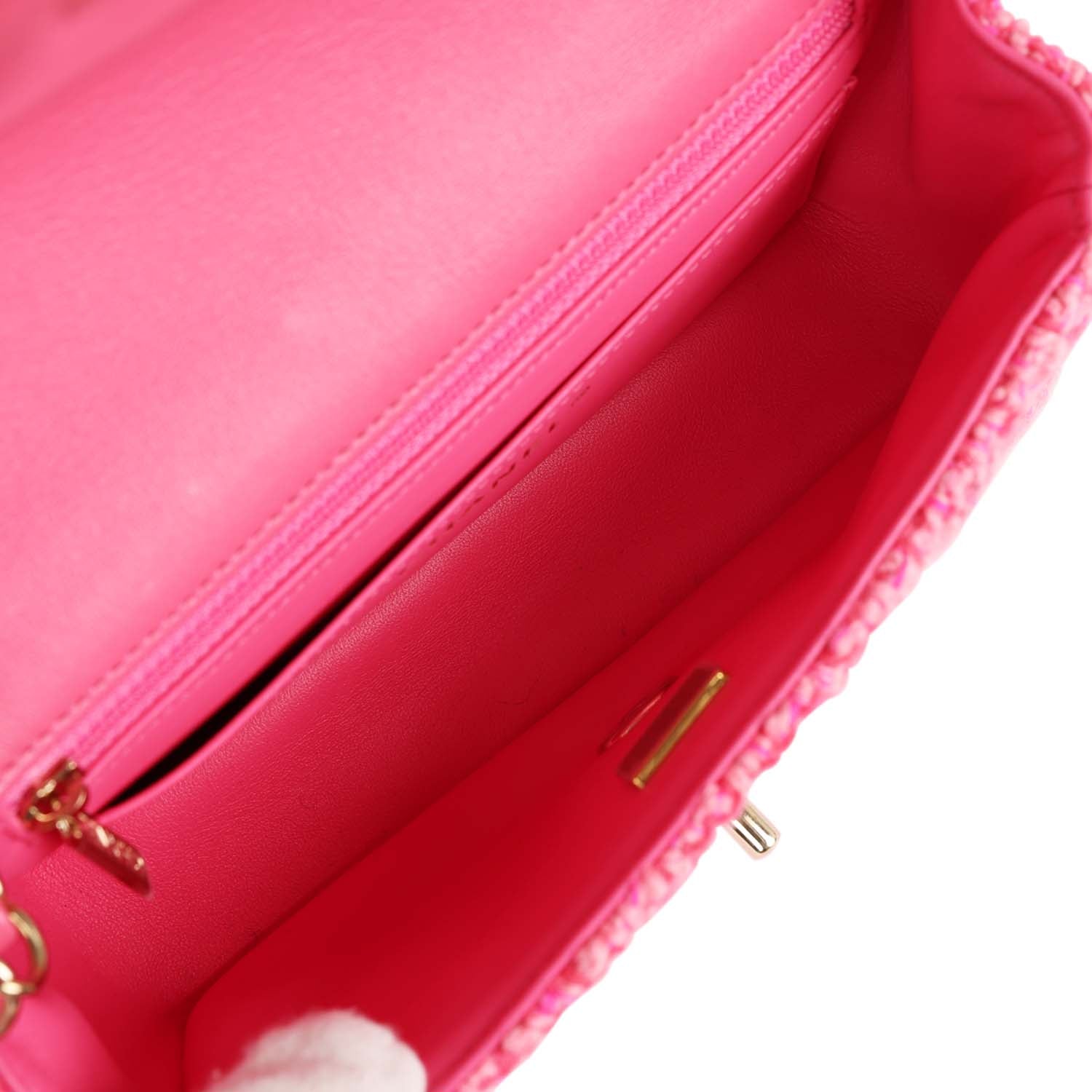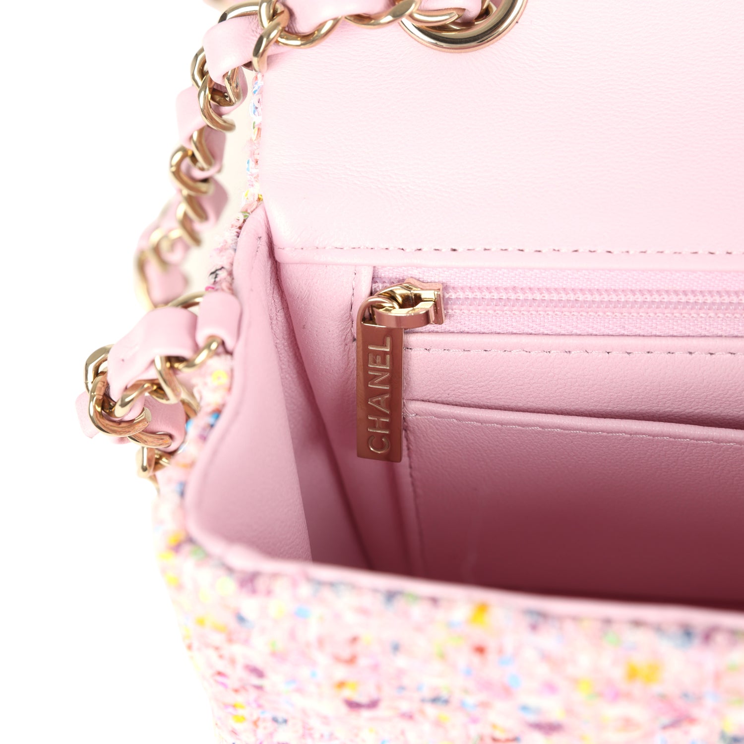 The interior is lined in Pink Metallic calfskin leather, one slip pocket with Chanel logo and one zippered pocket.