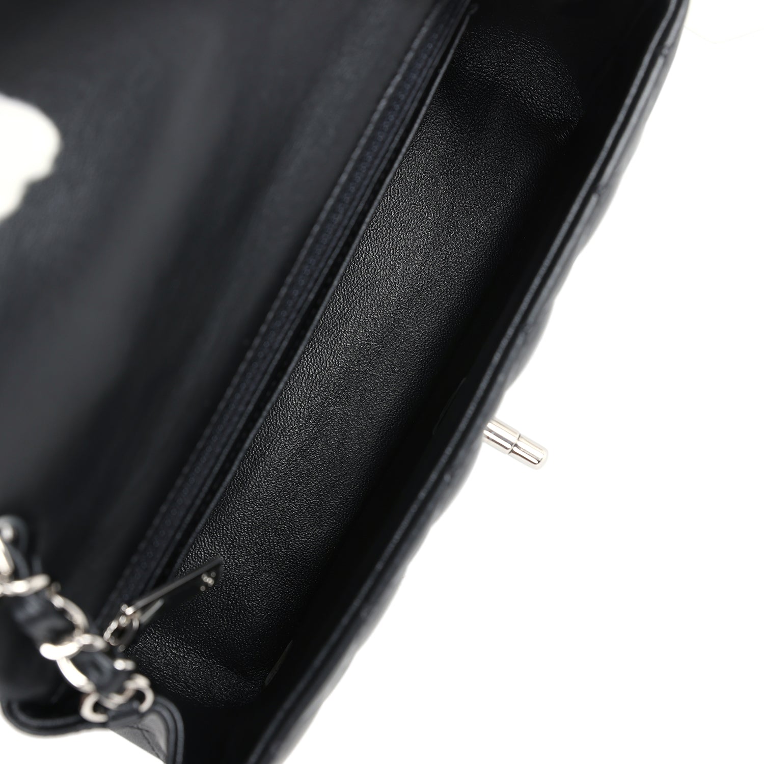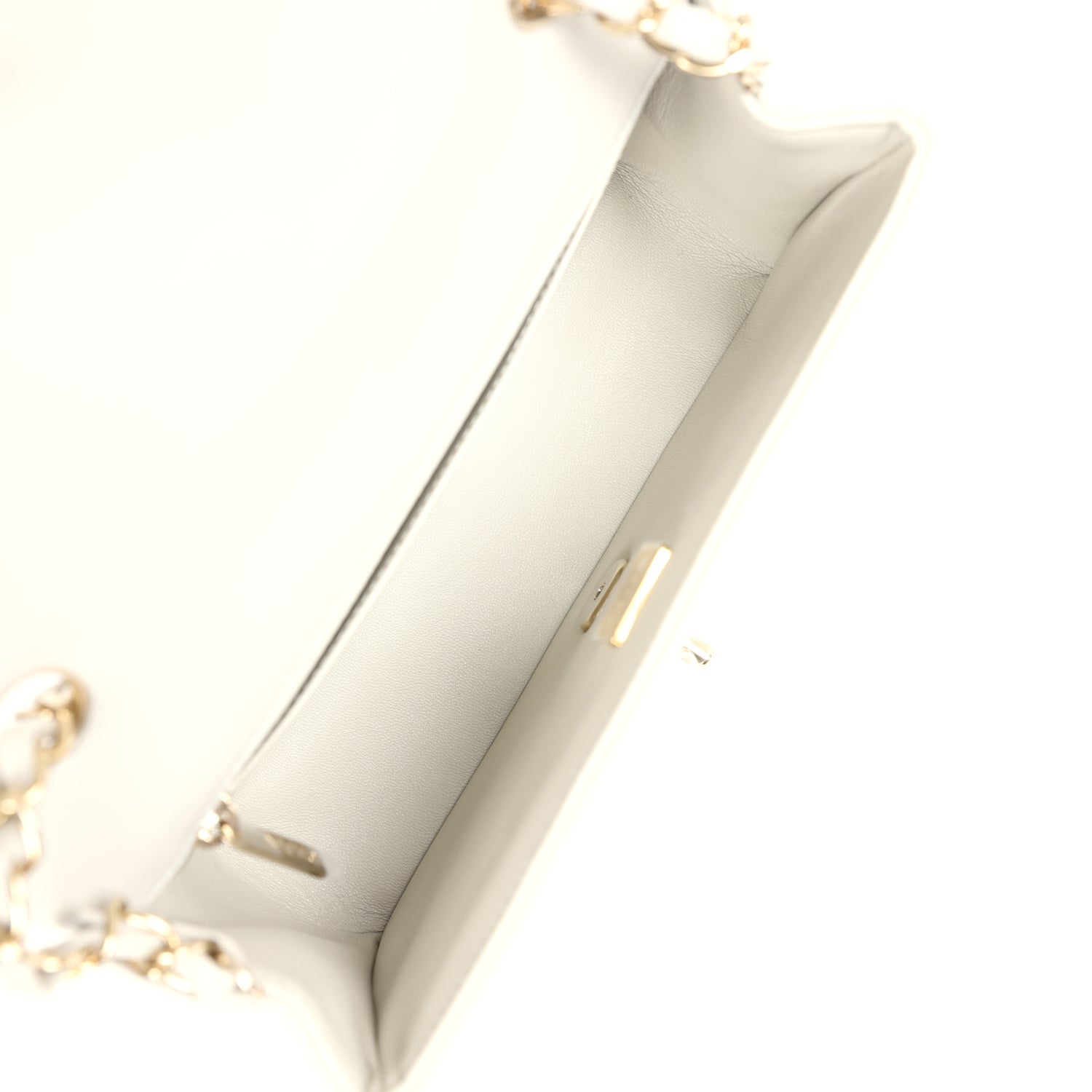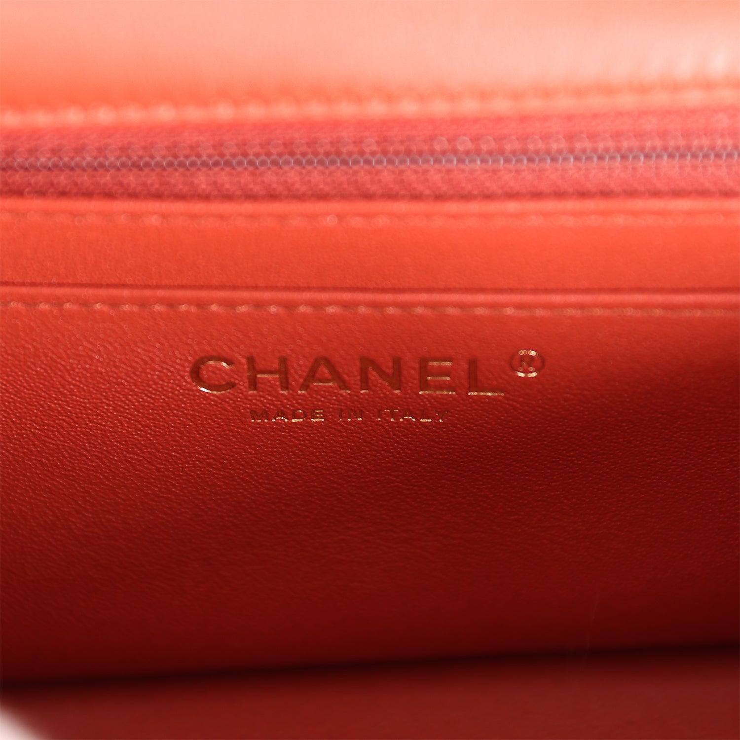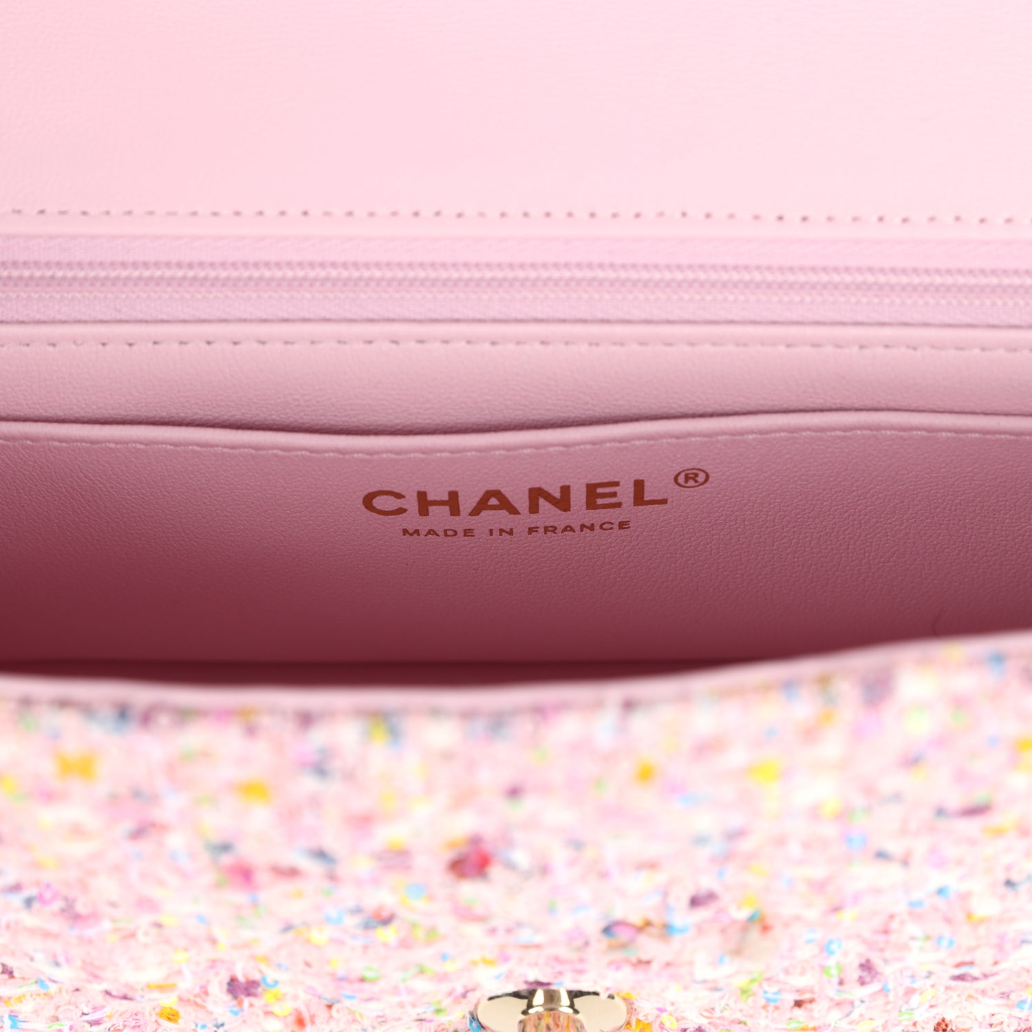 The interior is lined in Pink Metallic calfskin leather, one slip pocket with Chanel logo and one zippered pocket.