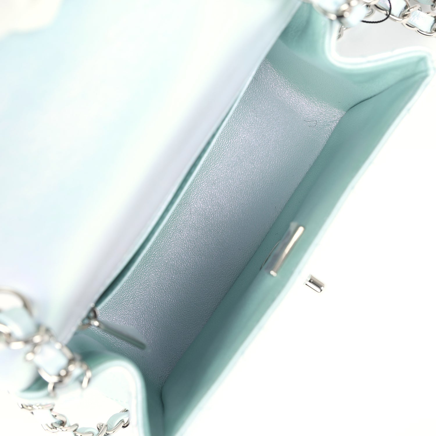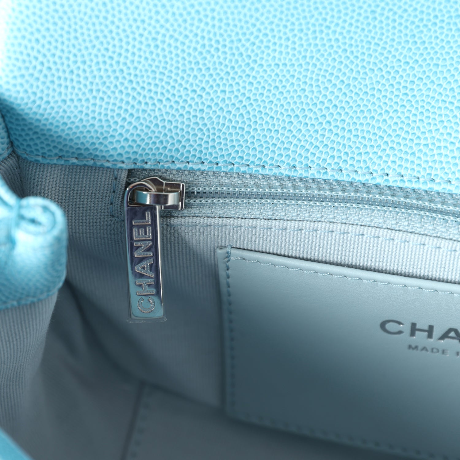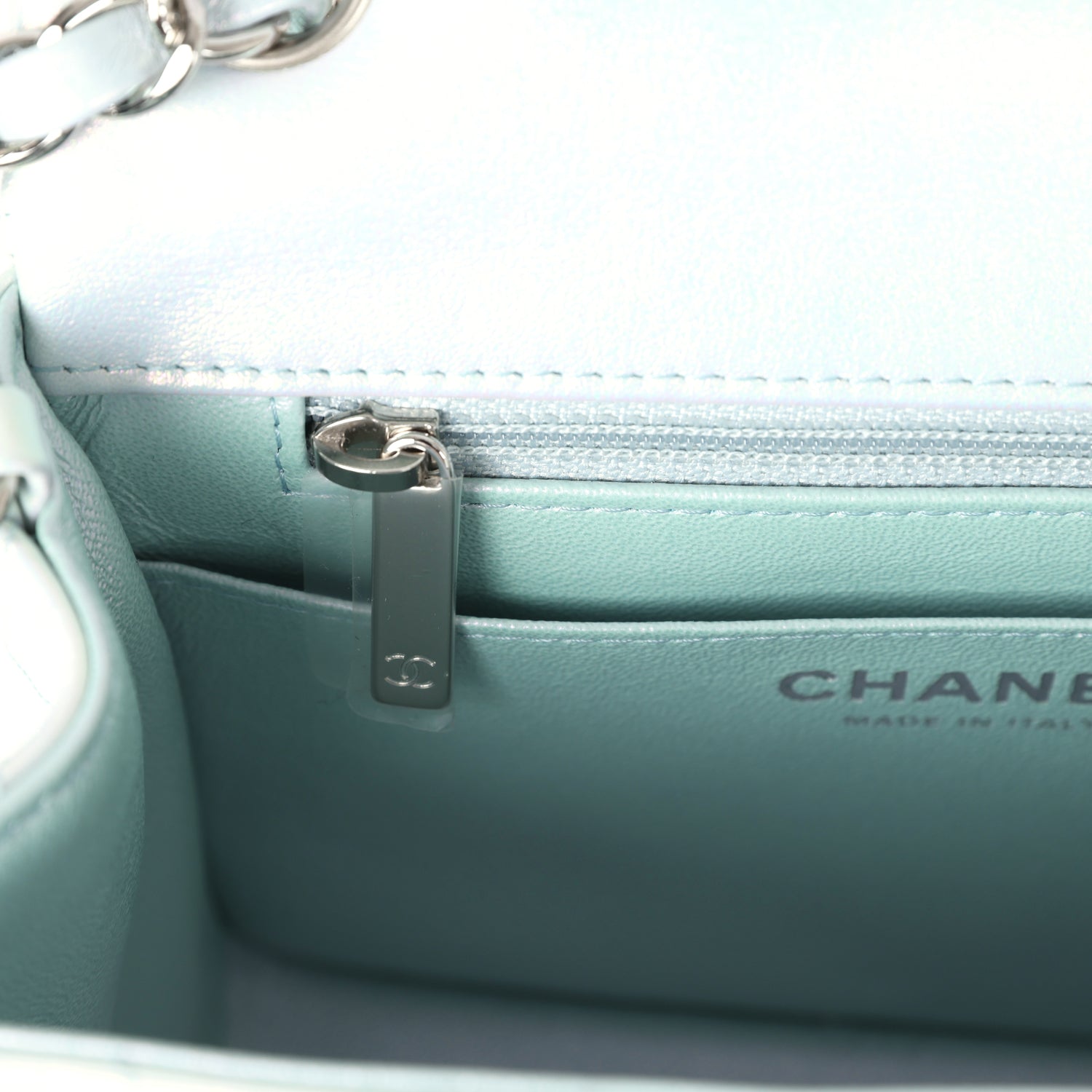 The interior is lined in blue iridescent leather and features a zipper pocket with Chanel pull and an open pocket below.