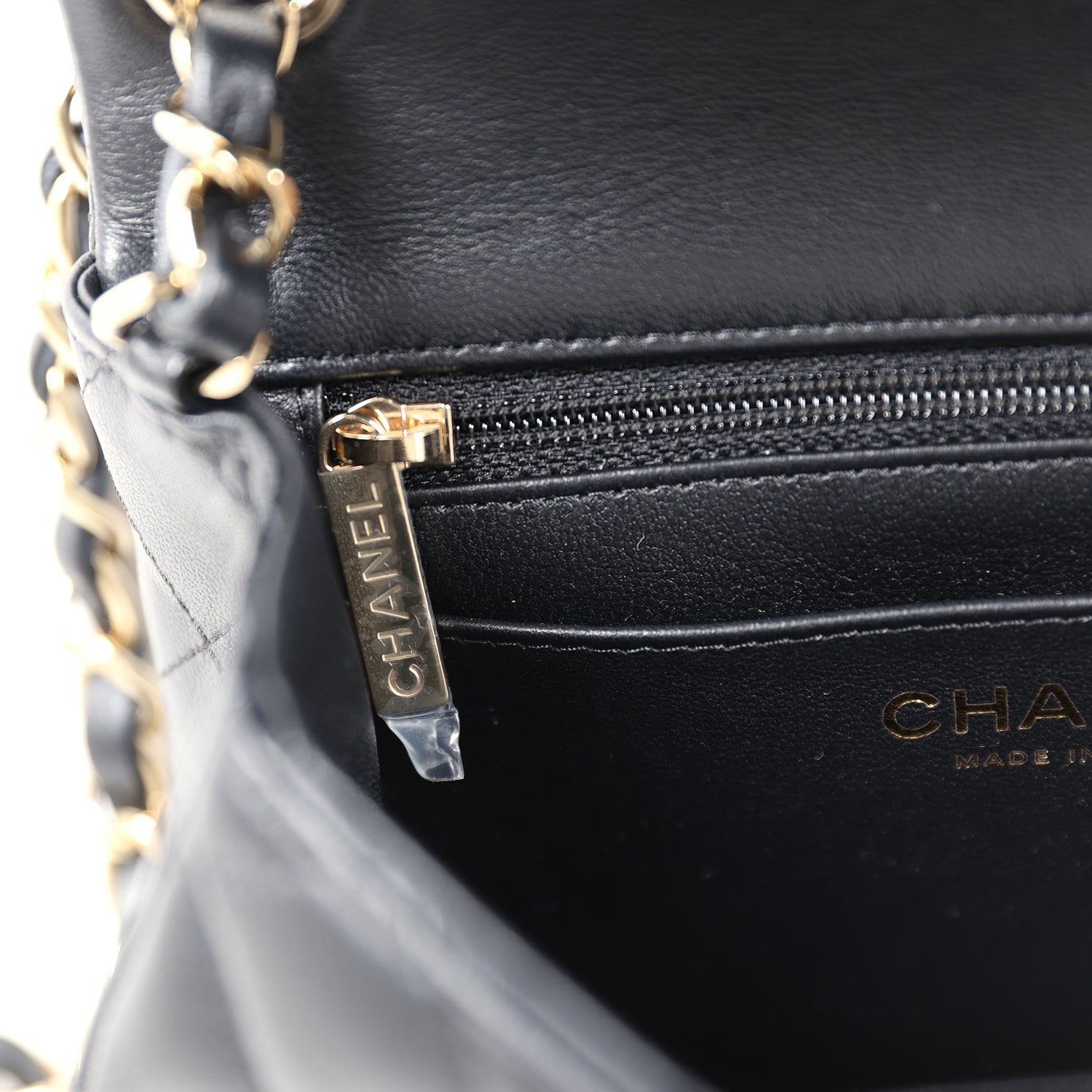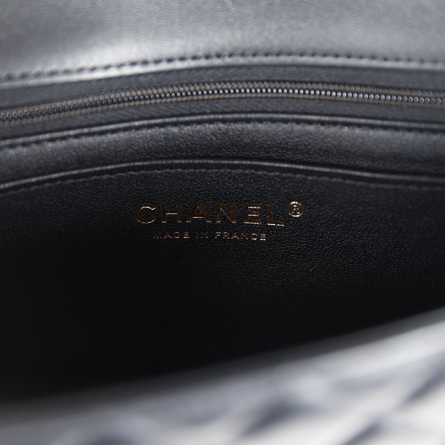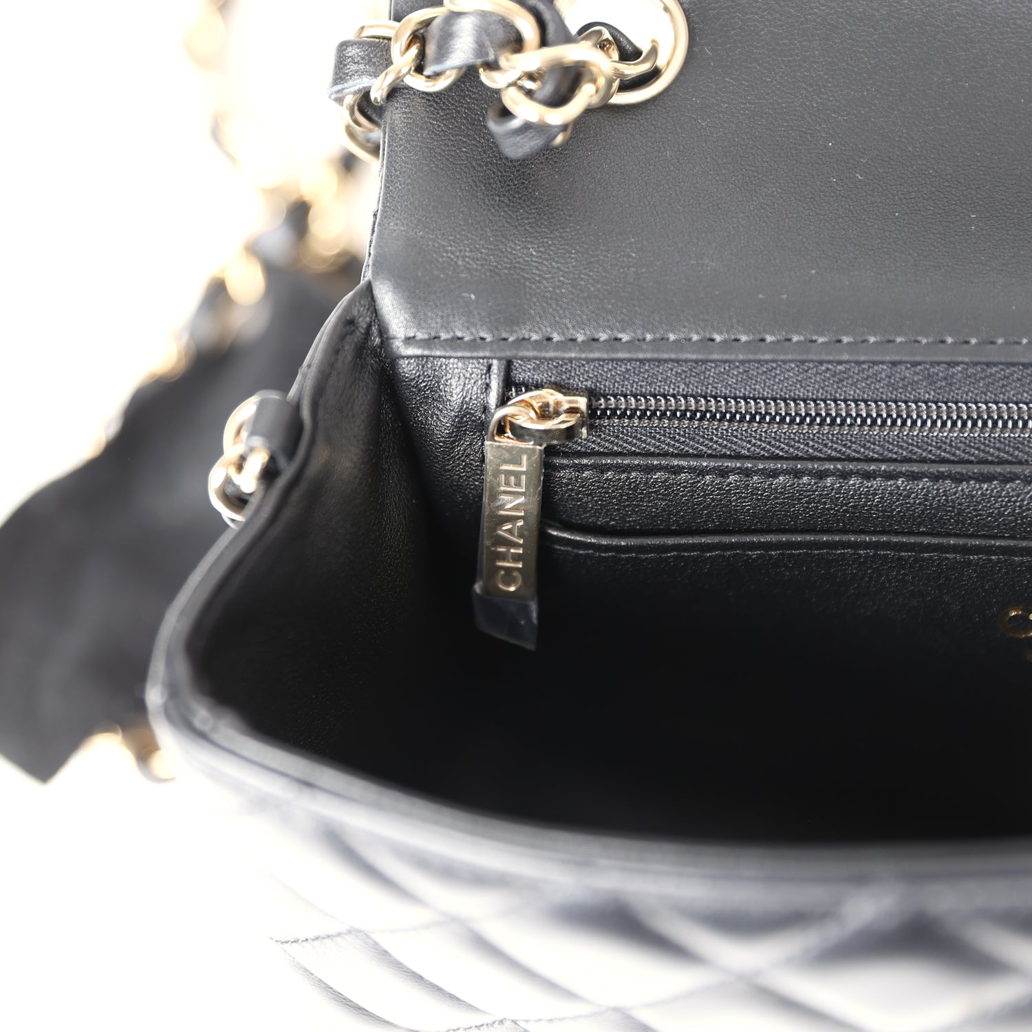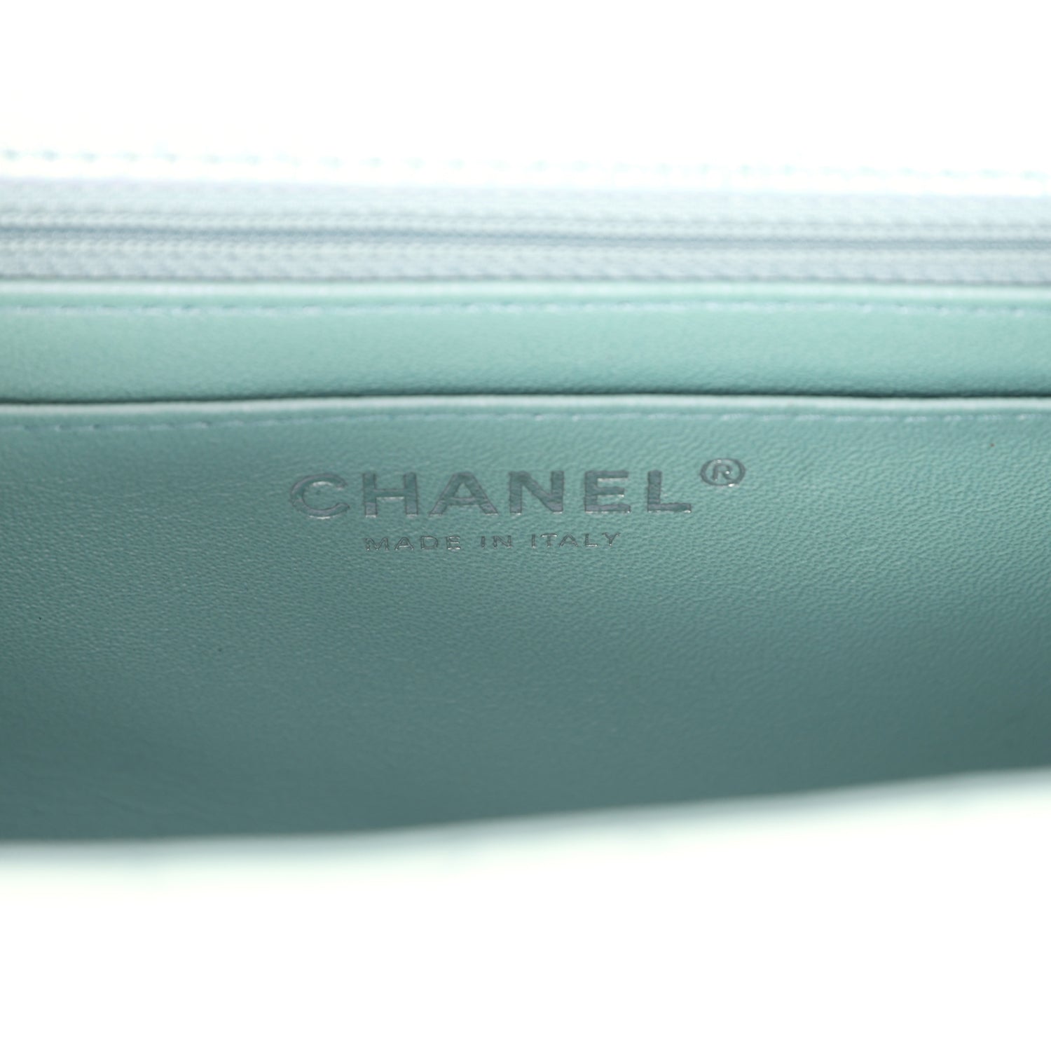 The interior is lined in blue iridescent leather and features a zipper pocket with Chanel pull and an open pocket below.