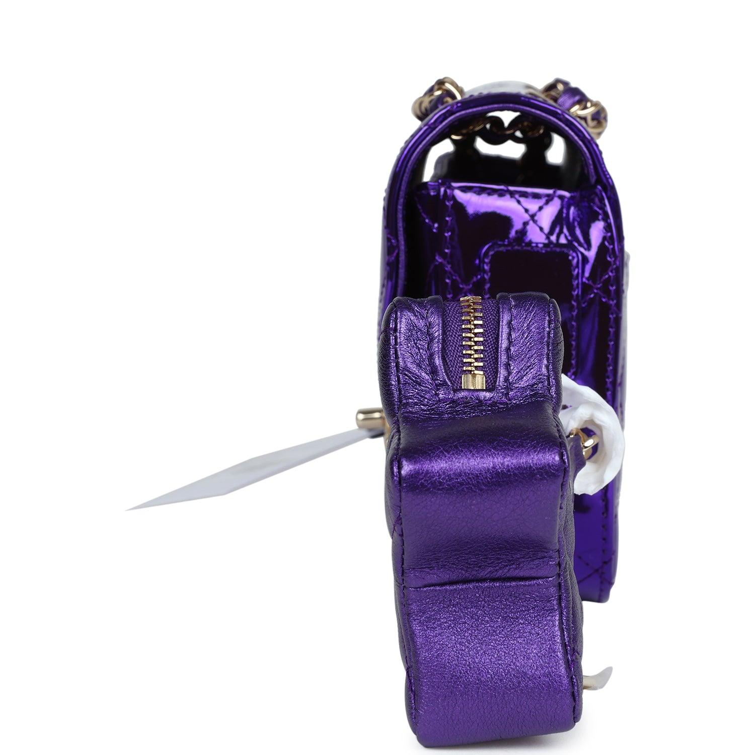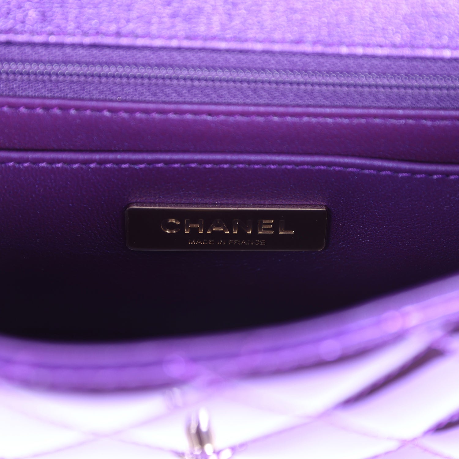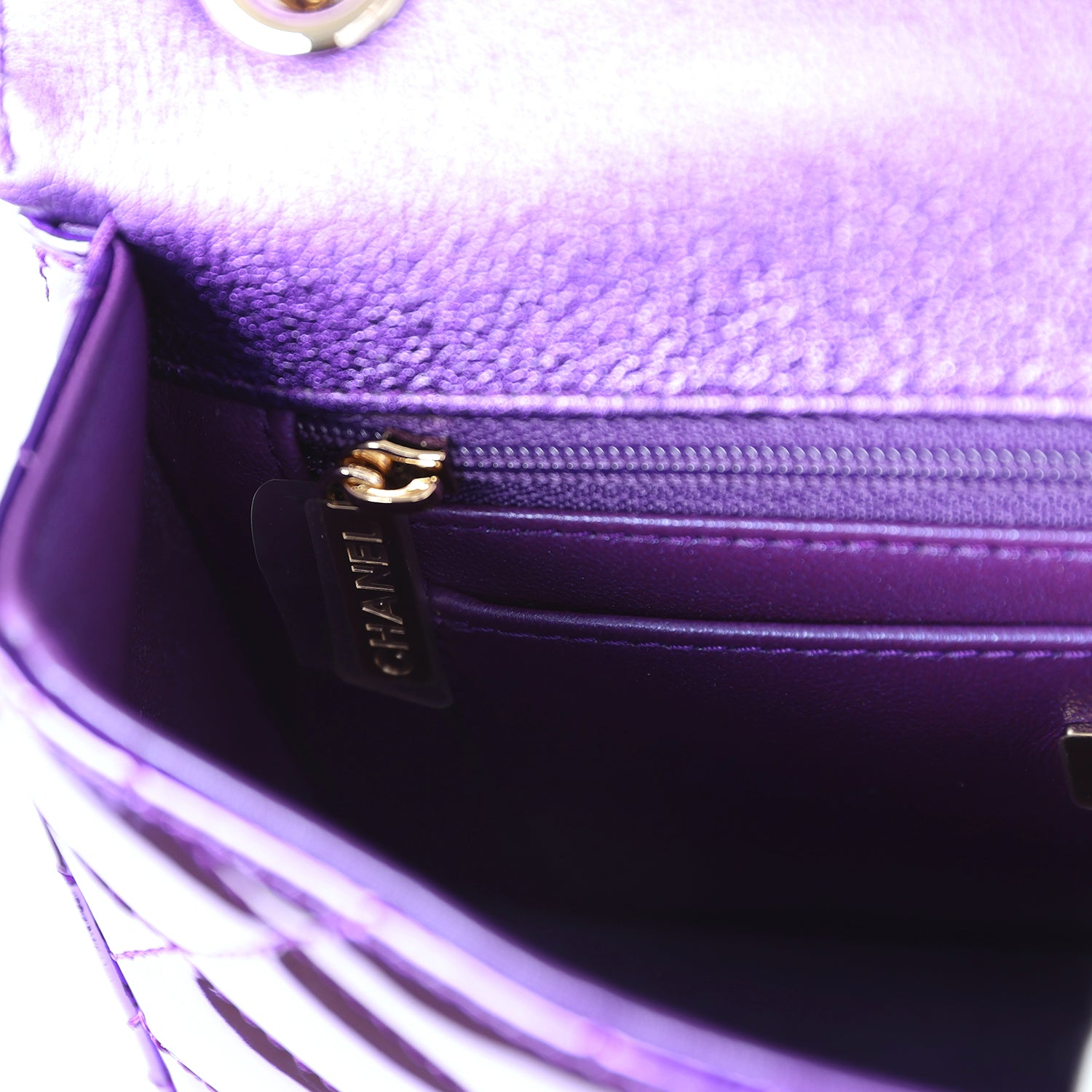 The interior is lined in Purple Metallic calfskin leather, one slip pocket with Chanel logo and one zippered pocket.