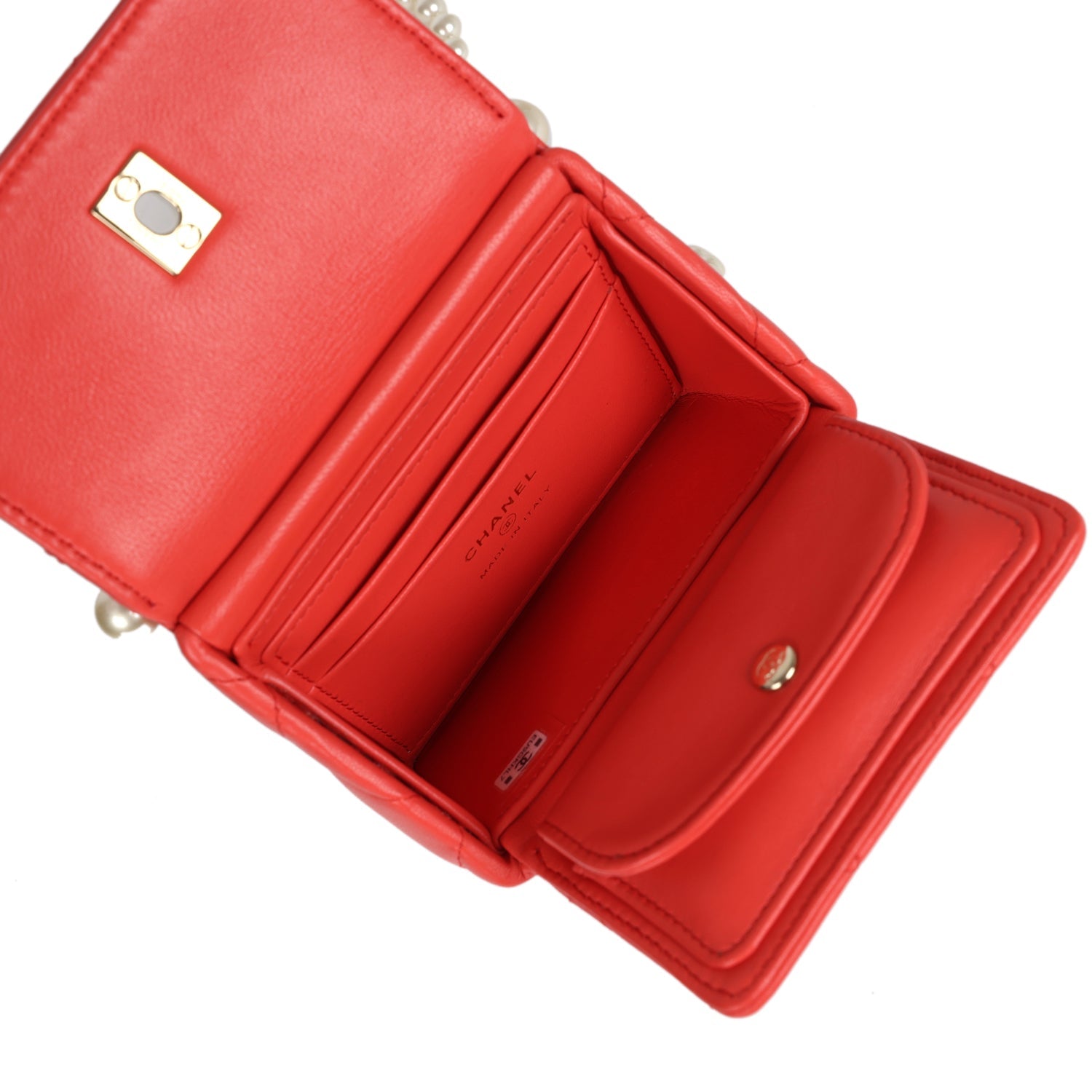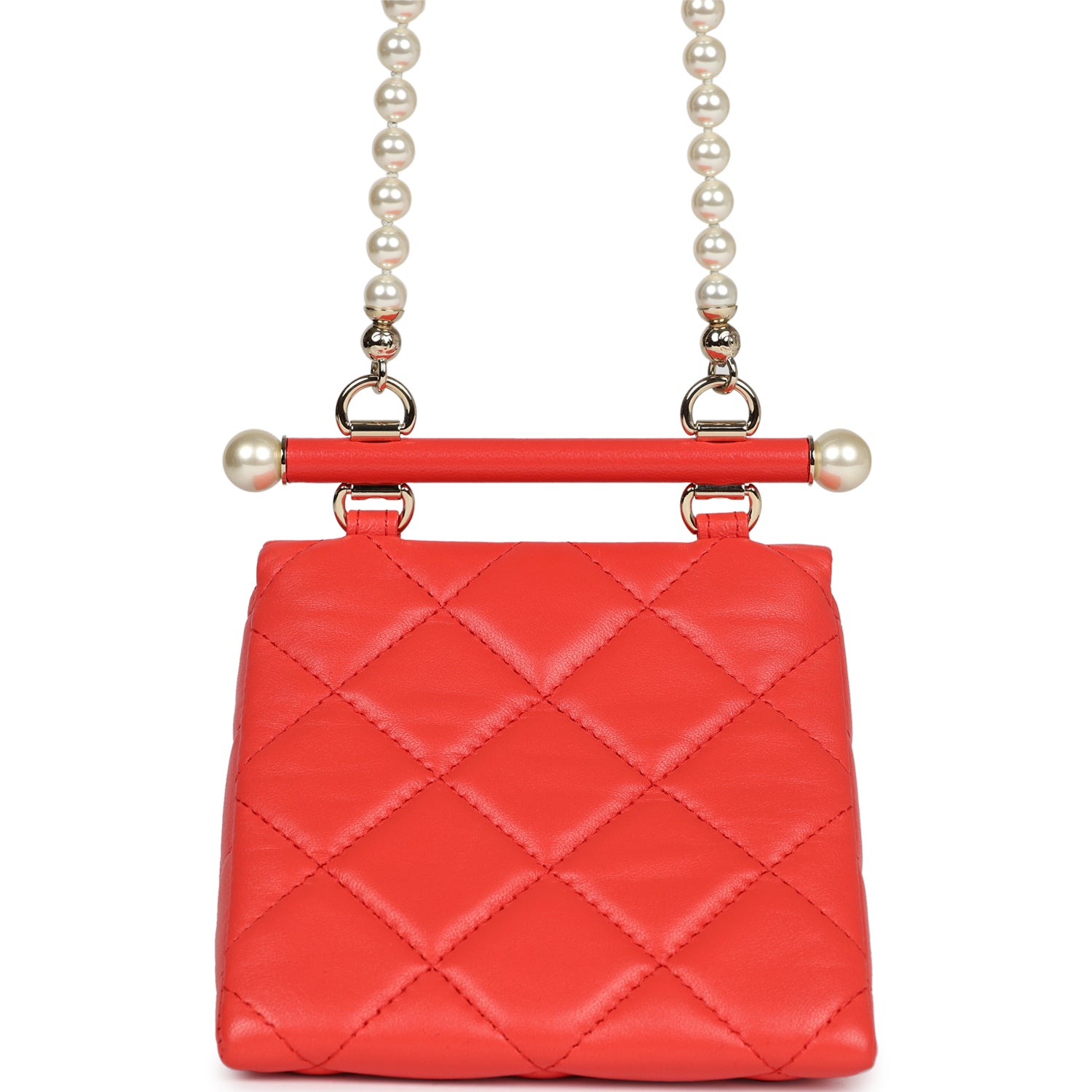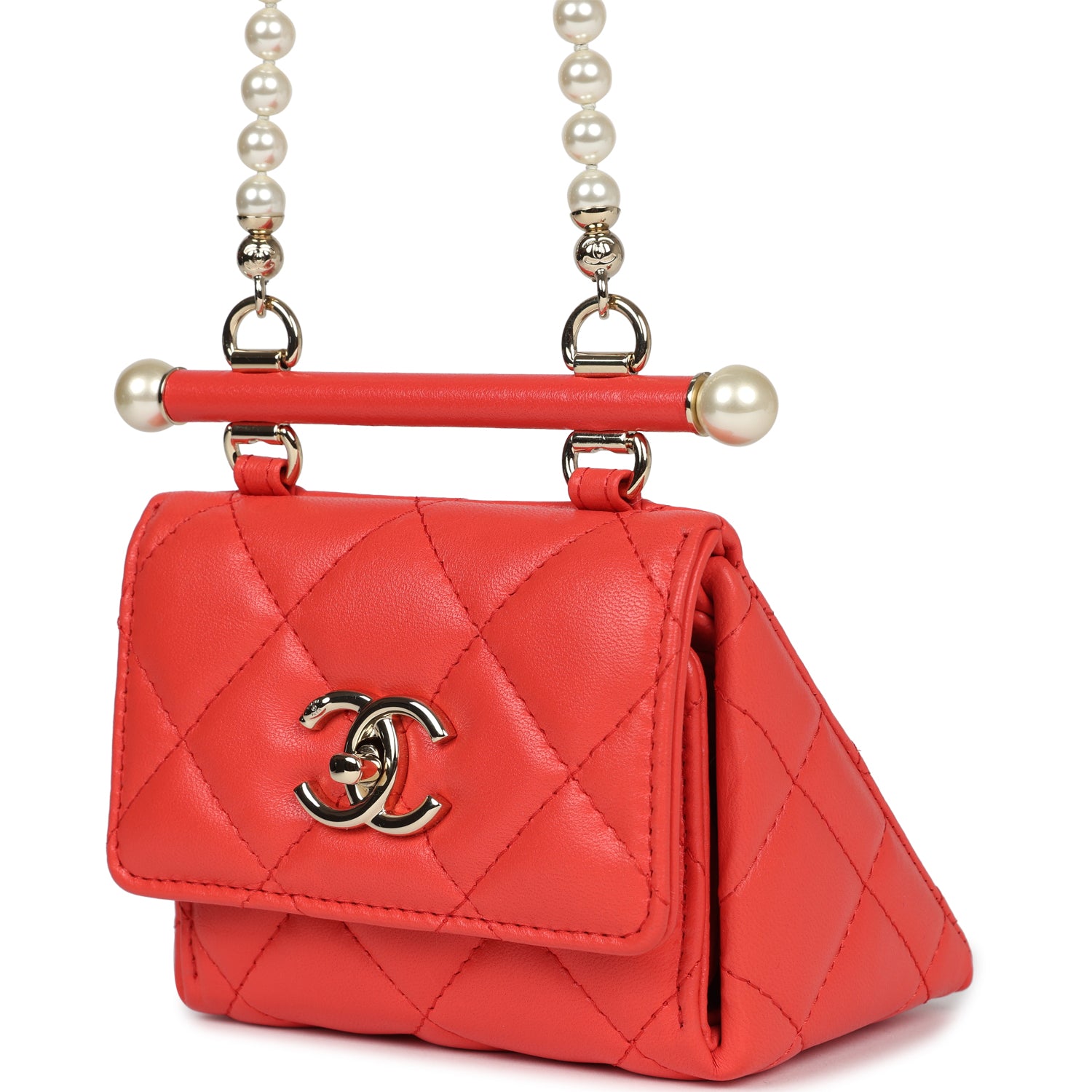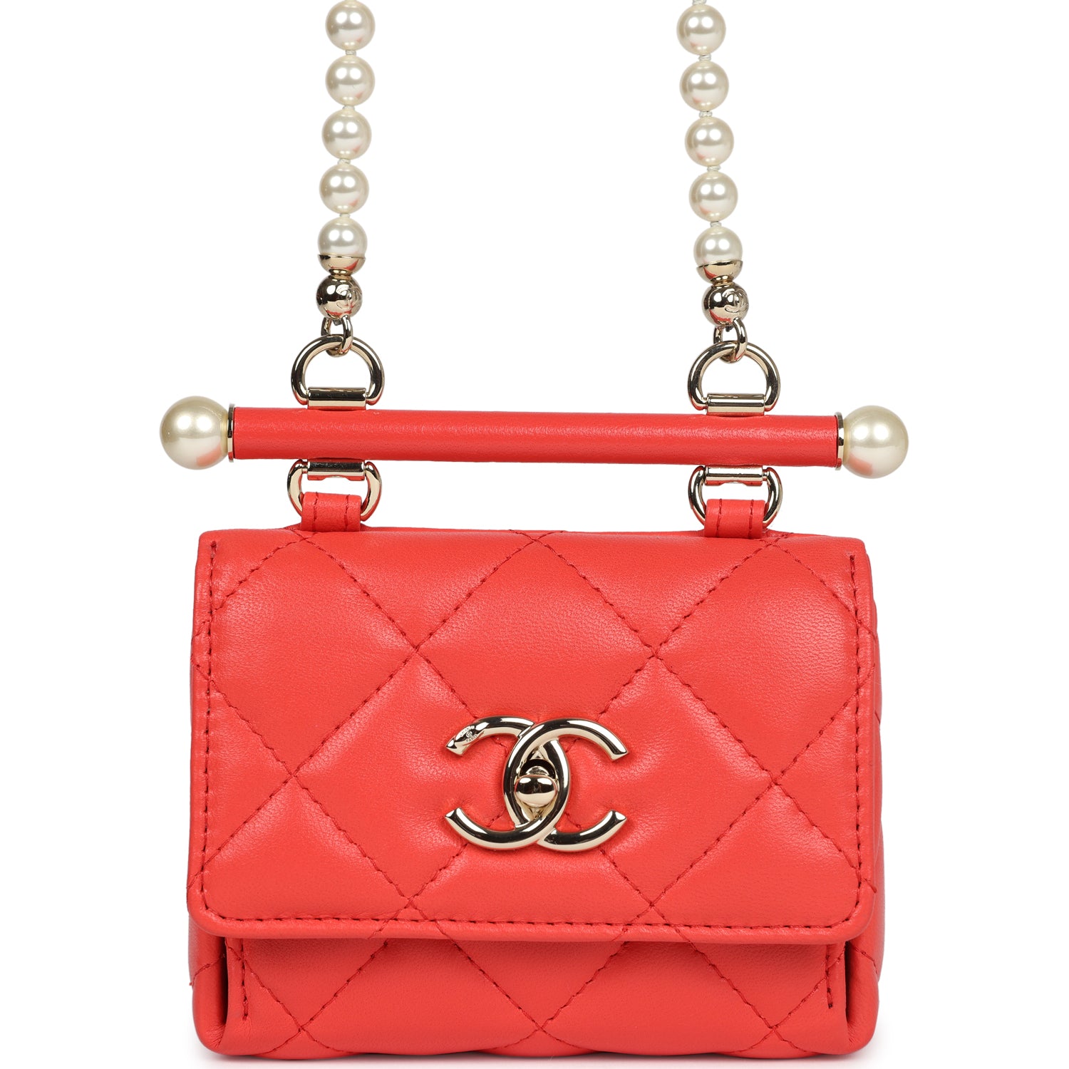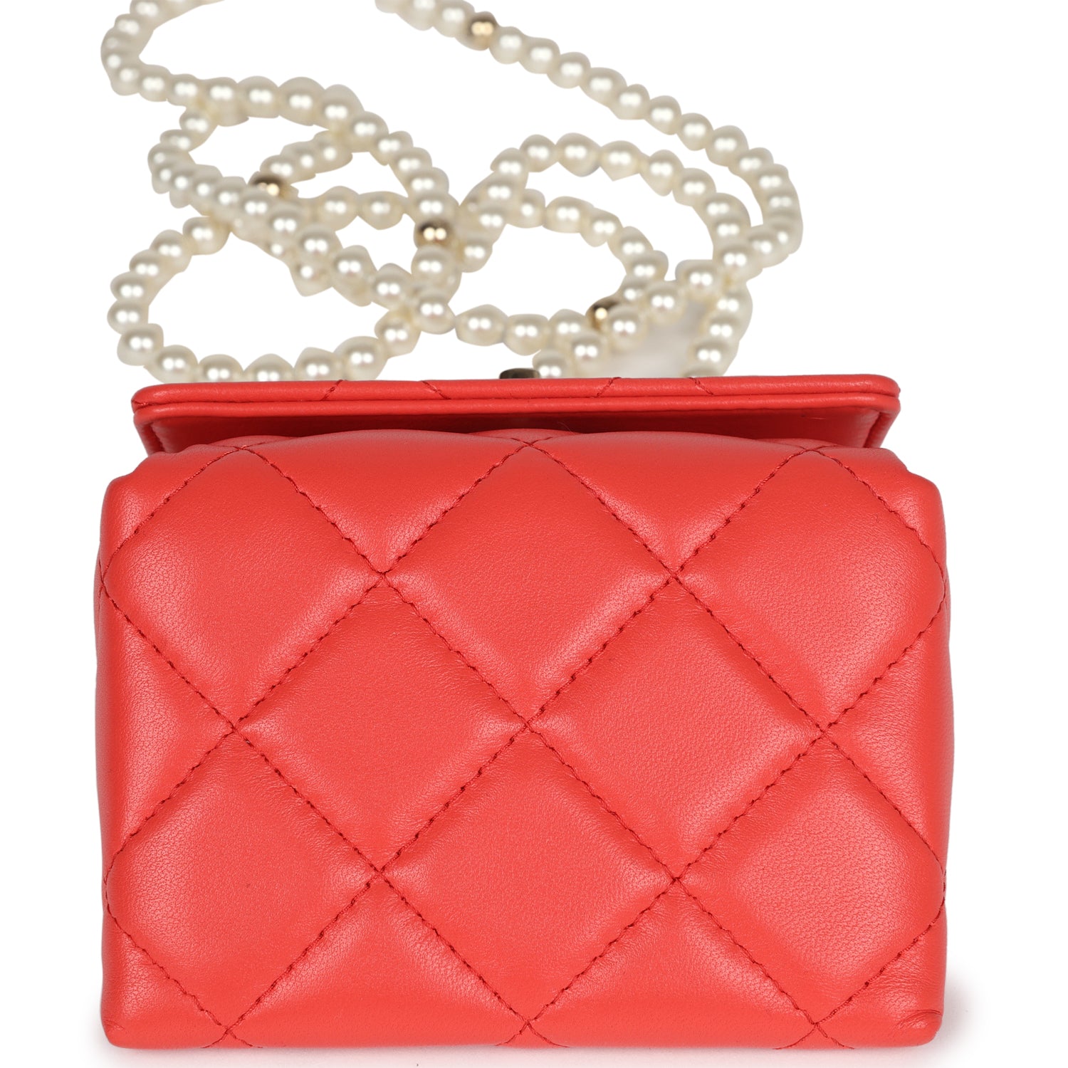 Regular price $1,960.00 Sale price $450.00 Save $1,510.00This Chanel Mini Clutch with pearl chain is in red lambskin leather with light gold hardware and faux pearls, featuring a geometric shaped mini clutch, signature quilt, a front CC turnlock closure, and a faux pearl and light gold tone shoulder strap attached to a bar.