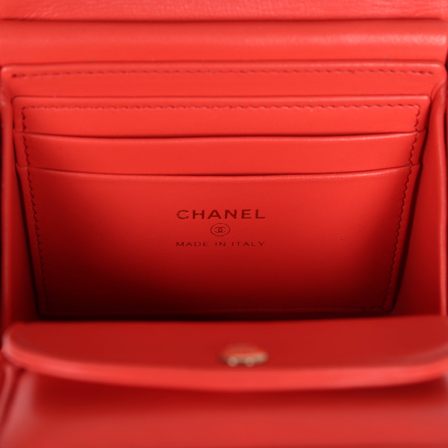 The interior is lined in red lambskin leather and has one small main compartment, two small credit card pockets, and a small snap pocket with a removable mirror.
