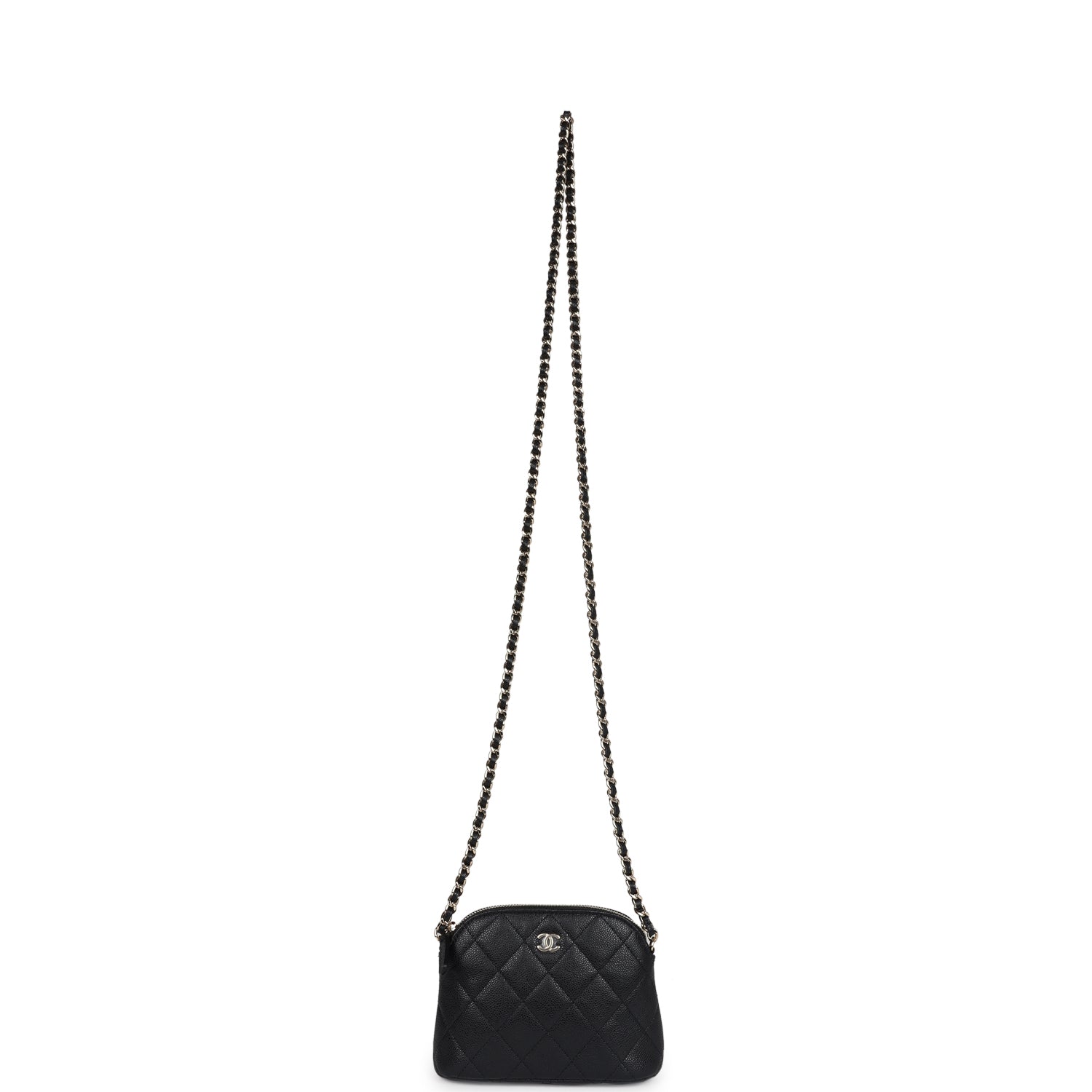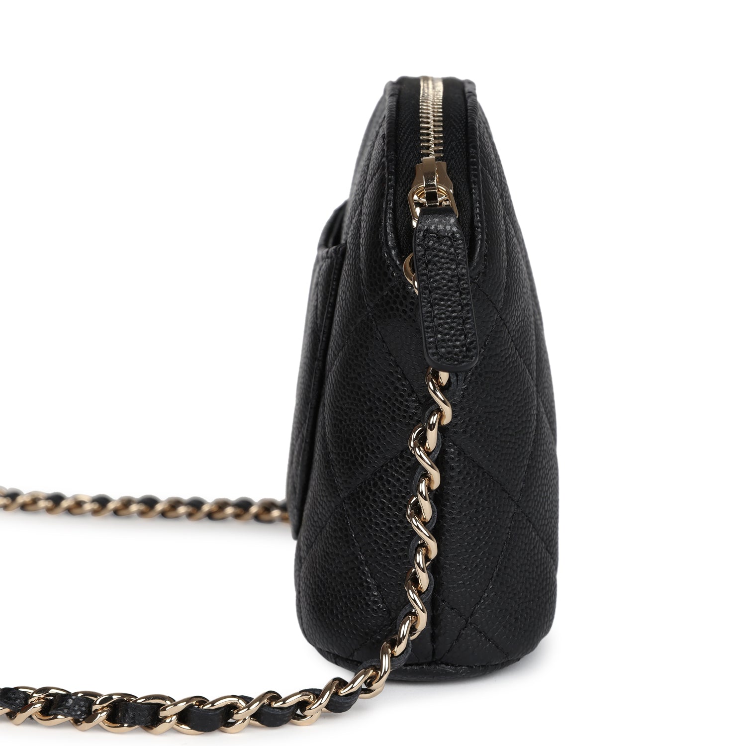 Regular price $1,900.00 Sale price $450.00 Save $1,450.00This Chanel Mini Clutch with Chain crossbody bag is in black caviar leather with light gold hardware, featuring signature diamond quilt, a light gold CC logo on front of bag, a zipper closure, halfmoon back pocket, and a single Interwoven black leather and light gold tone chain shoulder/crossbody strap.