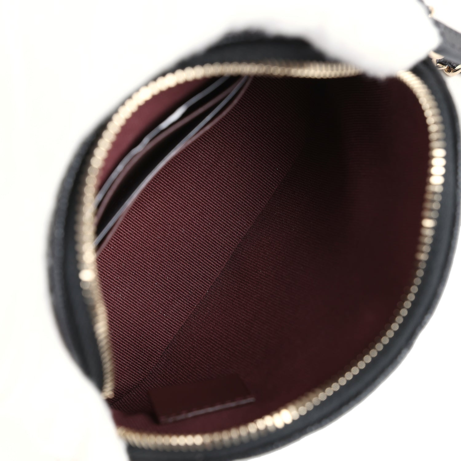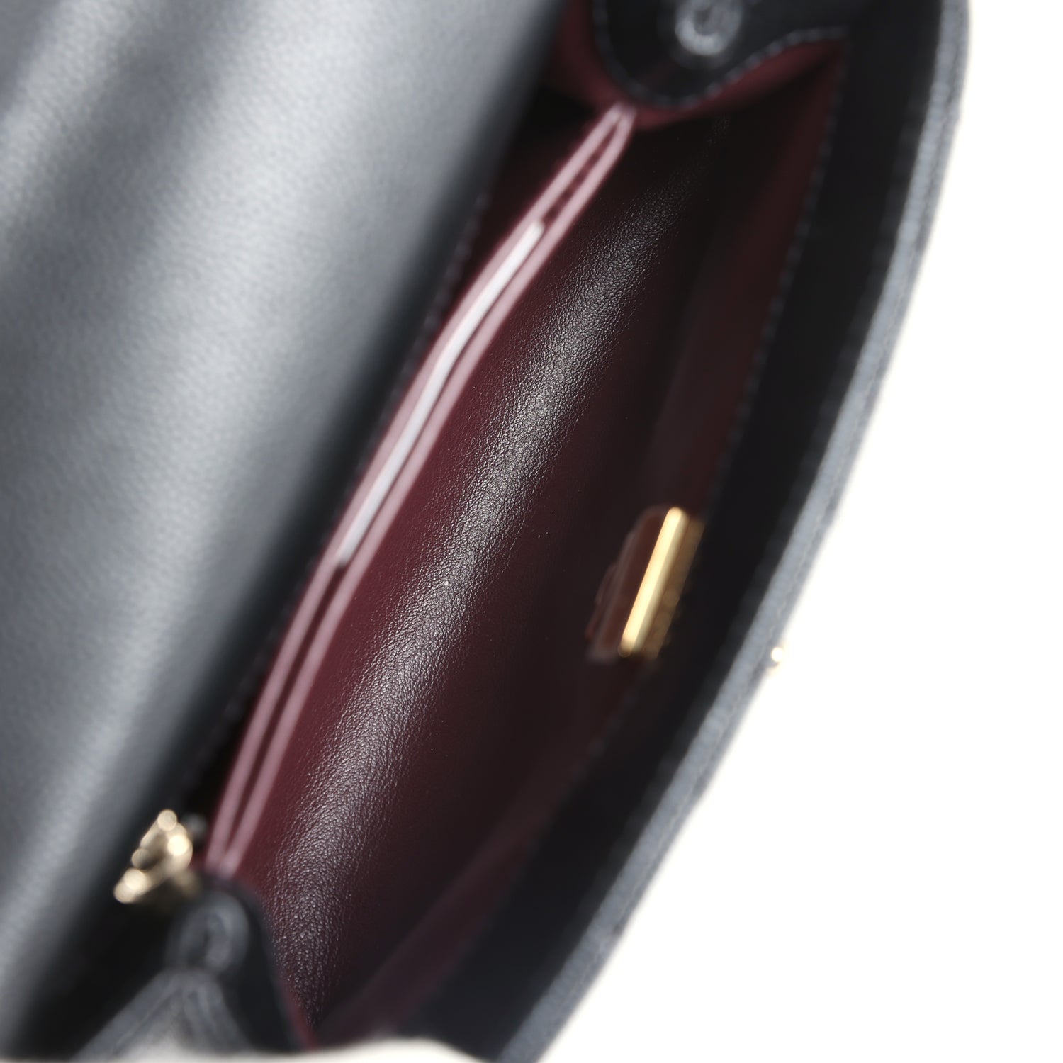 The interior is lined in burgundy grossgrain fabric and has two small interior slit pockets.