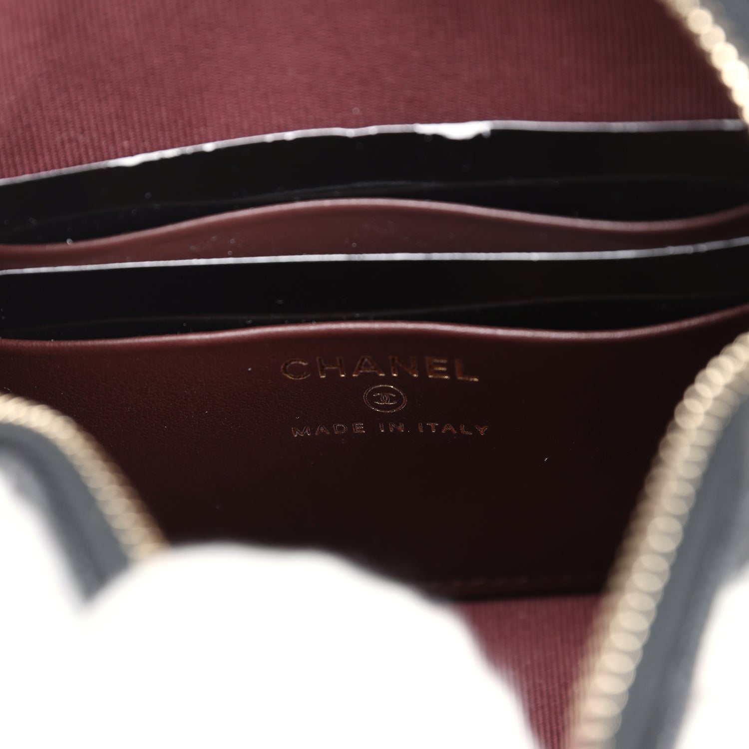 The interior is lined in maroon leather and features a zipper pocket with Chanel pull and an open pocket below.